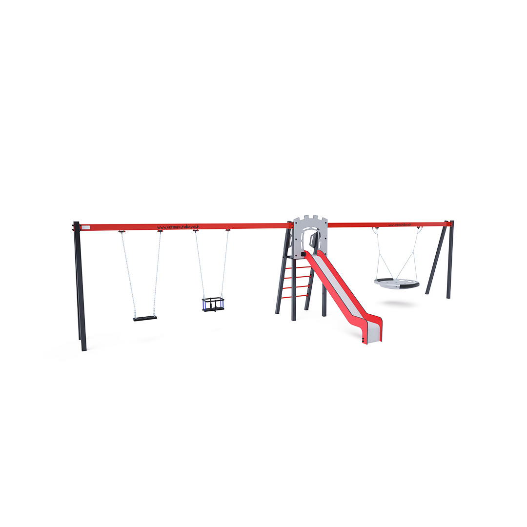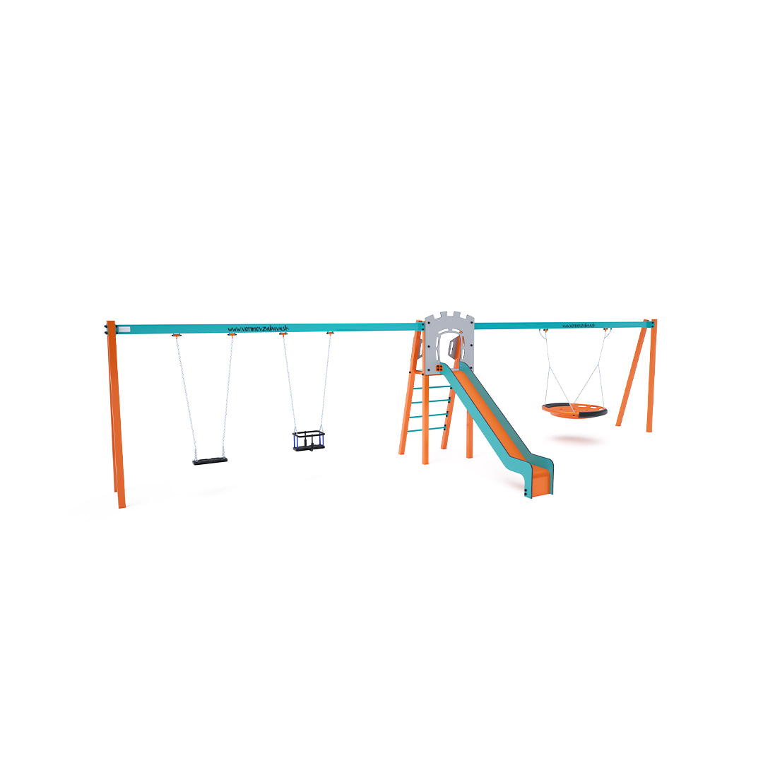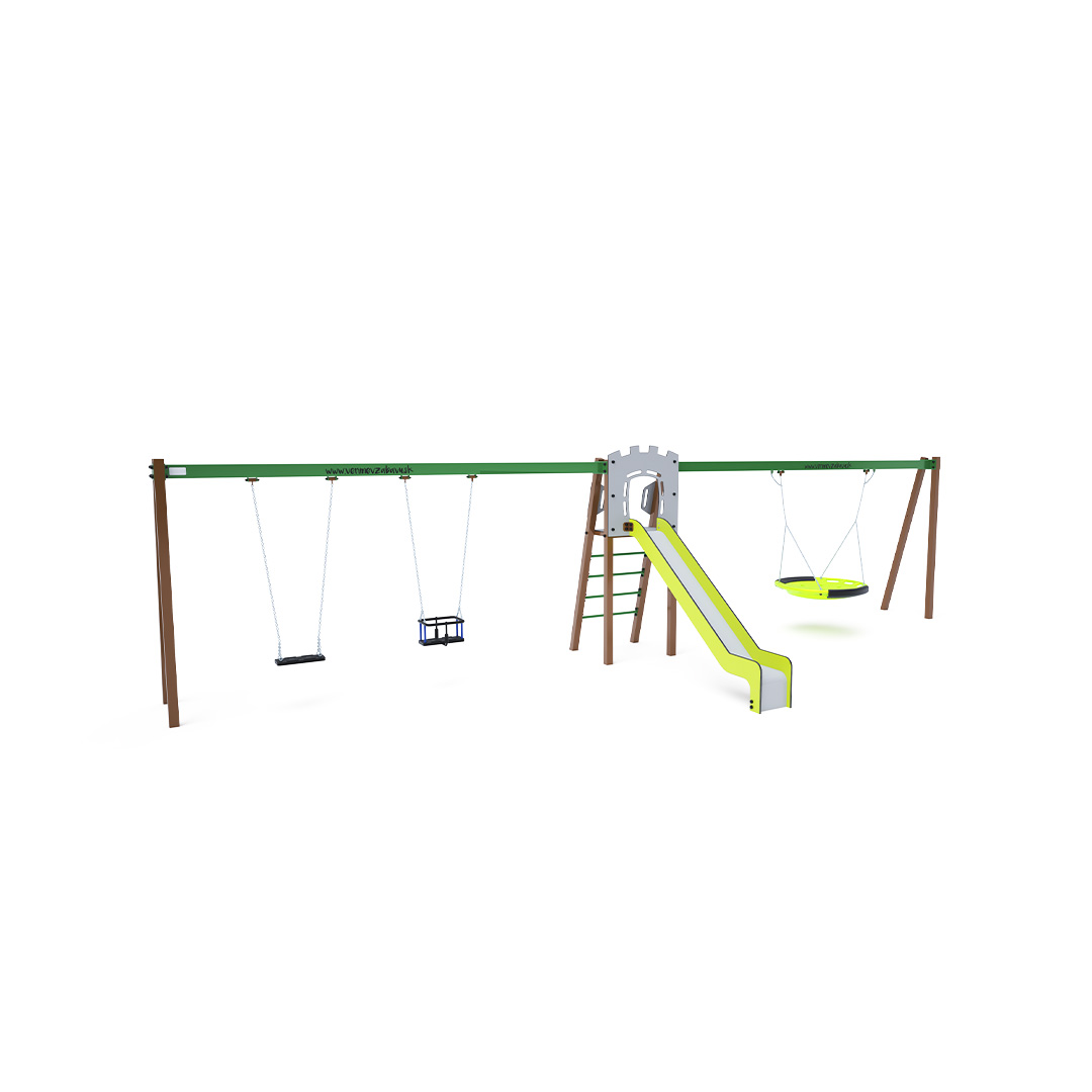 Certifikovaná bezúdržbová věž ve tvaru A s rebrinovým výlezem a skluzavkou, doplněná dvěma visícími houpačkami. Na jedné straně jsou klasický a dětský sedák, na druhé straně houpačkové hnízdo. Dětský sedák pro dítě obsahuje ohrádku s příčkou mezi nohama dítěte, která zabraňuje sesunutí nebo pádu dítěte. Současně si dítě může opřít záda. Houpačkové hnízdo je vhodné pro houpání malých dětí vleže nebo pro více dětí najednou. Hnízdo má bezpečnostní závěs s pojistnou řetízkou.