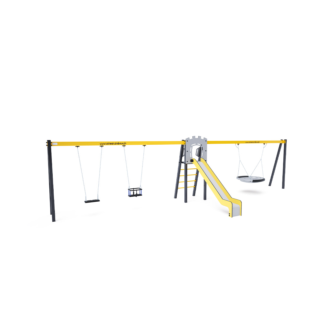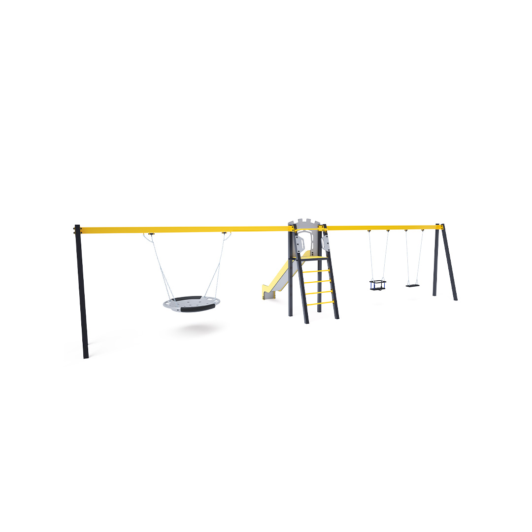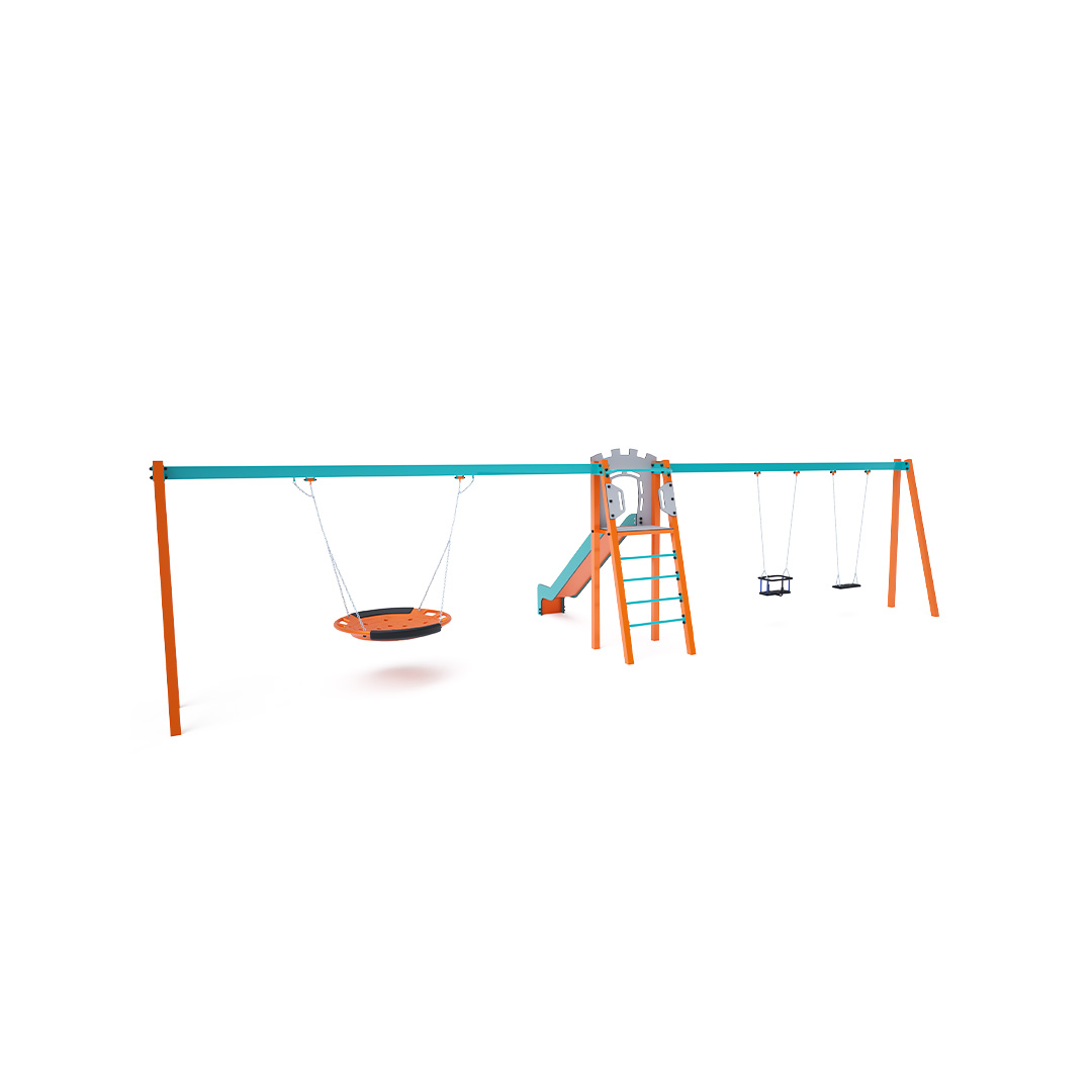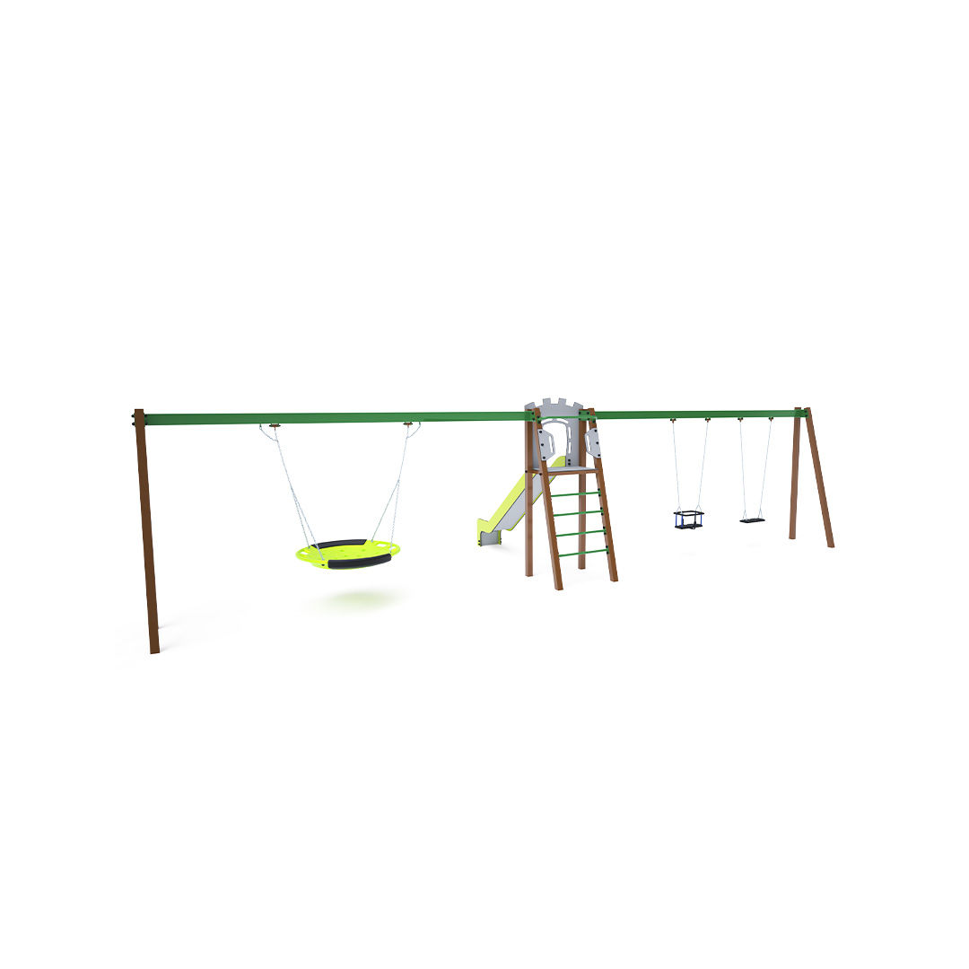 Certifikovaná bezúdržbová věž ve tvaru A s rebrinovým výlezem a skluzavkou, doplněná dvěma visícími houpačkami. Na jedné straně jsou klasický a dětský sedák, na druhé straně houpačkové hnízdo. Dětský sedák pro dítě obsahuje ohrádku s příčkou mezi nohama dítěte, která zabraňuje sesunutí nebo pádu dítěte. Současně si dítě může opřít záda. Houpačkové hnízdo je vhodné pro houpání malých dětí vleže nebo pro více dětí najednou. Hnízdo má bezpečnostní závěs s pojistnou řetízkou.