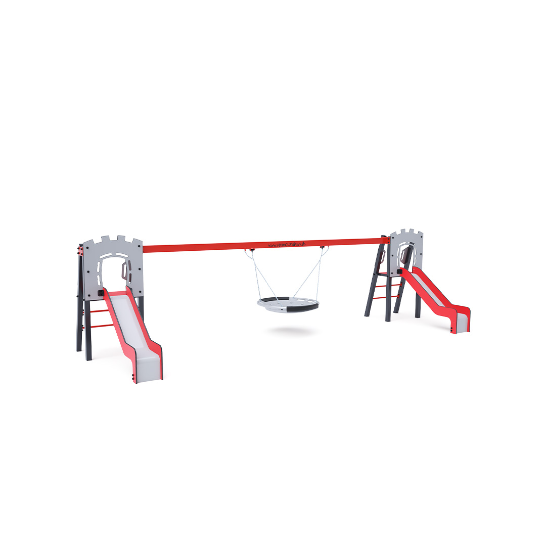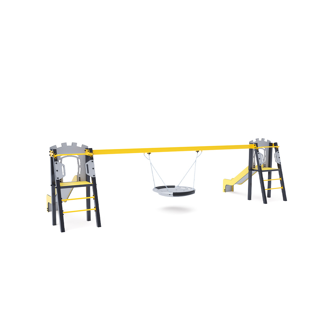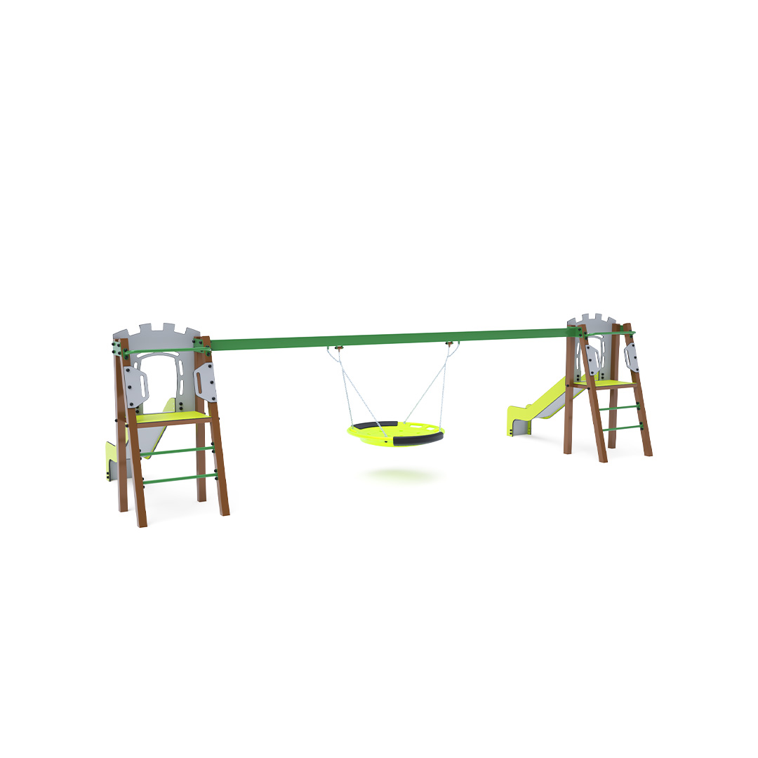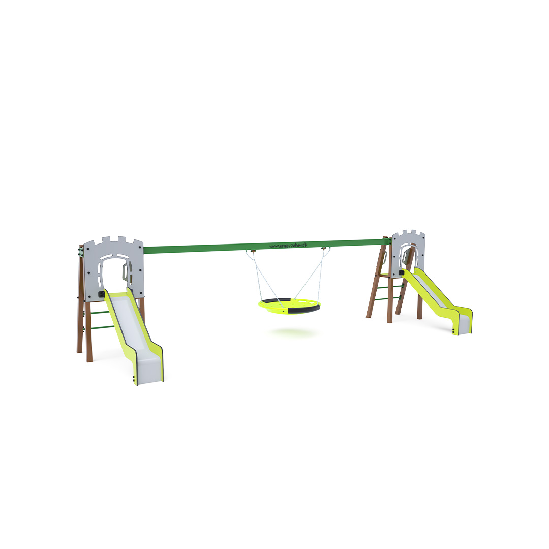 Dvě certifikované bezúdržbové věže ve tvaru A s žebříkovým výlezem a skluzavkou, doplněné houpadlem s houpacím hnízdem. Houpací hnízdo je vhodné pro houpačku malých dětí vleže nebo pro více dětí najednou. Hnízdo má bezpečnostní závěs s pojistnou řetízkou.