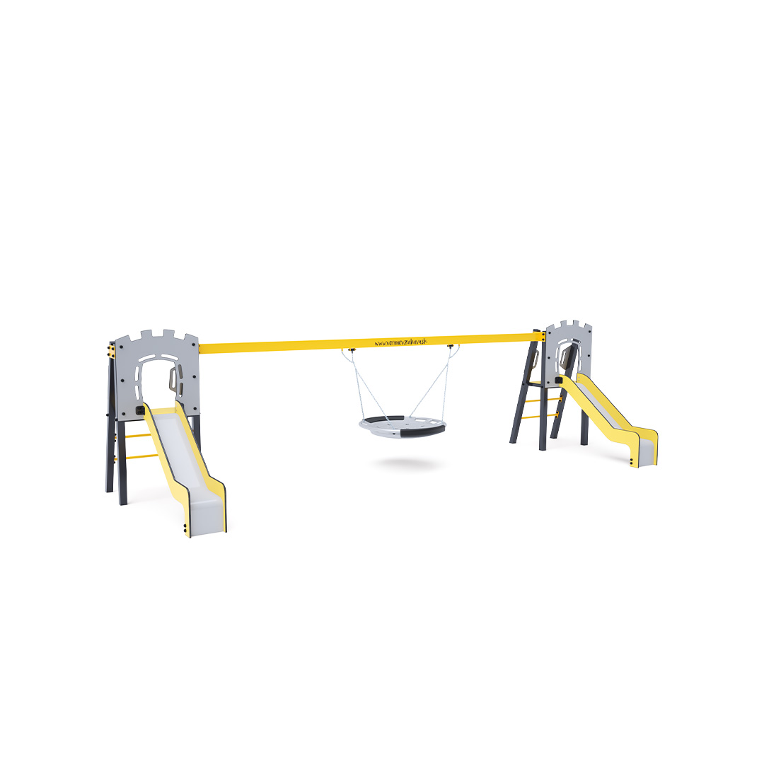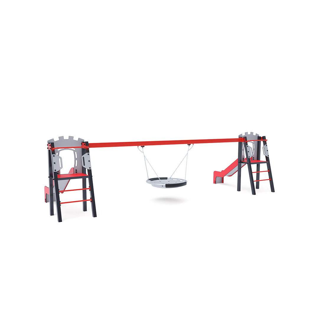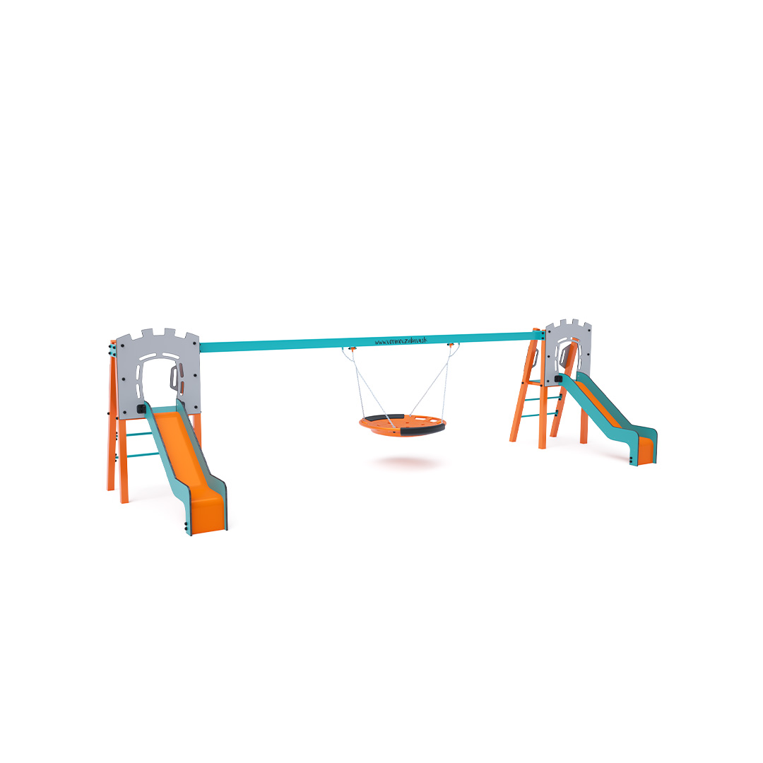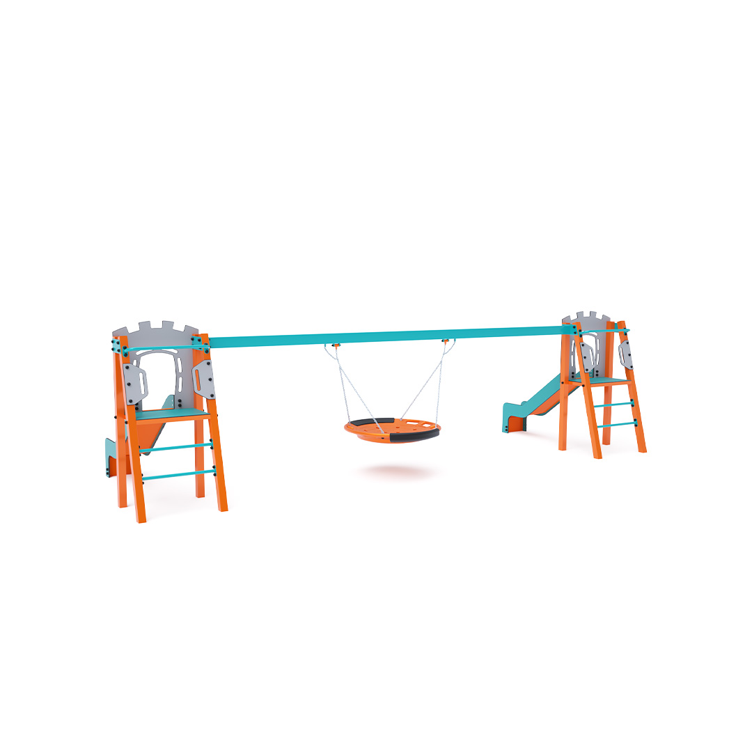 Dvě certifikované bezúdržbové věže ve tvaru A s žebříkovým výlezem a skluzavkou, doplněné houpadlem s houpacím hnízdem. Houpací hnízdo je vhodné pro houpačku malých dětí vleže nebo pro více dětí najednou. Hnízdo má bezpečnostní závěs s pojistnou řetízkou.