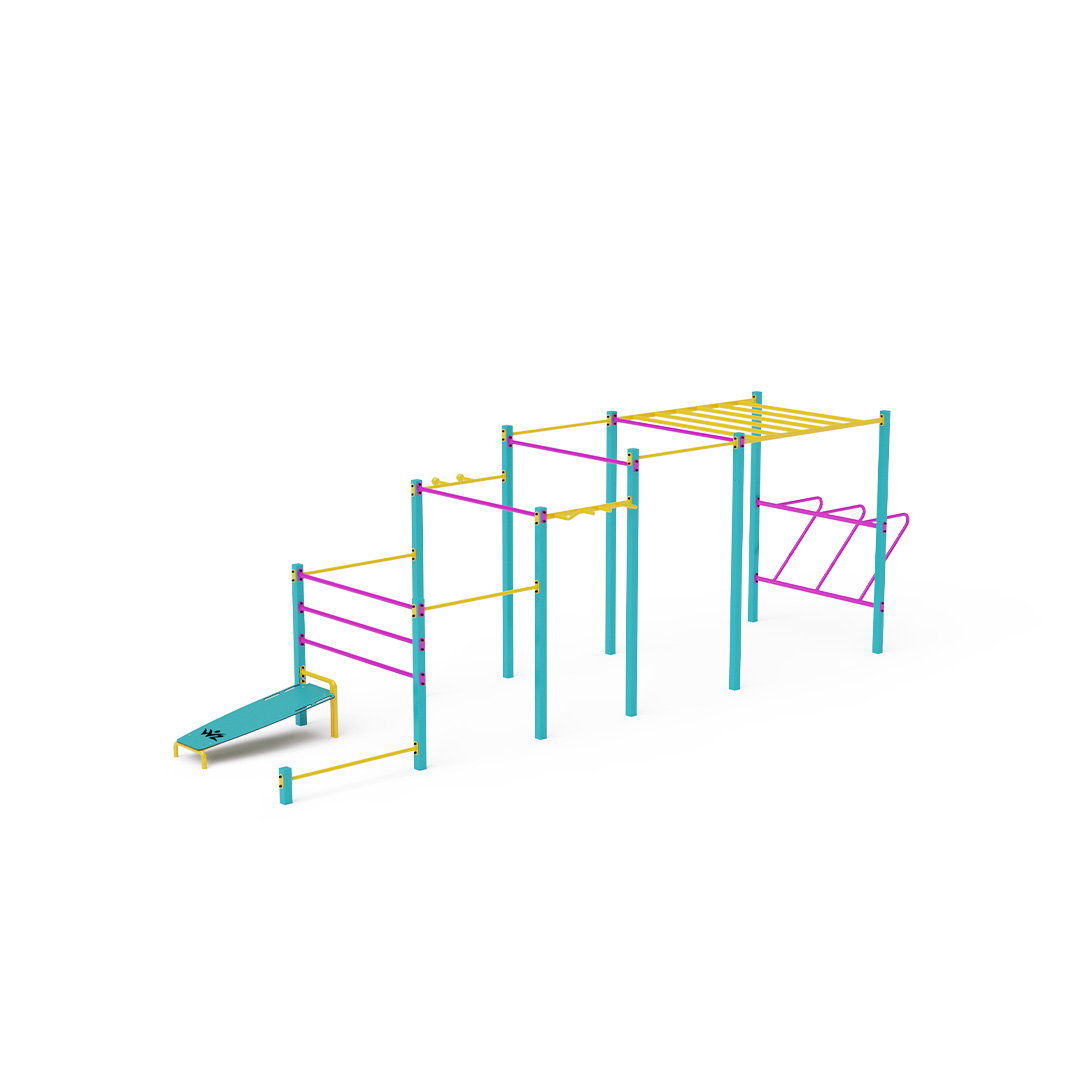Velká sestava s horizontálními hrazdami různých výšek, vertikálními hrazdami, bradly, horizontálním žebříkem je doplněna hrazdou s koulemi, multi úchopovou hrazdou a lavičkou leh-sed.