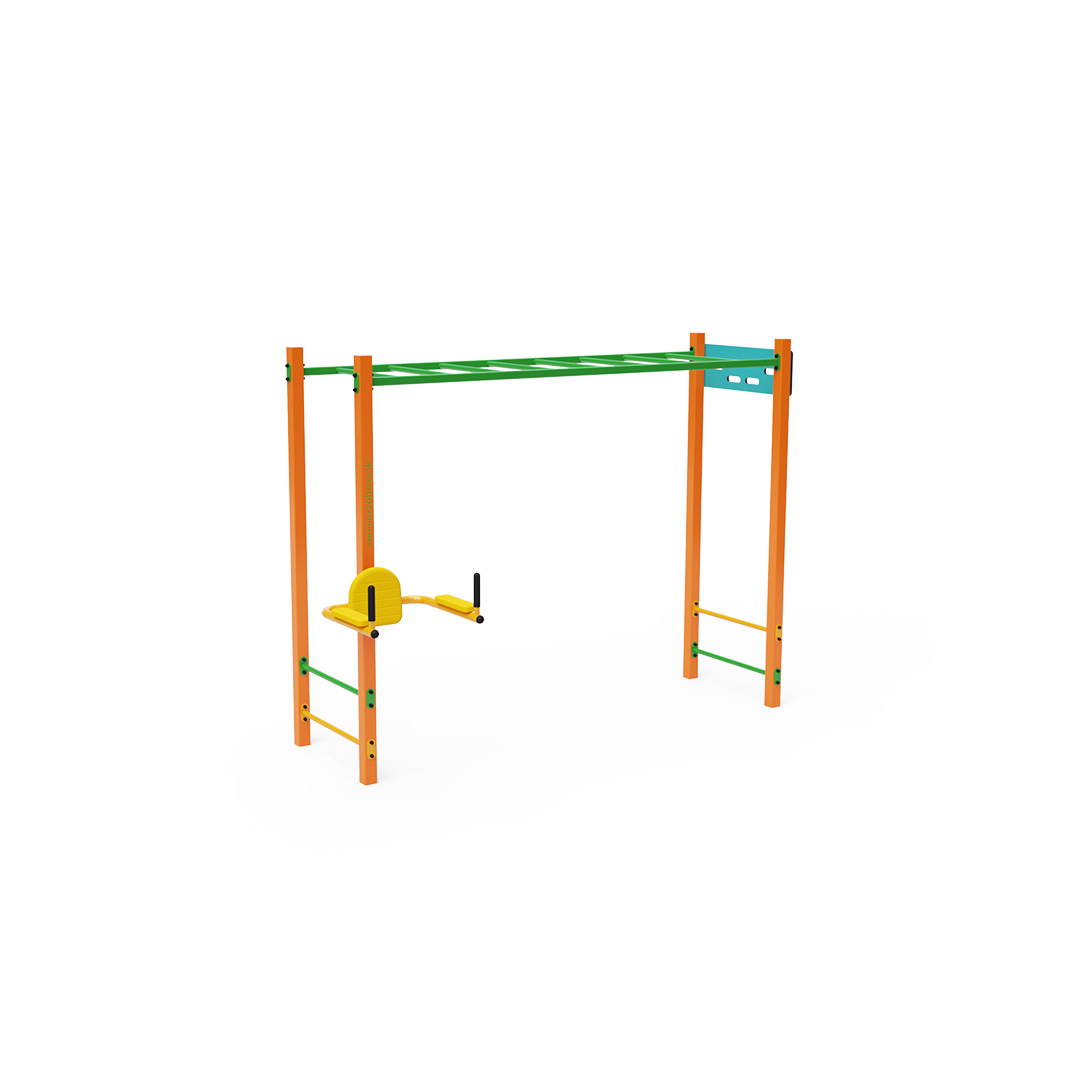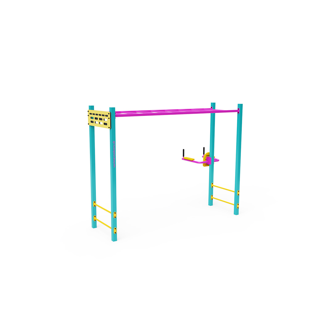Workout je stále populárnější formou venkovního cvičení, které primárně využívá vlastní tělesnou hmotnost. Rozmanitost cviků, které umožňuje cvičební vybavení a sestavy, v kombinaci s čerstvým vzduchem činí tuto aktivitu pestrou a poutavou. To prospívá nejen fyzickému zdraví, ale přispívá i k duševní pohodě. Tato sada obsahuje horizontální žebřík vhodný pro shyby, traverzy a další cviky, doplněný nízkými hrazdami, hangboardem a posilovačem břišních svalů.