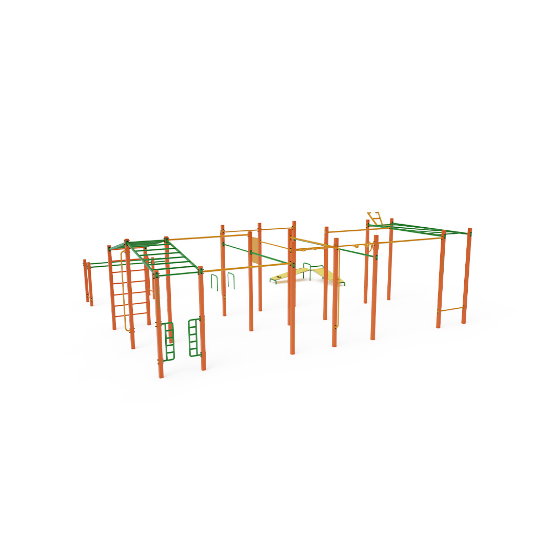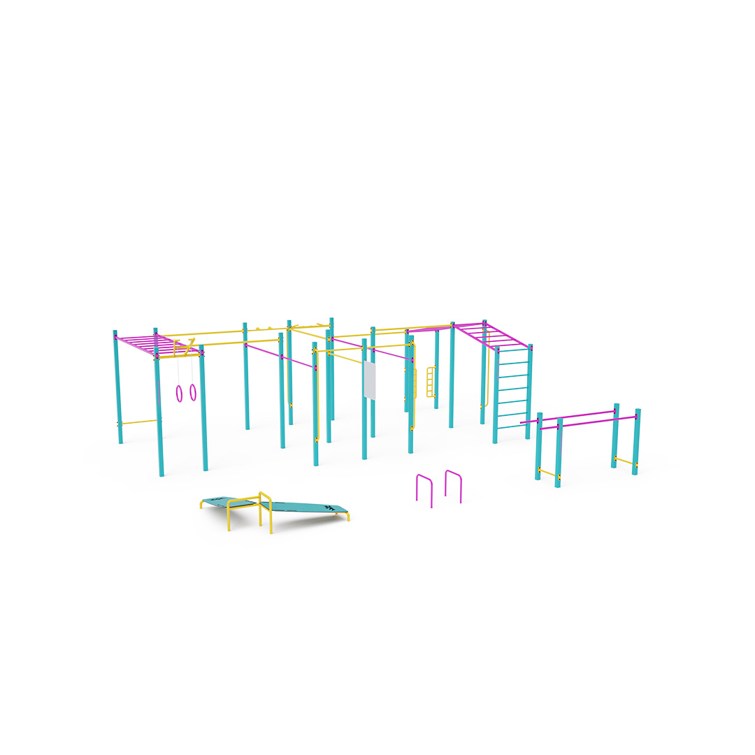 Středně velká sestava s více různě vysokými hrazdami, žebříky a žebřinami a kruhy je doplněna dvěma samostatně stojícími bradly a dvěma leh - sedmi.