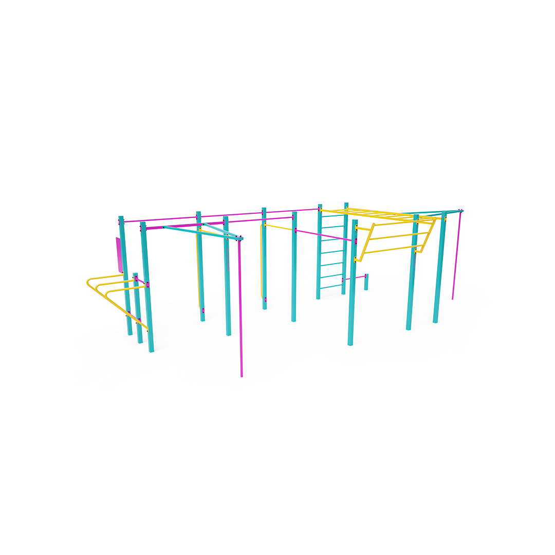 Workout je stále populárnější formou venkovního cvičení, které primárně využívá tělesnou hmotnost. Rozmanitost cviků, které umožňuje cvičební vybavení a sestavy, v kombinaci s čerstvým vzduchem činí aktivitu pestrou a poutavou. To prospívá nejen fyzickému zdraví, ale přispívá i k duševní pohodě. Tato středně velká sada obsahuje několik hrazd různých výšek, dvě svislé hrazdy a šikmou nástěnnou hrazdu. Doplňují ji dvojité bradla, nízká hrazda a horizontální i vertikální žebříky.
