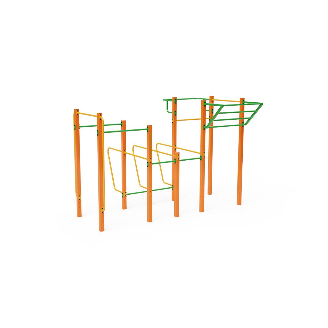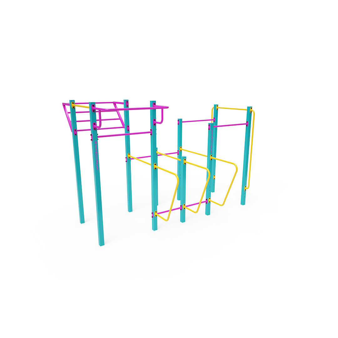 Workout je stále populárnější formou venkovního cvičení, které primárně využívá vlastní tělesnou hmotnost. Rozmanitost cviků, které umožňuje cvičební vybavení a sestavy, v kombinaci s čerstvým vzduchem činí aktivitu pestrou a poutavou. To prospívá nejen fyzickému zdraví, ale přispívá i k duševní pohodě. Tato středně velká sada obsahuje několik hrazd různých výšek, svislé hrazdy a šikmou nástěnnou hrazdu. Doplňují ji dvě sady dvojitých bradel a jedna vyčnívající hrazda.