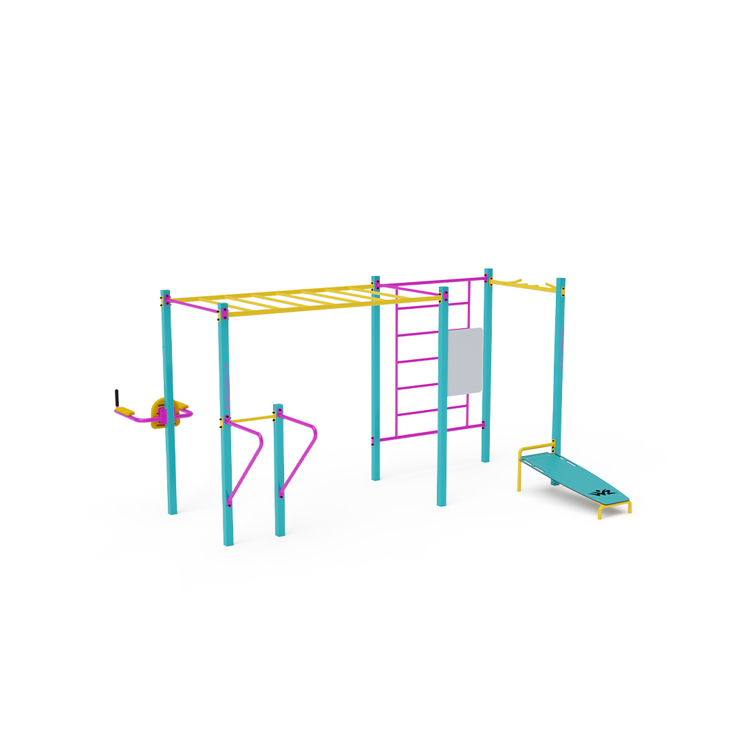 Menší sestava s hrazdou, horizontálním a vertikálním žebříkem, bradly a posilovací lavičkou leh-sed a posilovačem břišních svalů.