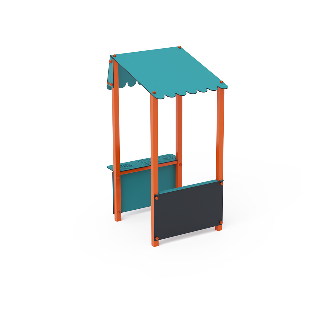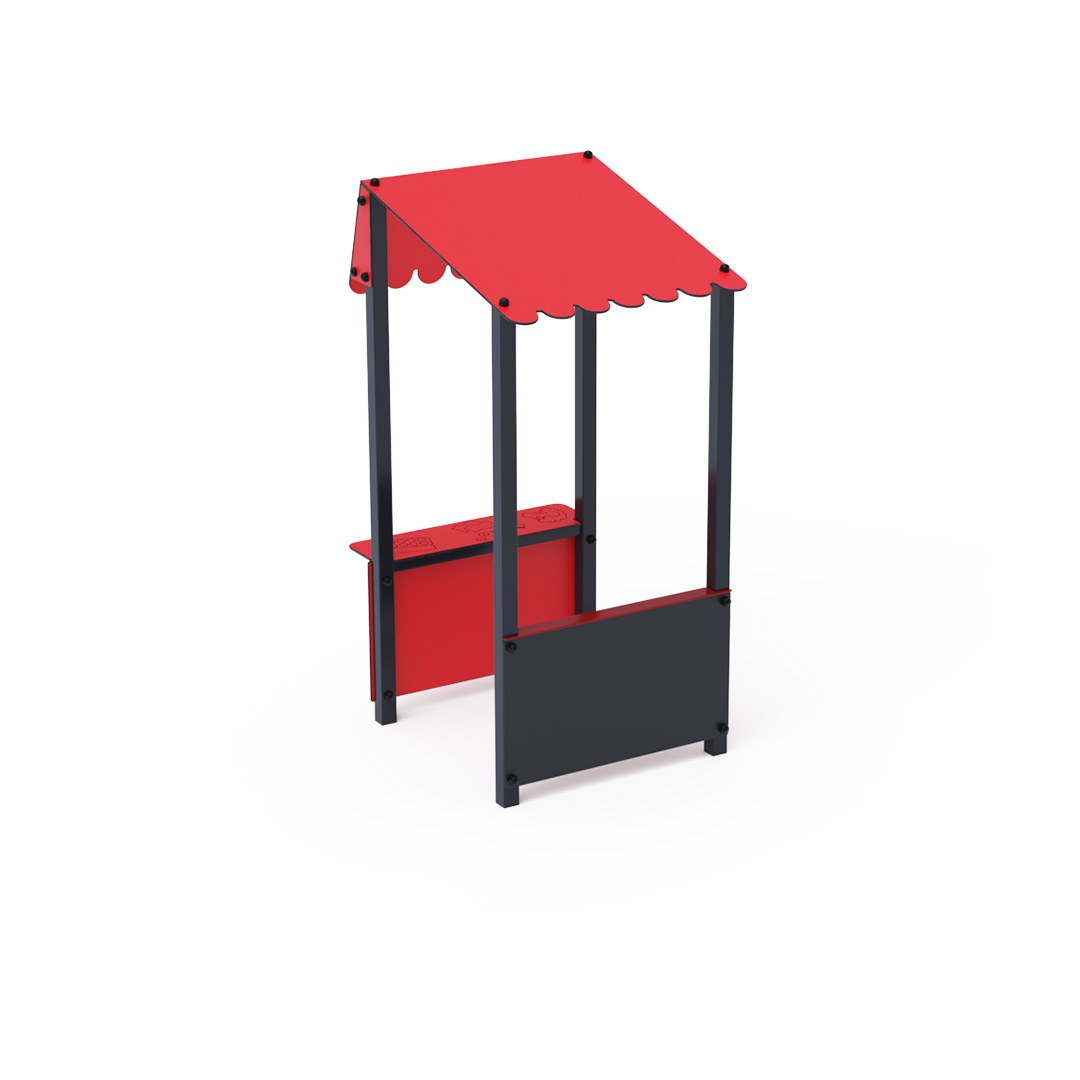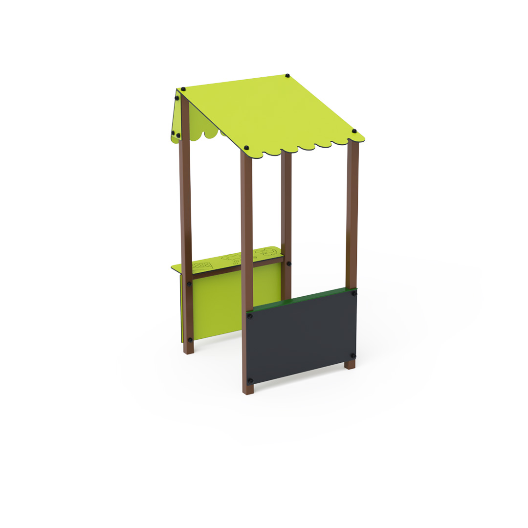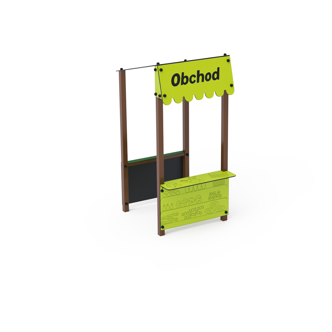 Tématický domeček ve tvaru malého obchodu je ideálním herním prvkem pro rozvoj dětské fantazie a základních matematických dovedností. Domeček je tvořen šikmou střechou, tabulí s nápisem a pultem. Dále je doplněn o kreslicí tabuli a desku ve formě výkladu, na které jsou vyobrazeny nejběžnější produkty. Konstrukce herního prvku je vyrobena z pozinkované a práškově lakované oceli. Všechny desky jsou z HPL materiálu, který je odolný vůči UV záření, stálobarevný, netoxický a nelámavý. Veškeré spoje jsou z nerezové oceli a jsou zakryty plastovými krytkami pro vyšší bezpečnost a dlouhou životnost.