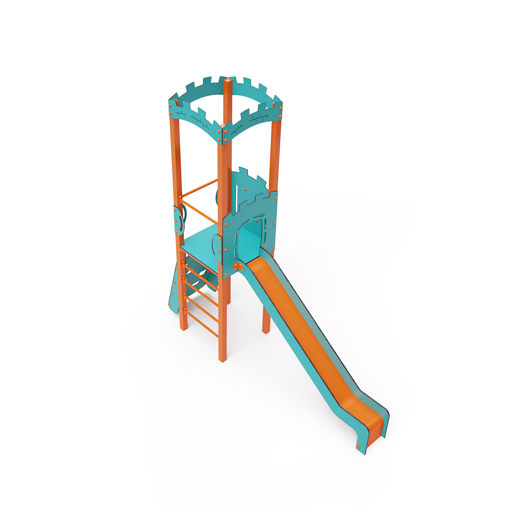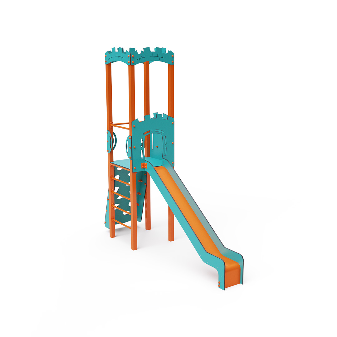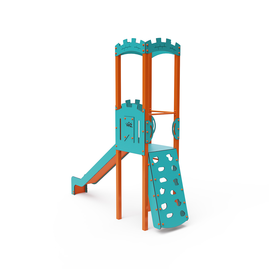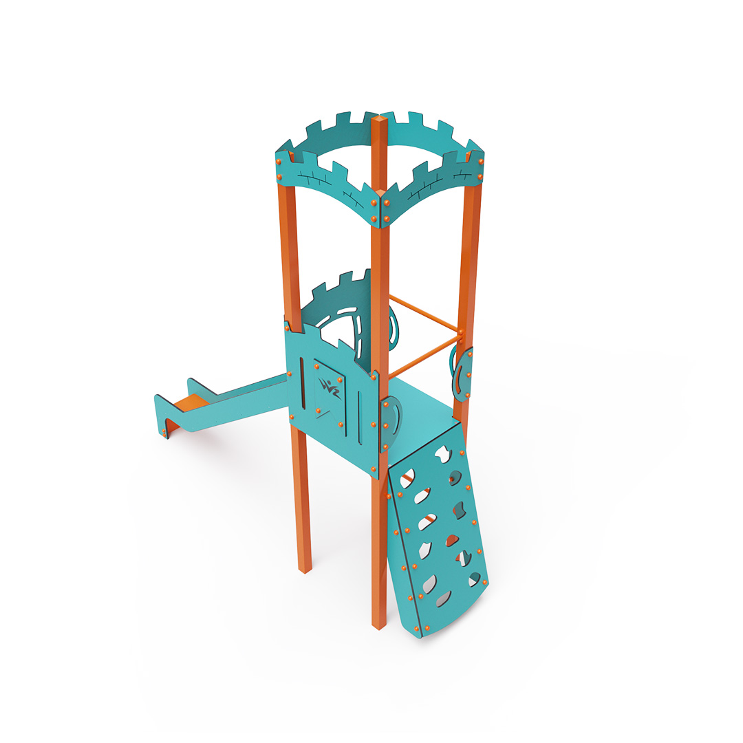 Jednověžová kombinovaná sestava - věž s hradbami, na kterou děti vylezou po lezecké stěně nebo žebřinovém výlezu a dolů se mohou spustit po skluzavce. Ocelová konstrukce je odolná vůči povětrnostním vlivům díky zinkování a lakování odolnou práškovou barvou. Použitý HPL materiál je chemicky odolný, odolný vůči UV záření – stálobarevný, netoxický, recyklovatelný a nelámavý. Nehrozí tak poranění dětí ostrými hranami nebo úlomky. Všechny spoje jsou nerezové a zakryté plastovými krytkami pro zvýšení životnosti a bezpečnosti.