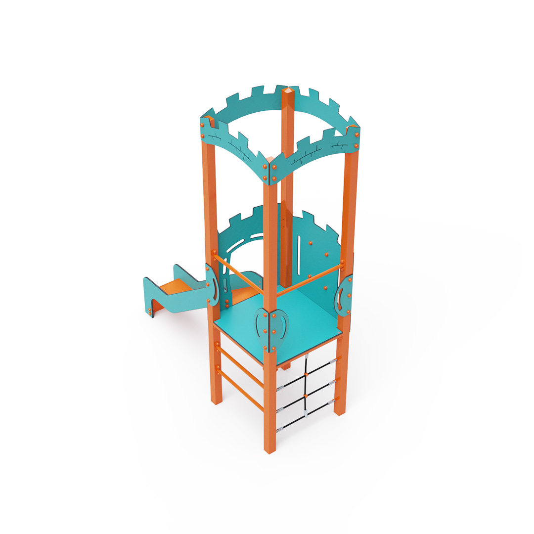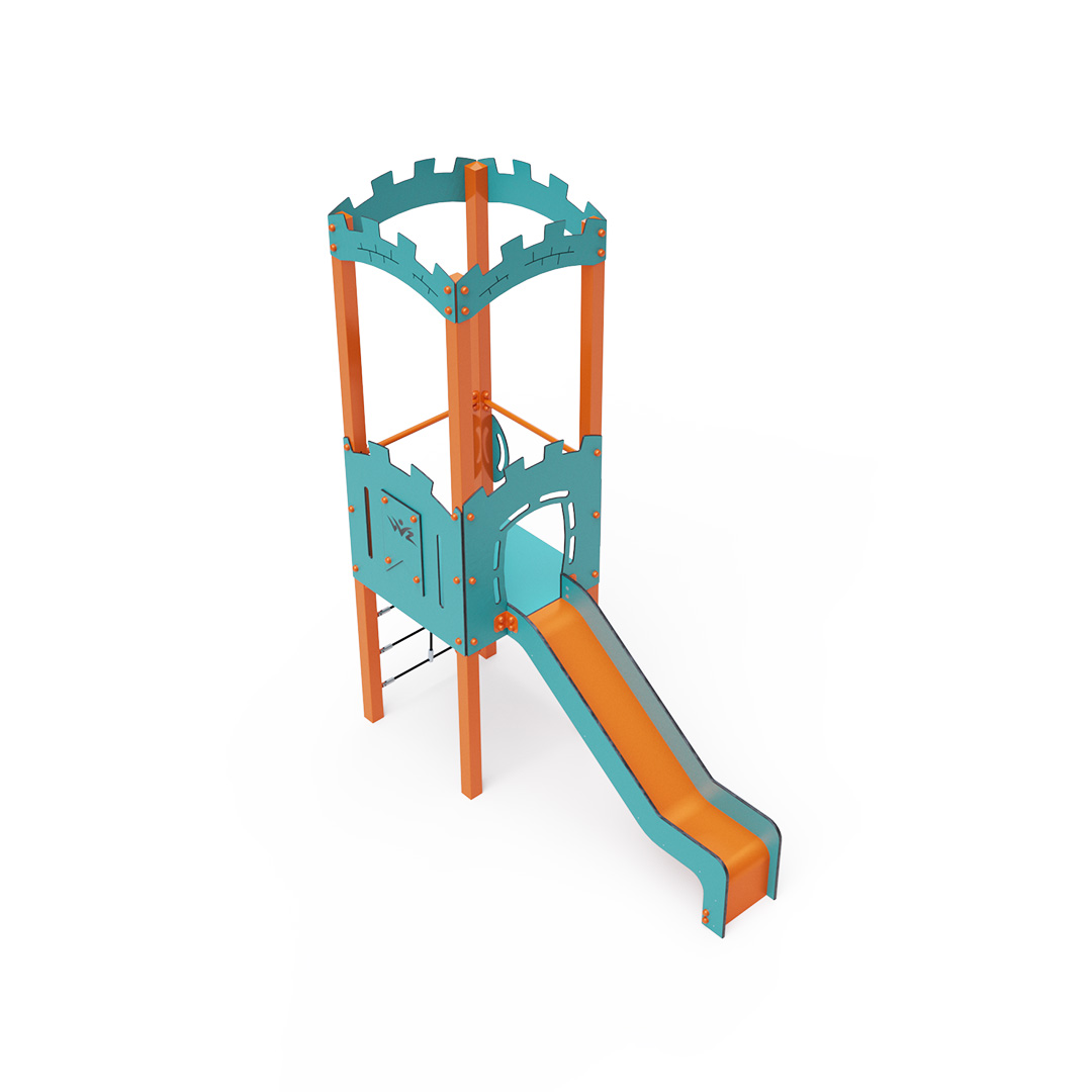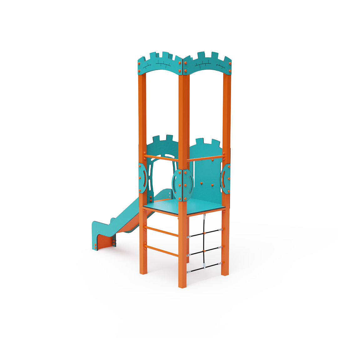 Jednověžová kombinovaná sestava - věž s hradbami, na kterou děti vylezou po lanové lezecké stěně nebo žebrinovém výlezu a dolů se mohou spustit po skluzavce. Ocelová konstrukce je odolná vůči povětrnostním vlivům díky zinkování a lakování odolnou práškovou barvou. Použitý HPL materiál je chemicky odolný, odolný vůči UV záření – stálobarevný, netoxický, recyklovatelný a nelámavý. Nehrozí tak poranění dětí ostrými hranami nebo úlomky. Lana jsou vyrobena z polyesterových vláken, která jsou vinuta kolem středové výztuže. Tato konstrukce lana zvyšuje jeho pevnost a odolnost proti mechanickému namáhání. Samotný polyester je odolný vůči mikroorganismům, povětrnostním vlivům, rychle schne po dešti, je stálobarevný a vyznačuje se vysokou pevností. Všechny spoje jsou nerezové a zakryté plastovými krytkami pro zvýšení životnosti a bezpečnosti.