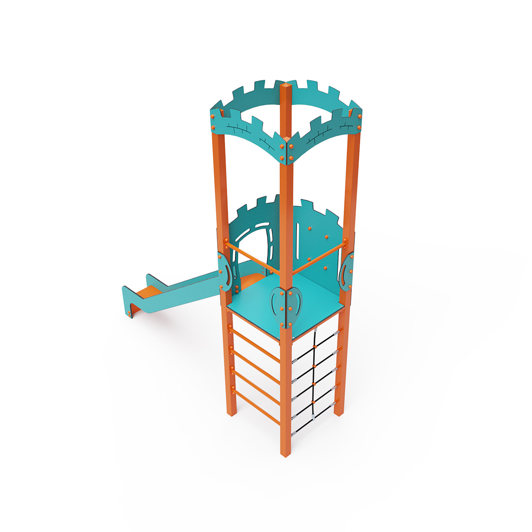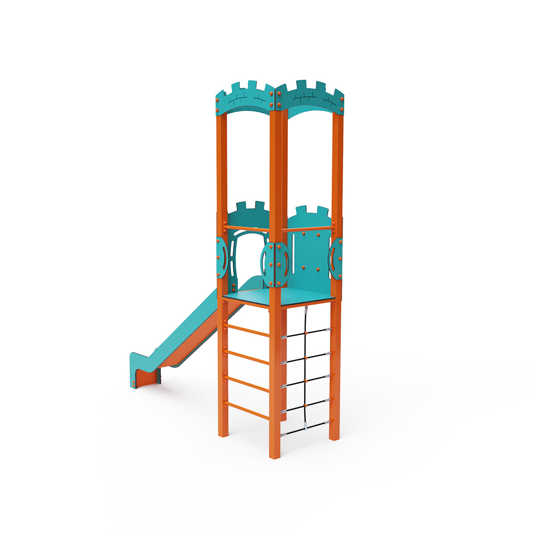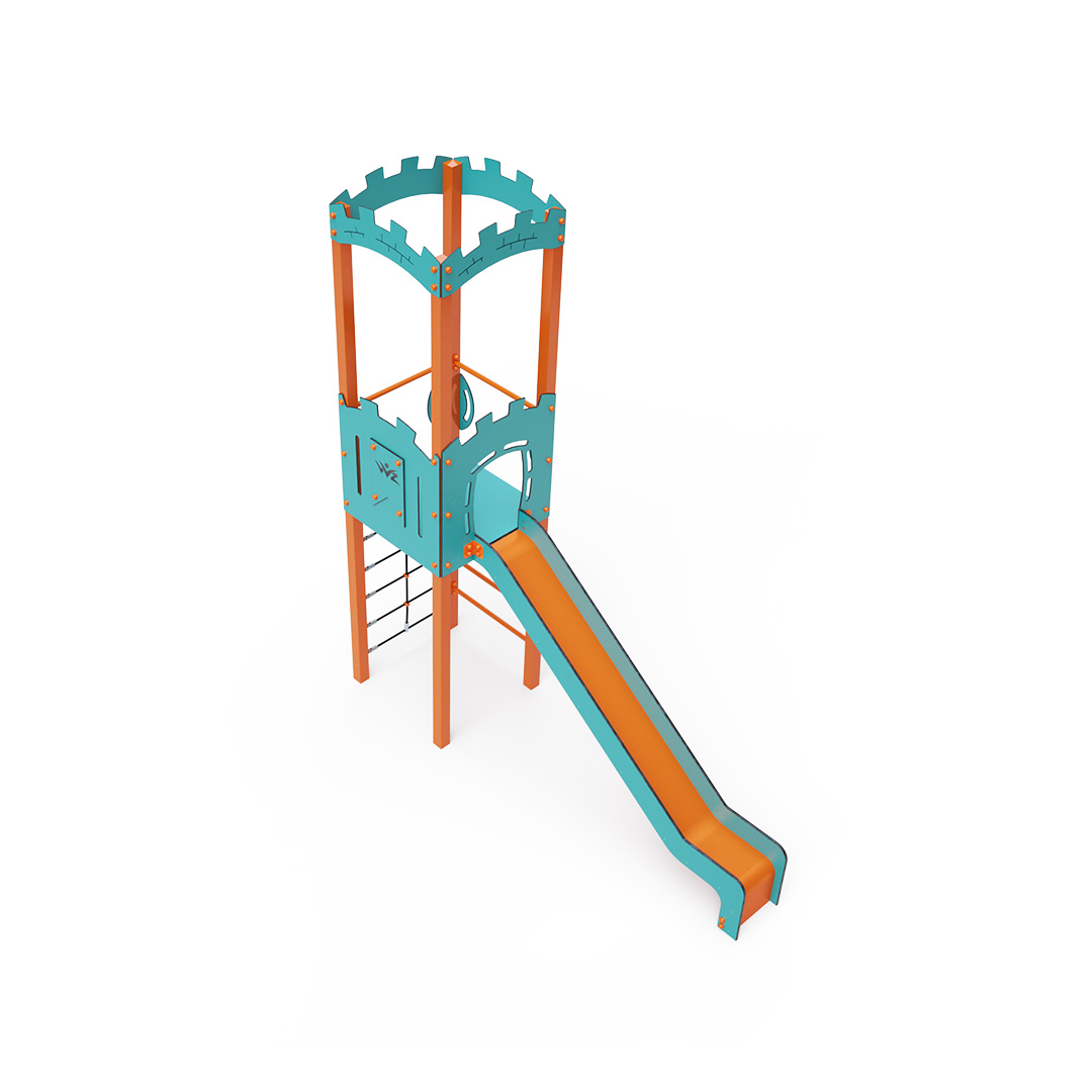 Jednověžová kombinovaná sestava - věž s hradbami, na kterou děti vylezou po lanové lezecké stěně nebo žebrinovém výlezu a dolů se mohou spustit po skluzavce.Ocelová konstrukce je odolná vůči povětrnostním vlivům díky zinkování a lakování odolnou práškovou barvou. Použitý HPL materiál je chemicky odolný, odolný vůči UV záření – stálobarevný, netoxický, recyklovatelný a nelámavý. Nehrozí tak poranění dětí ostrými hranami nebo úlomky. Lana jsou vyrobena z polyesterových vláken, která jsou vinuta kolem středové výztuže. Tato konstrukce lana