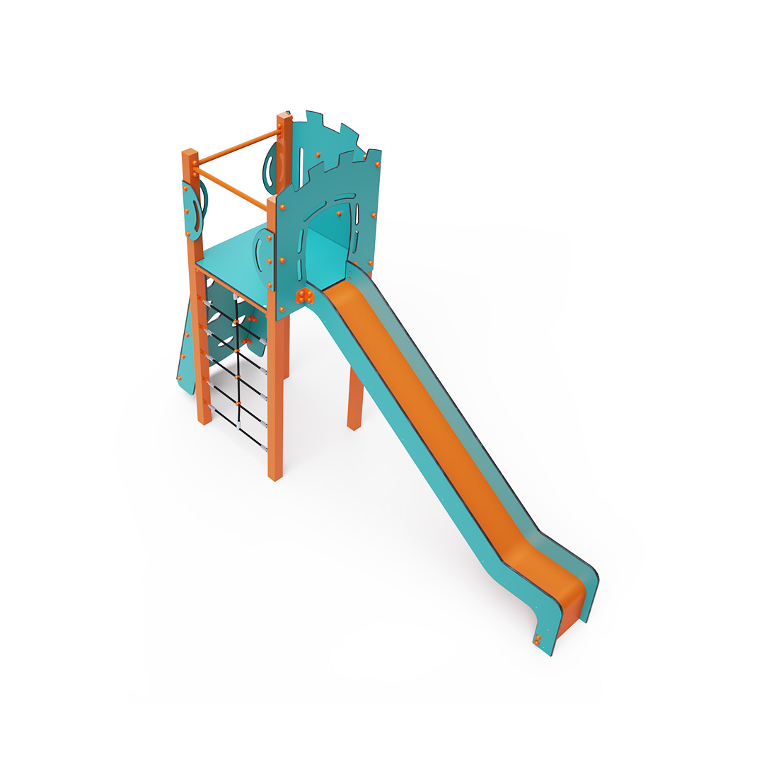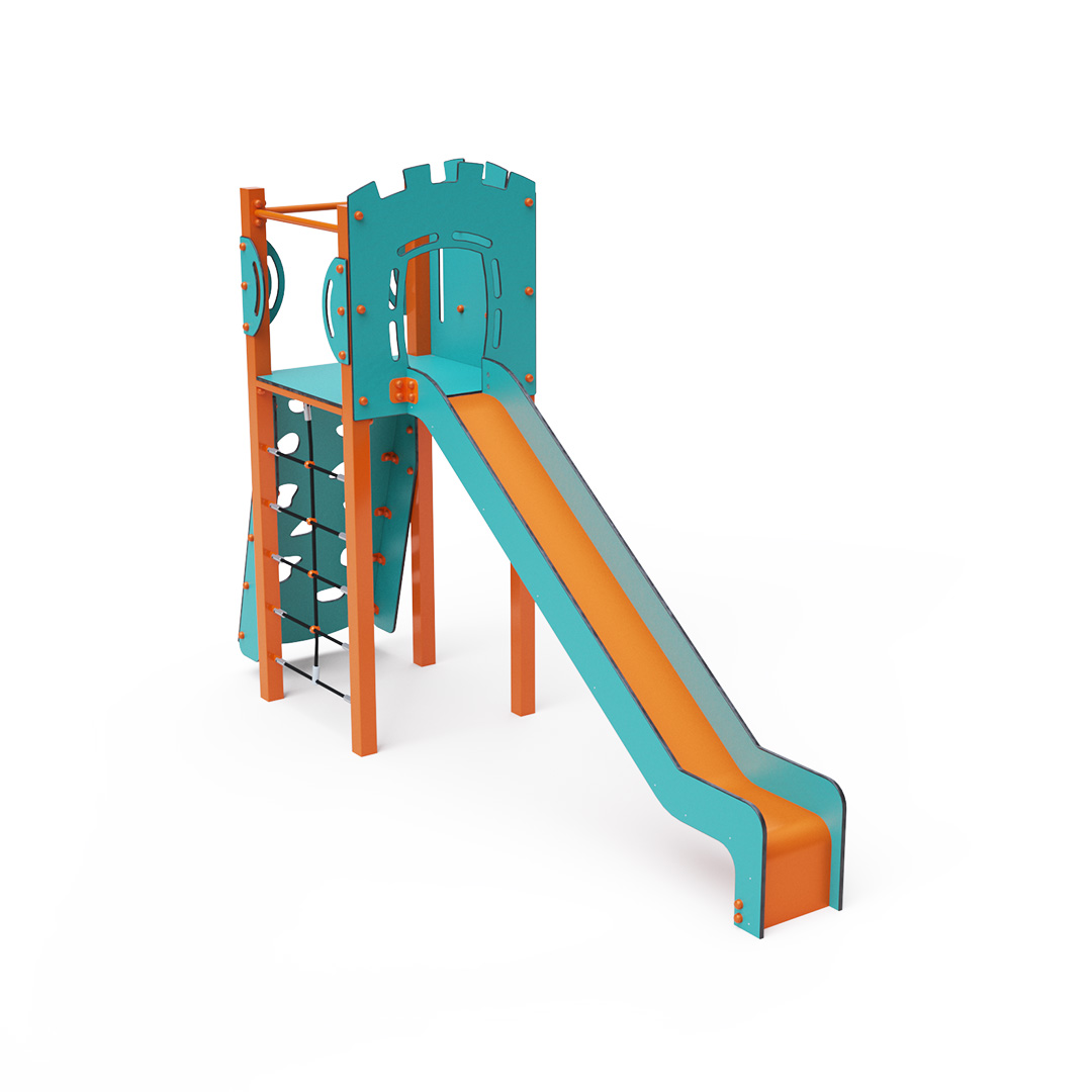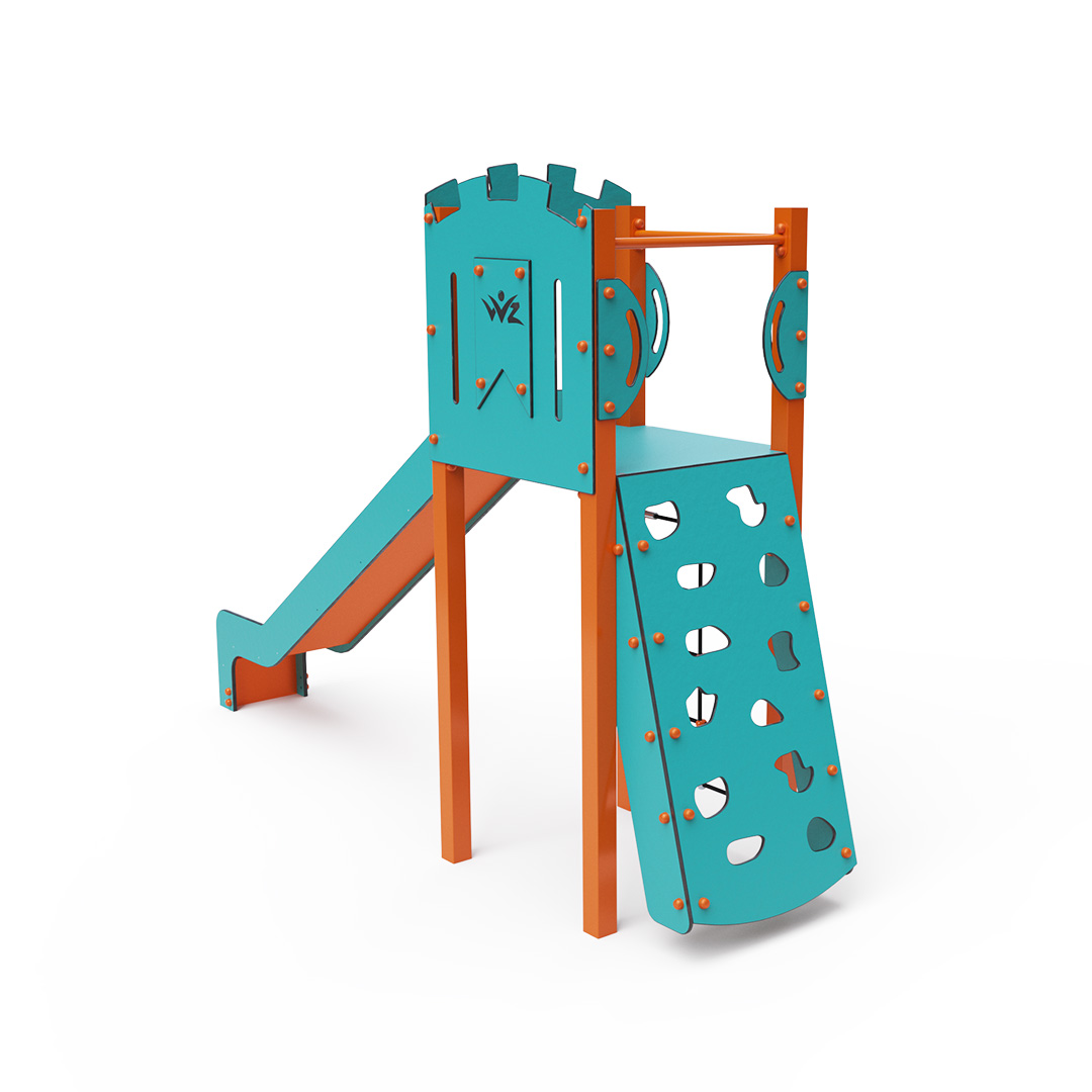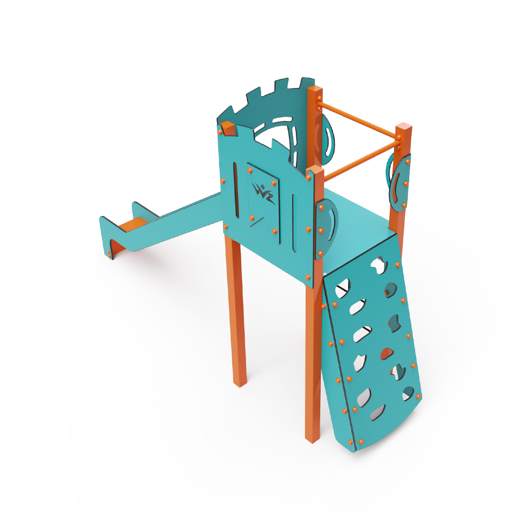 Jednověžová kombinovaná sestava - věž, na kterou děti vylezou po lanové lezecké stěně nebo po lezecké stěně s úchyty a dolů se mohou spustit po skluzavce. Tyrkysově-oranžový design už z dálky láká ke hře. Ocelová konstrukce je odolná vůči povětrnostním vlivům díky žárovému zinkování a lakování odolnou práškovou barvou. Použitý HDPE plast je chemicky odolný, odolný vůči UV záření - stálobarevný, netoxický, recyklovatelný a nelámavý.
