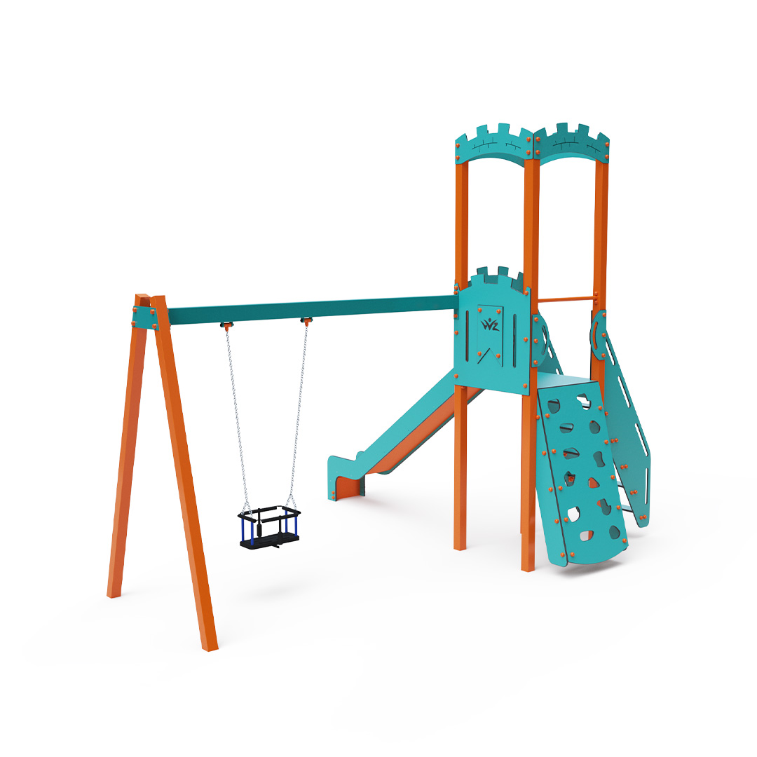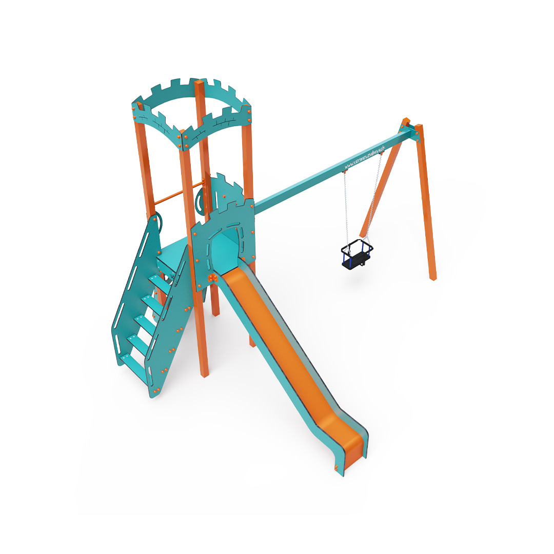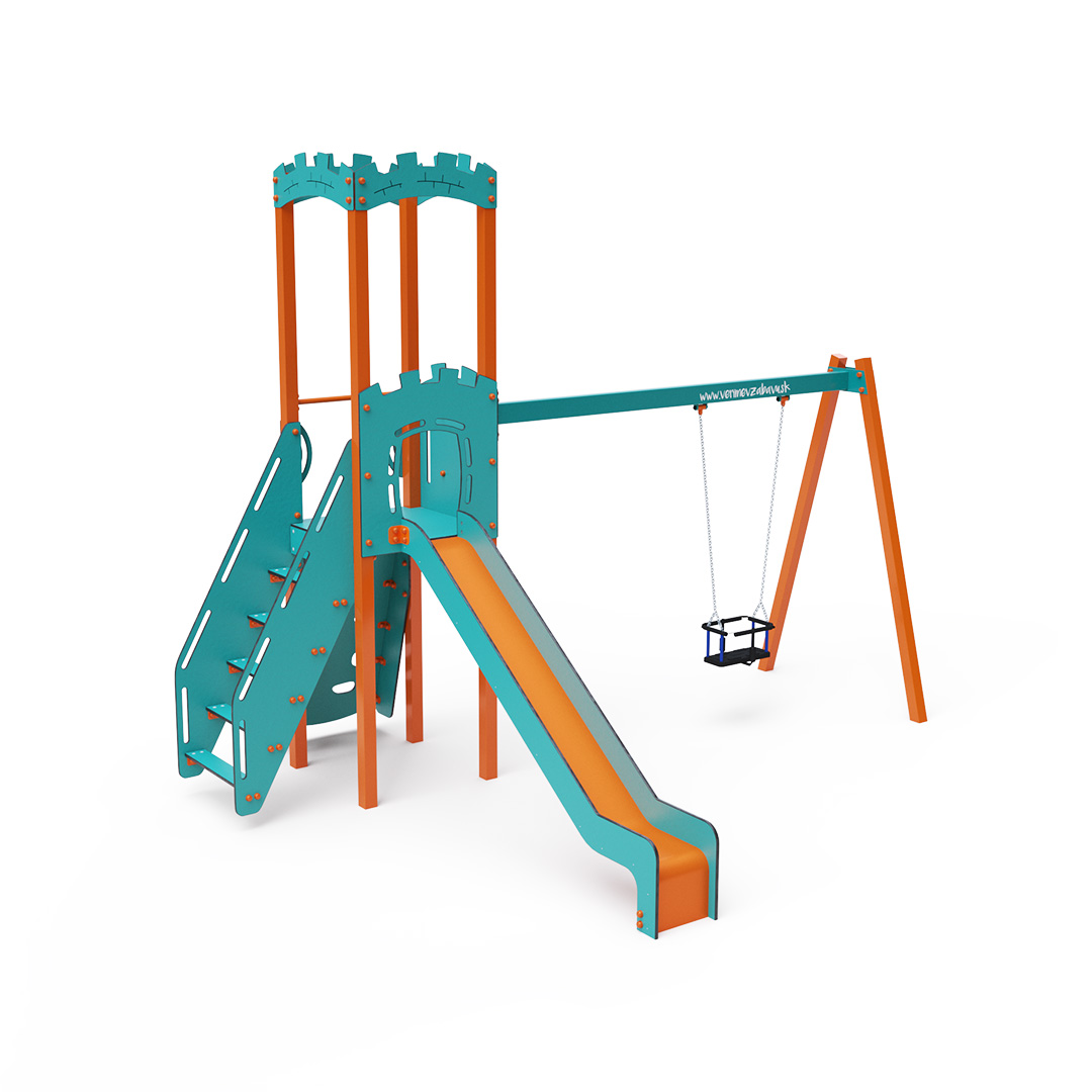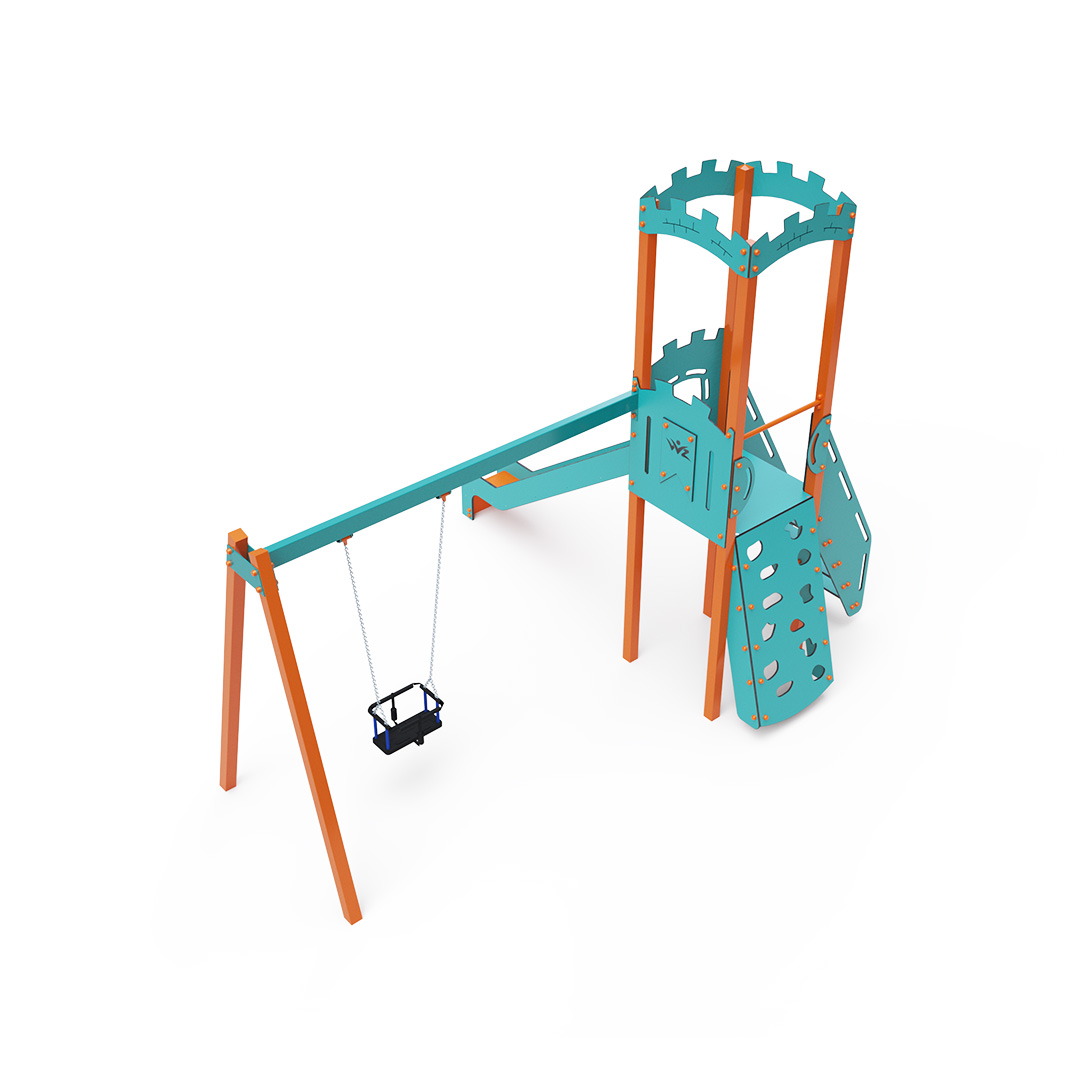 Jednověžová kombinovaná sestava - věž s hradbami, na kterou děti vylezou po schůdcích nebo po lezecké stěně s úchyty a dolů se mohou spustit po skluzavce. Součástí herní sestavy je ráhno houpačky se sedákem Klasik nebo Baby. Tyrkysově-oranžový design už z dálky láká ke hře. Ocelová konstrukce je odolná vůči povětrnostním vlivům díky žárovému zinkování a lakování odolnou práškovou barvou. Použitý HPL materiál je chemicky odolný, odolný vůči UV záření – stálobarevný, netoxický, recyklovatelný a nelámavý. Nehrozí tak poranění dětí ostrými hranami nebo úlomky. Všechny spoje jsou nerezové a zakryté plastovými krytkami pro zvýšení životnosti a bezpečnosti.