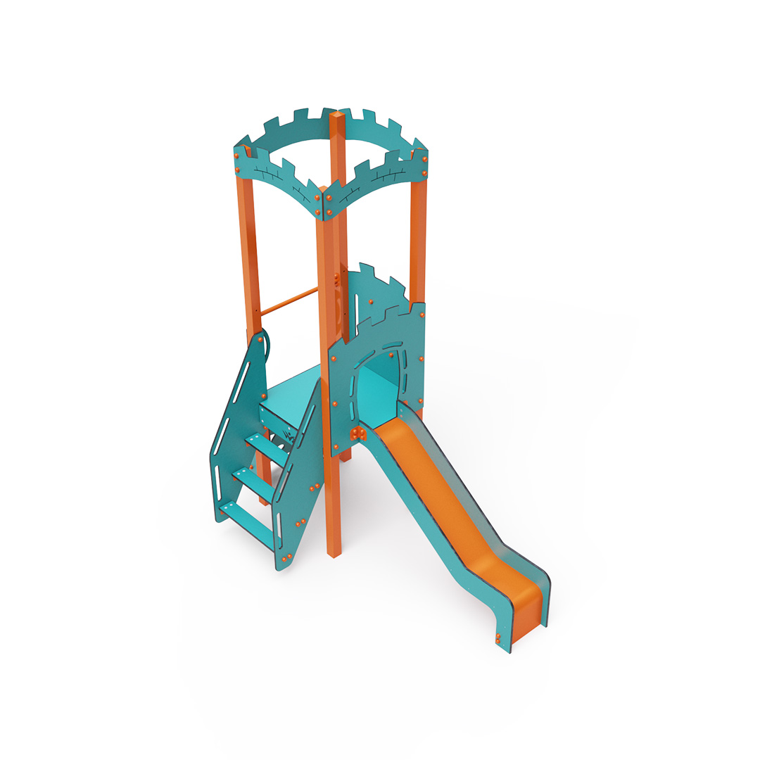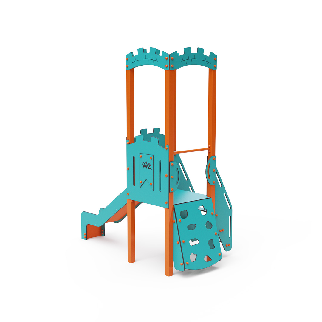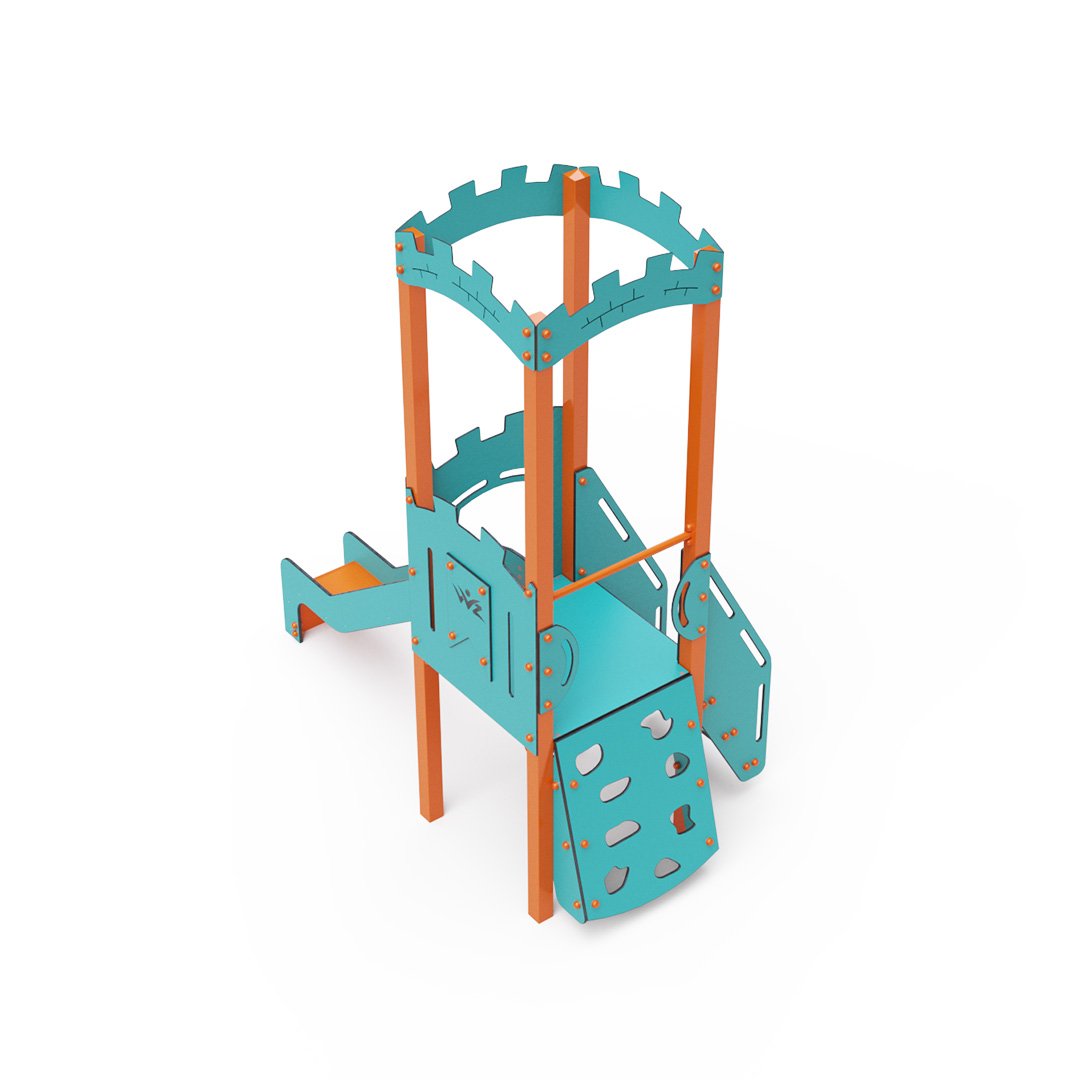 Jednověžová kombinovaná sestava - věž s hradbami, na kterou děti vylezou po schůdcích nebo po lezecké stěně s úchyty a dolů se mohou spustit po skluzavce. Tyrkysově-oranžový design už z dálky láká ke hře. Ocelová konstrukce je odolná vůči povětrnostním vlivům díky žárovému zinkování a lakování odolnou práškovou barvou. Použitý HPL materiál je chemicky odolný, odolný vůči UV záření – stálobarevný, netoxický, recyklovatelný a nelámavý. Nehrozí tak poranění dětí ostrými hranami nebo úlomky. Všechny spoje jsou nerezové a zakryté plastovými krytkami pro zvýšení životnosti a bezpečnosti.