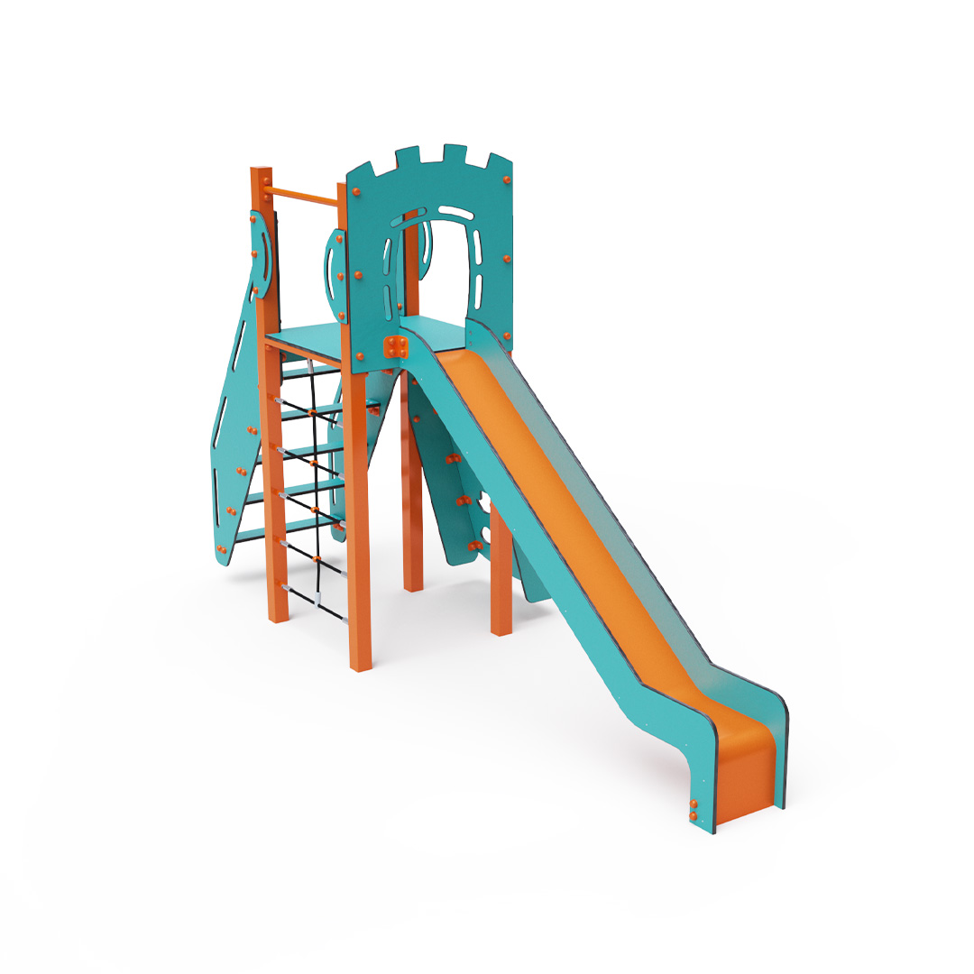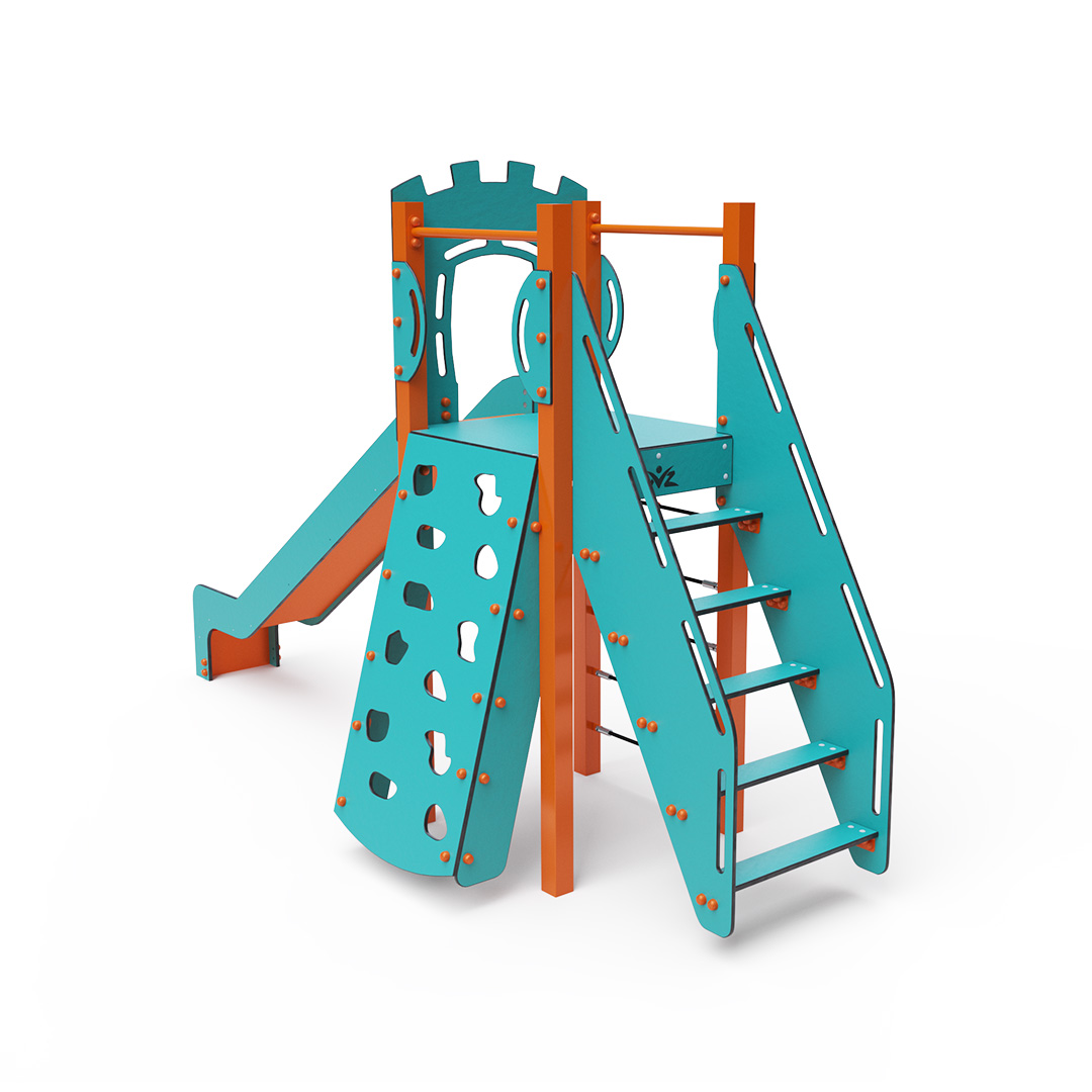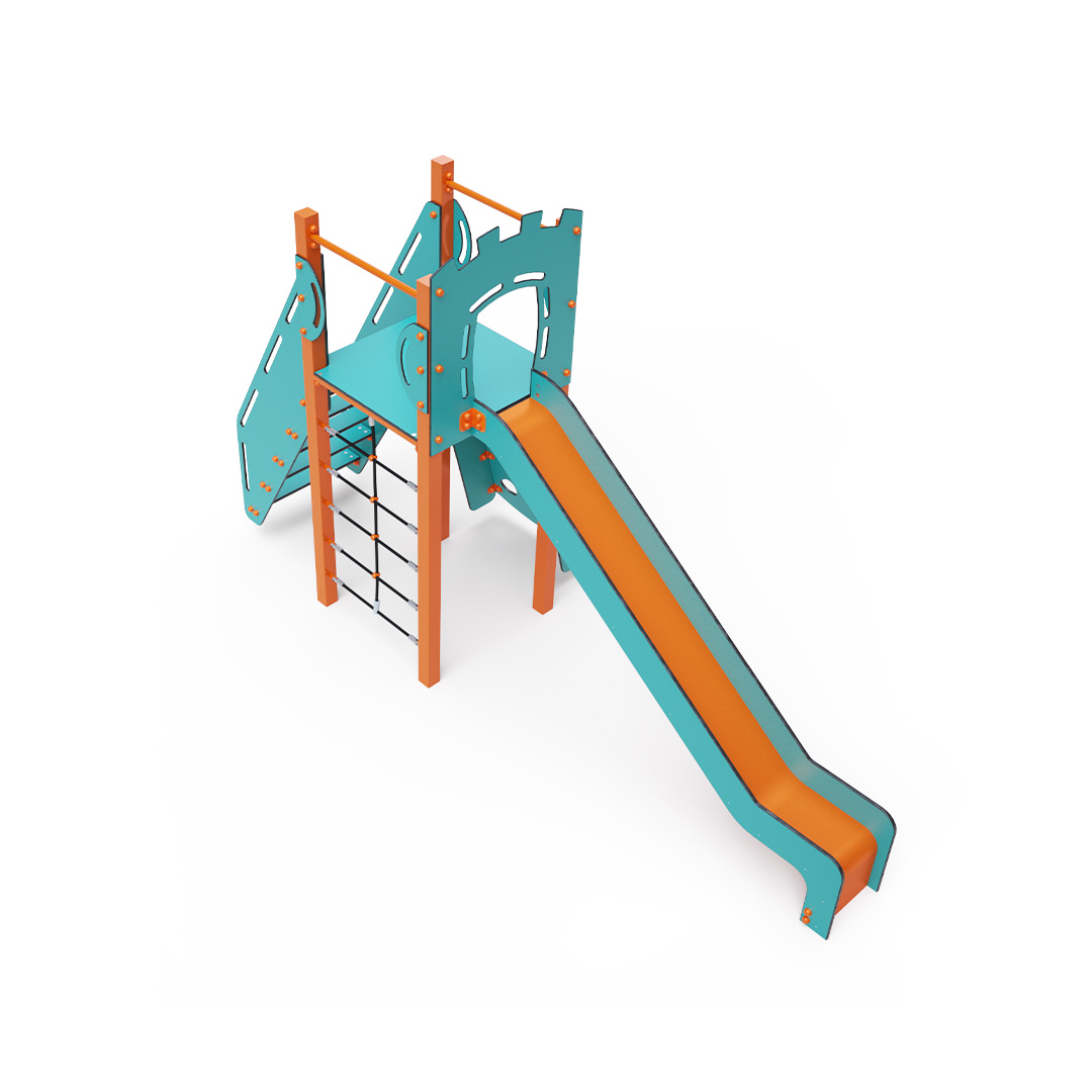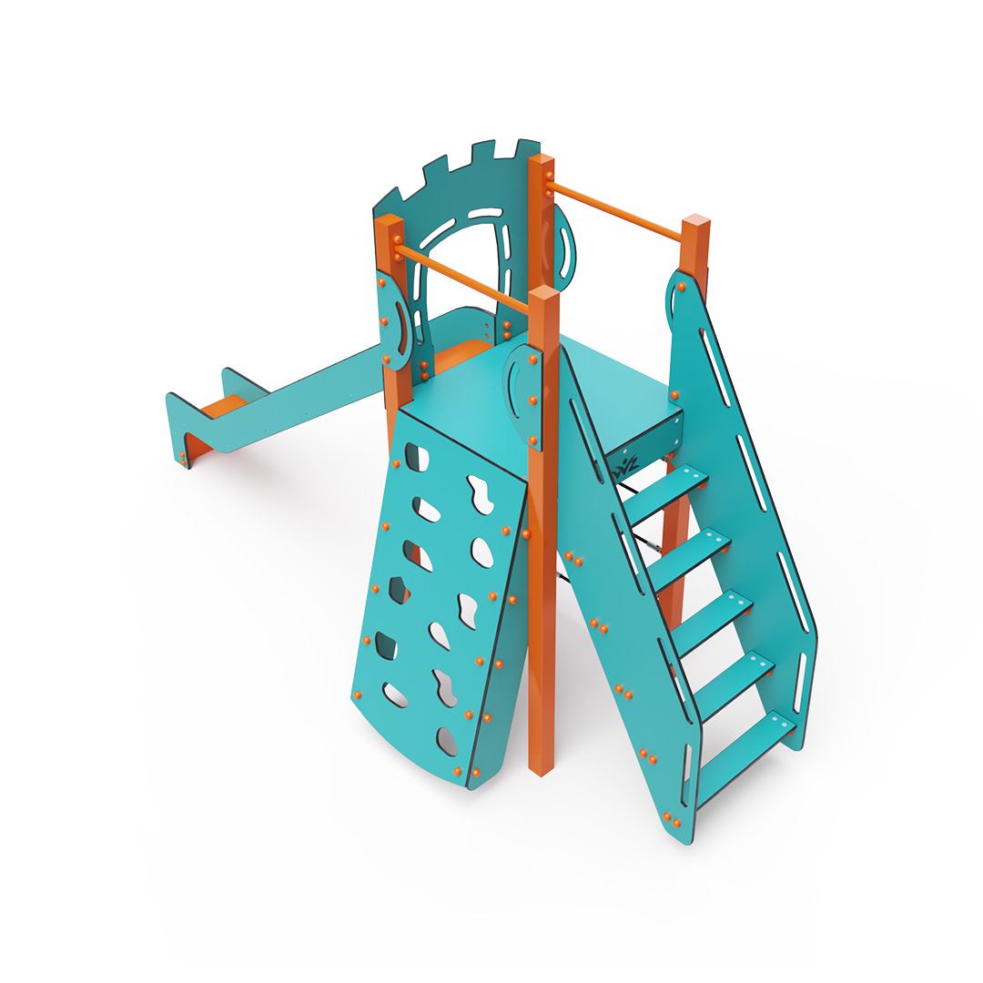Jednověžová kombinovaná sestava - nízká věž, na kterou děti vylezou po schůdcích, šikmé lezecké stěně s úchyty nebo lanovém výlezu a dolů se mohou spustit po skluzavce. Tyrkysově-oranžový design už z dálky láká ke hře. Ocelová konstrukce je odolná vůči povětrnostním vlivům díky žárovému zinkování a lakování odolnou práškovou barvou. Použitý HPL materiál je chemicky odolný, odolný vůči UV záření – stálobarevný, netoxický, recyklovatelný a nelámavý. Nehrozí tak poranění dětí ostrými hranami nebo úlomky. Všechny spoje jsou nerezové a zakryté plastovými krytkami pro zvýšení životnosti a bezpečnosti.