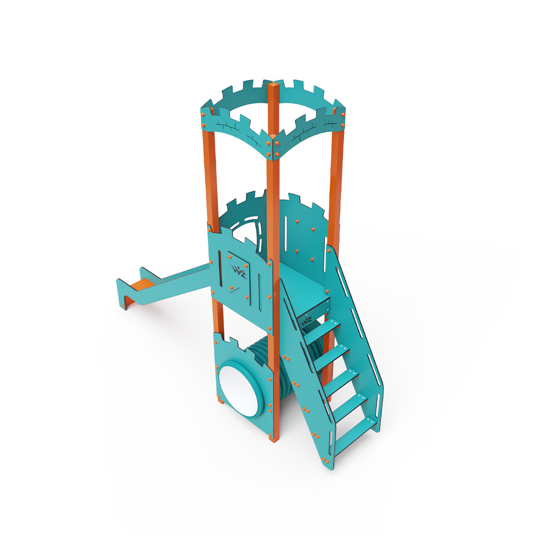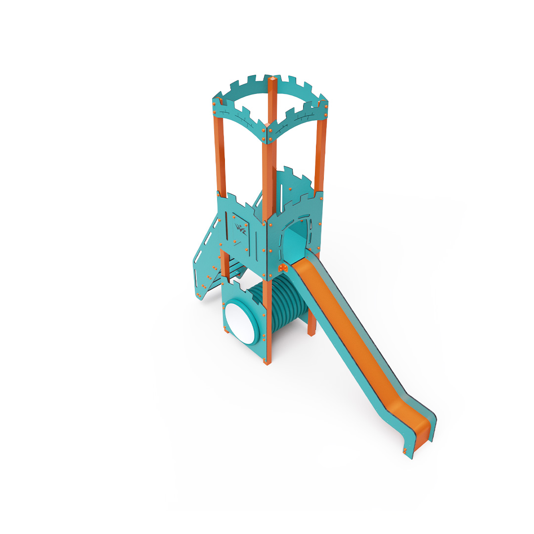 a dolů se mohou spustit po skluzavce. Zahrát si mohou také v tunelu, který je umístěn pod věží. Tyrkysově-oranžový design už z dálky láká ke hře. Ocelová konstrukce je odolná vůči
