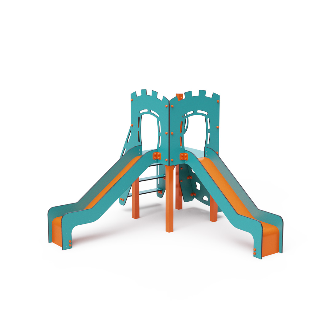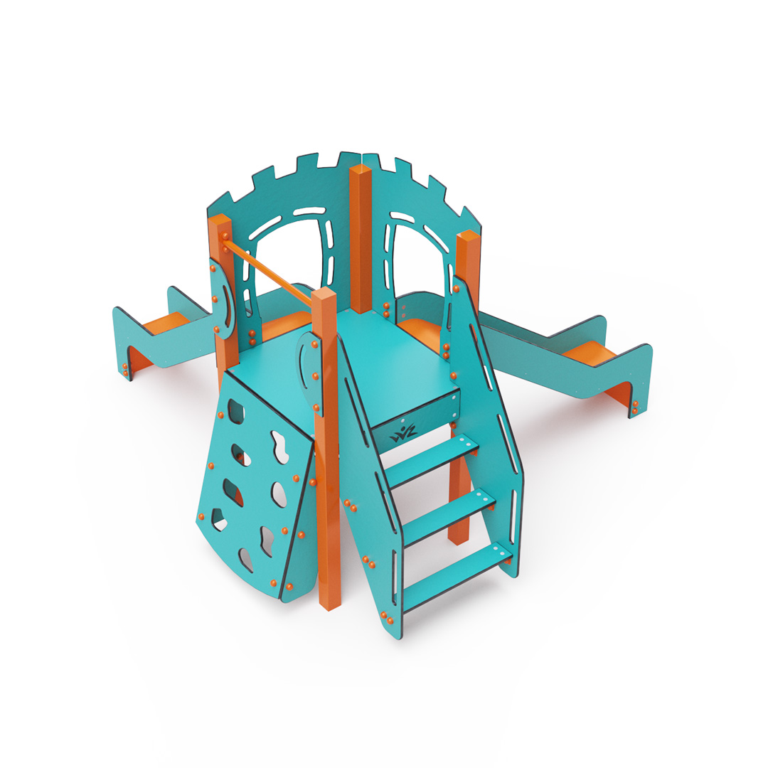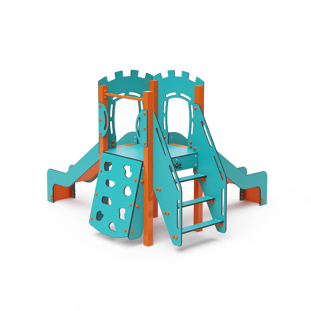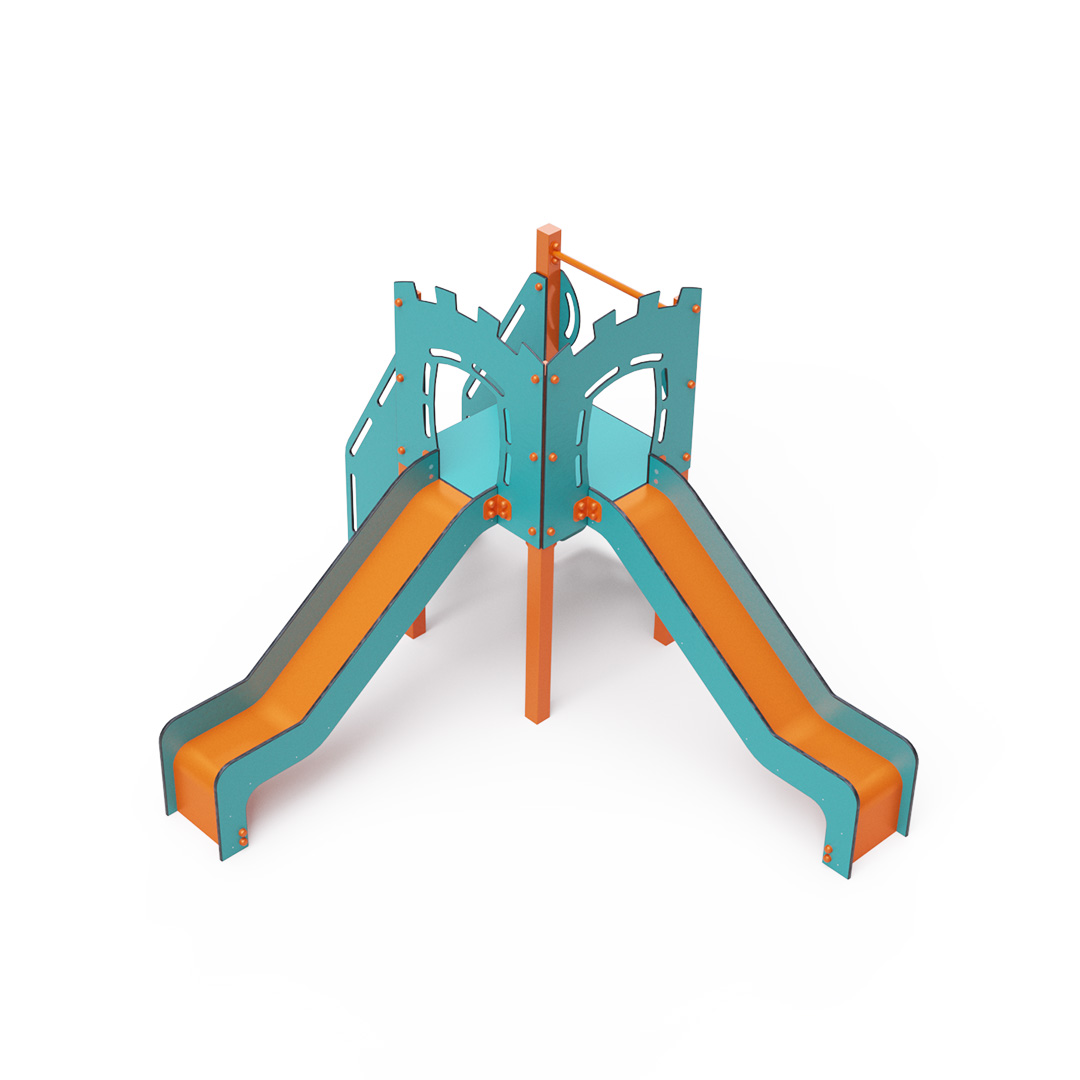 Jednověžová kombinovaná sestava - věž, na kterou děti vylezou po schůdcích nebo po lezecké stěně s úchyty a dolů se mohou spustit po jedné ze dvou skluzavek. Tyrkysově-oranžový design už z dálky láká ke hře. Ocelová konstrukce je odolná vůči povětrnostním vlivům díky žárovému zinkování a lakování odolnou práškovou barvou. Použitý HPL materiál je chemicky odolný, odolný vůči UV záření – stálobarevný, netoxický, recyklovatelný a nelámavý. Nehrozí tak poranění dětí ostrými hranami nebo úlomky. Všechny spoje jsou nerezové a zakryté plastovými krytkami pro zvýšení životnosti a bezpečnosti.
