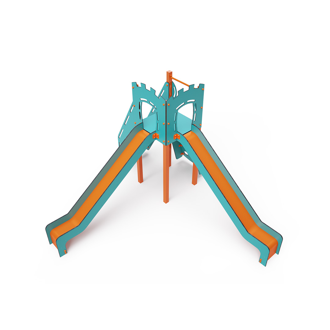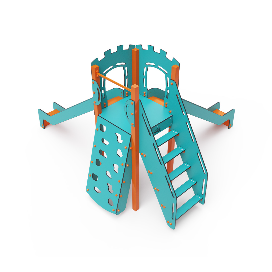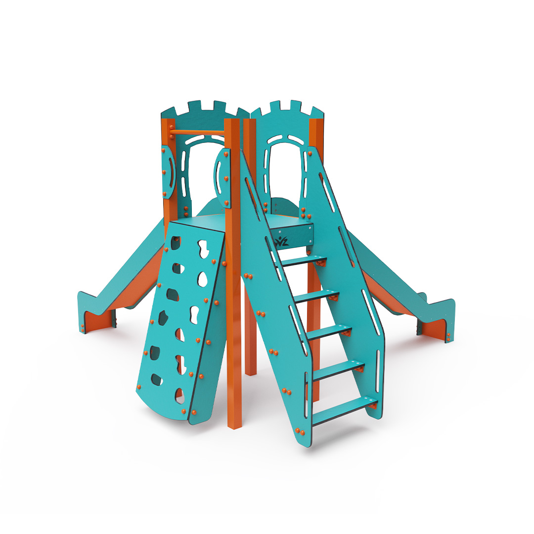 lezecké stěně s úchyty a dolů se mohou spustit po jedné ze dvou skluzavek. Tyrkysově-oranžový design už z dálky láká ke hře. Ocelová konstrukce je odolná vůči povětrnostním vlivům díky žárovému zinkování a lakování odolnou práškovou barvou. Použitý HPL materiál je chemicky odolný, odolný vůči UV záření – stálobarevný, netoxický, recyklovatelný a nelámavý. Nehrozí tak poranění dětí ostrými hranami nebo úlomky. Všechny spoje jsou nerezové a zakryté plastovými krytkami pro zvýšení životnosti a bezpečnosti.