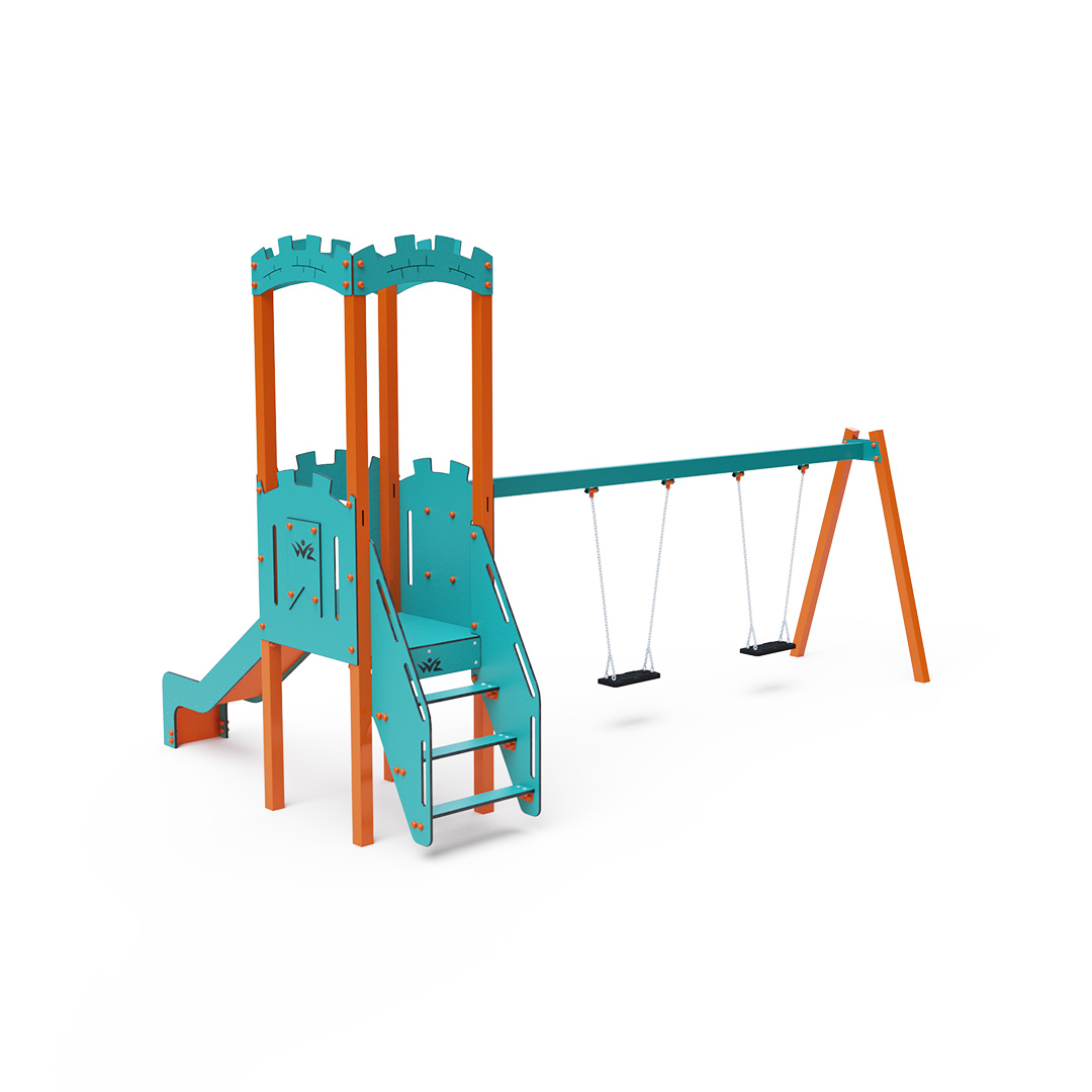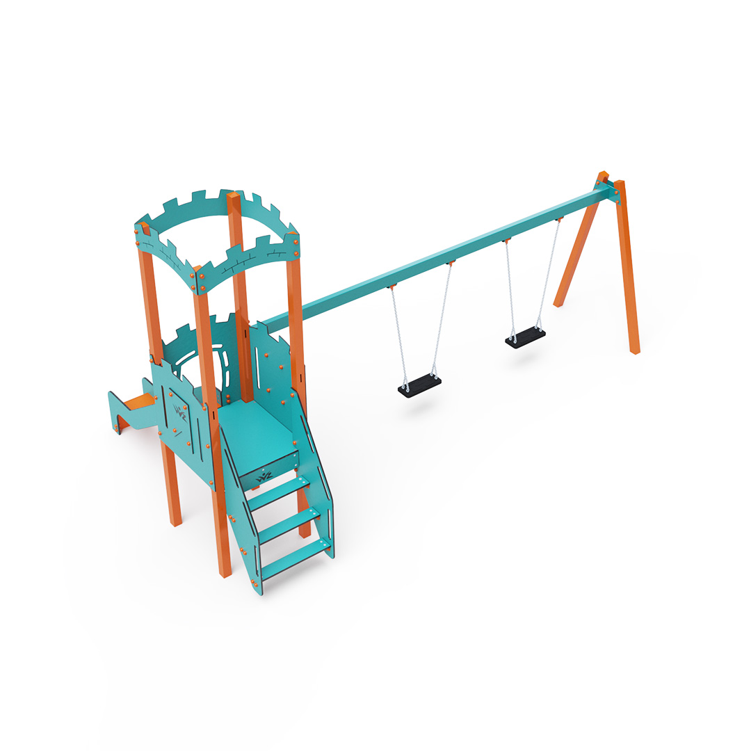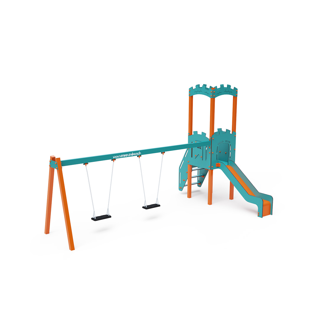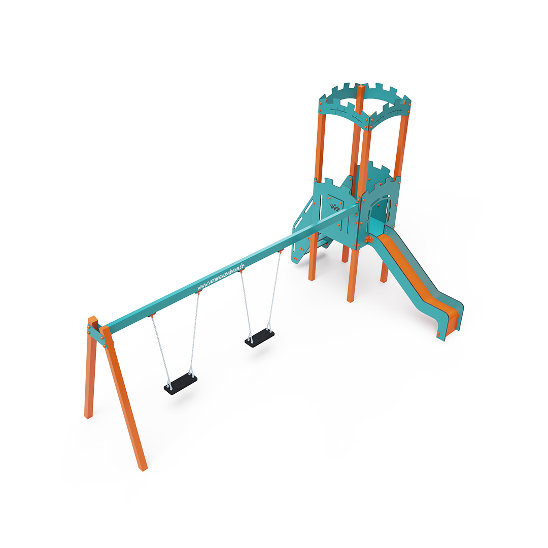 Jednověžová kombinovaná sestava - věž, na kterou děti vylezou po schůdcích a dolů se mohou spustit po jedné ze dvou skluzavek. Součástí herní sestavy je ráhno houpačky se dvěma sedáky Klasik, Baby nebo jejich kombinace. Tyrkysově-oranžový design už z dálky láká ke hře. Ocelová konstrukce je odolná vůči povětrnostním vlivům díky žárovému zinkování a lakování odolnou práškovou barvou. Použitý HPL materiál je chemicky odolný, odolný vůči UV záření – stálobarevný, netoxický, recyklovatelný nelámavý. Nehrozí tak poranění dětí ostrými hranami nebo úlomky. Lana jsou vyrobena z polyesterových vláken, která jsou vinuta kolem středové výztuže. Tato konstrukce lana zvyšuje jeho pevnost a odolnost proti mechanickému namáhání. Samotný polyester je odolný vůči mikroorganismům, povětrnostním vlivům, rychle schne po dešti, je stálobarevný a vyznačuje se vysokou pevností. Všechny spoje jsou nerezové a zakryté plastovými krytkami pro zvýšení životnosti a bezpečnosti.