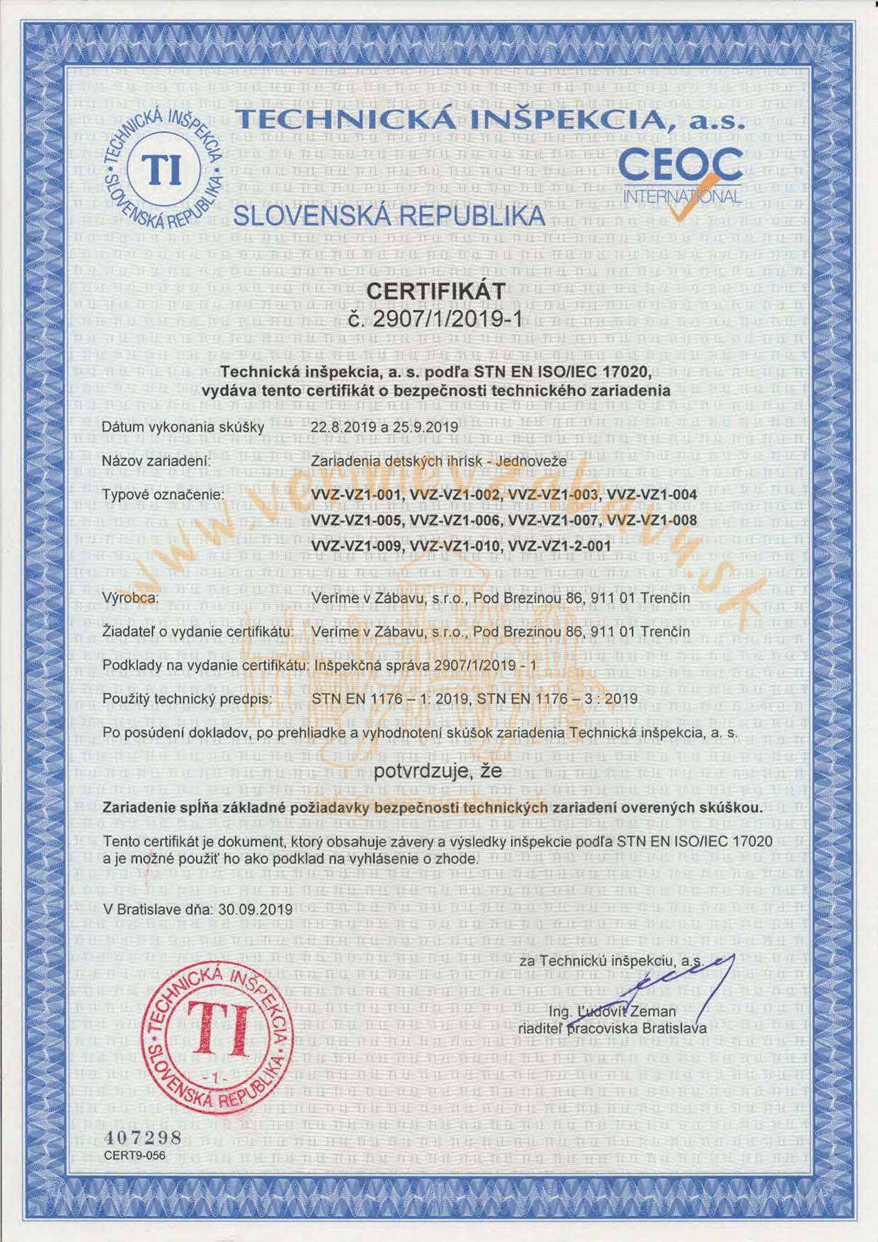 Všechny naše prvky v nabídce prošly kontrolou Technické inspekce a.s., podle příslušné normy, což dokazují i certifikáty které můžete najít na webu u každého produktu. Přestože jsou všechny naše výrobky schváleny Technickou inspekcí a.s., nejpřísnějšími kontrolory jsou pro nás ti, kteří se na cestu za zábavou vydají – a nejsou to jen děti.