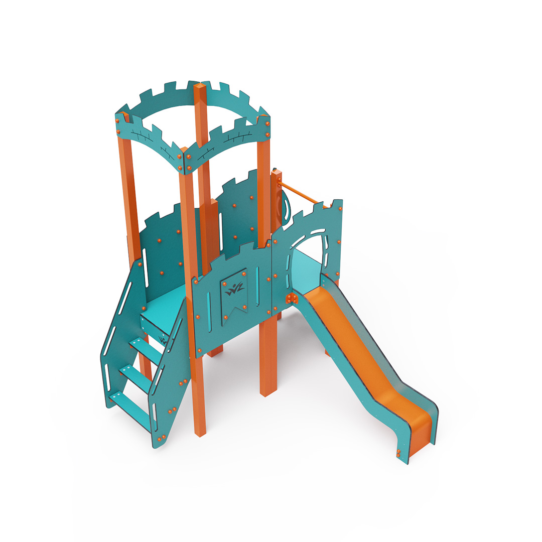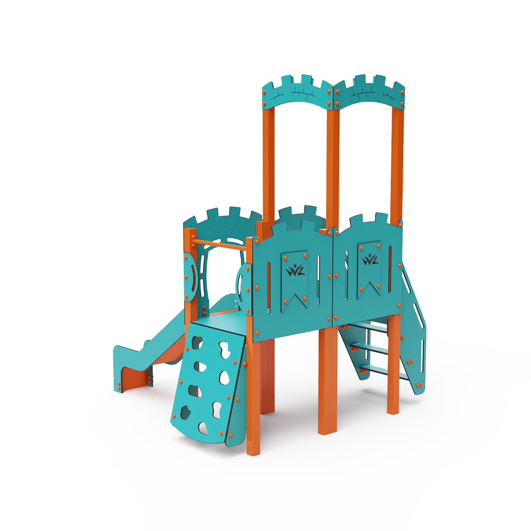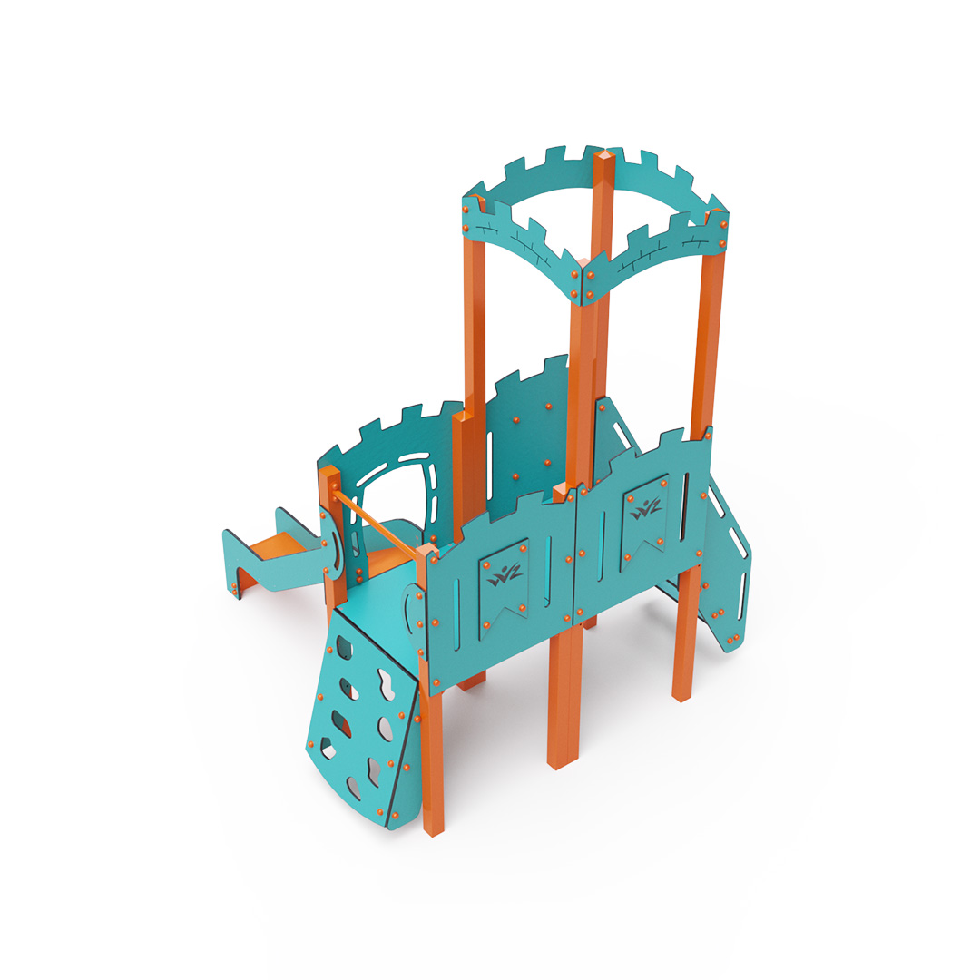 Dvouvěžová kombinovaná sestava - věž s hradbami a nízká věž, na kterou děti vylezou po schůdcích nebo po lezecké stěně s úchyty a mohou se spustit dolů po skluzavce. Hrát se mohou také v tunelu, který vede pod věží. Ocelová konstrukce je odolná vůči povětrnostním vlivům díky zinkování a lakování odolnou práškovou barvou. Použitý HPL materiál je chemicky odolný, odolný vůči UV záření – stálobarevný, netoxický, recyklovatelný a nelámavý. Nehrozí tak poranění dětí ostrými hranami nebo úlomky. Všechny spoje jsou nerezové a zakryté plastovými krytkami pro zvýšení životnosti a bezpečnosti.