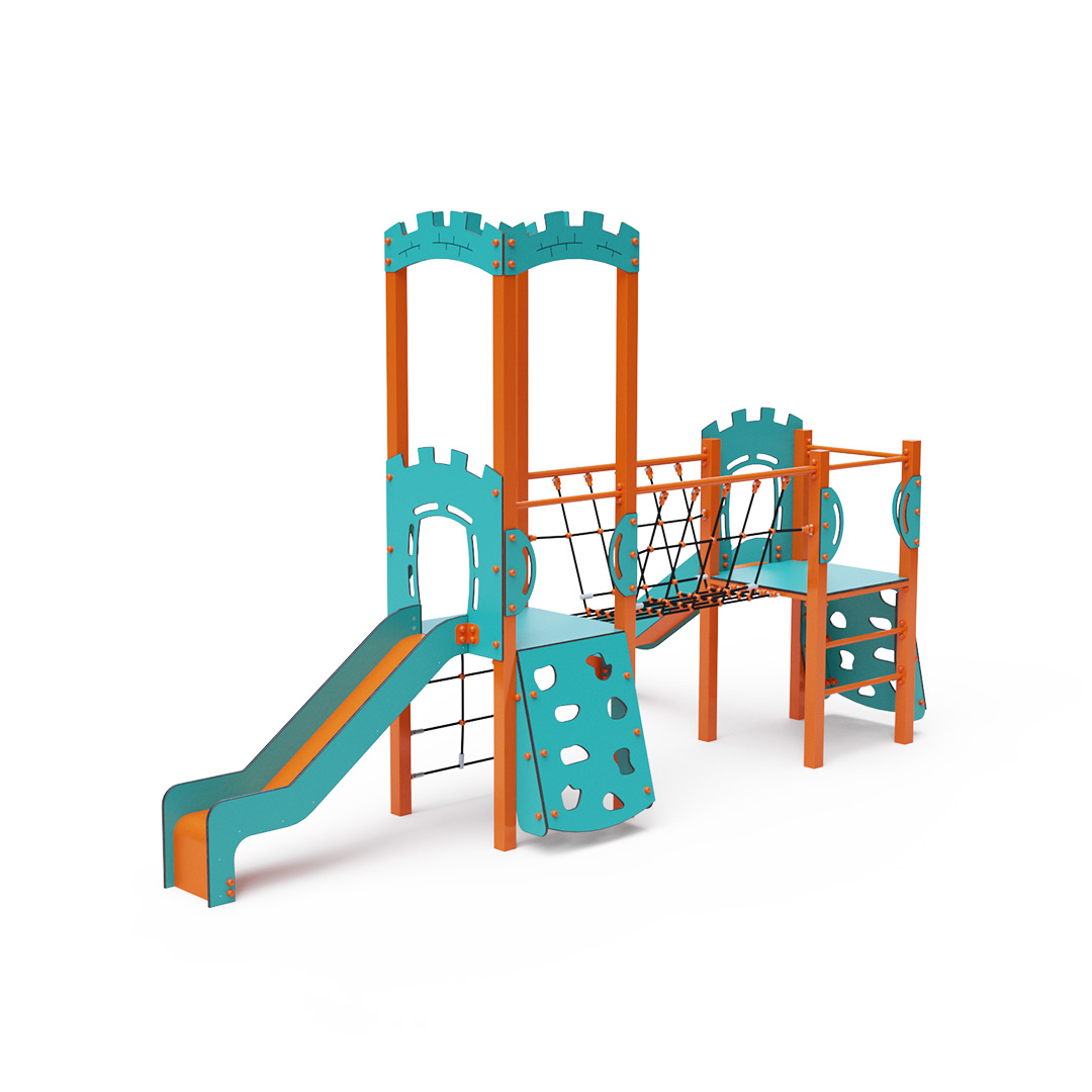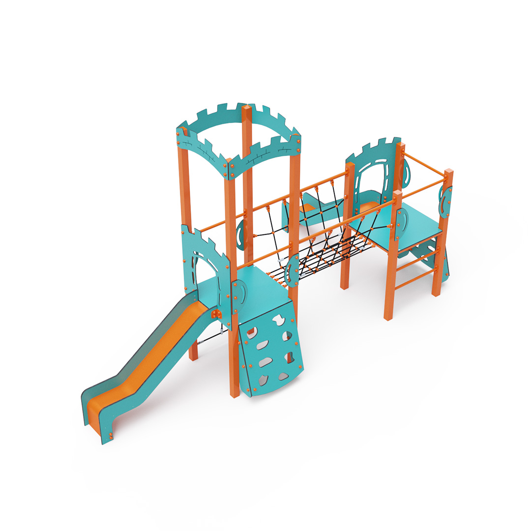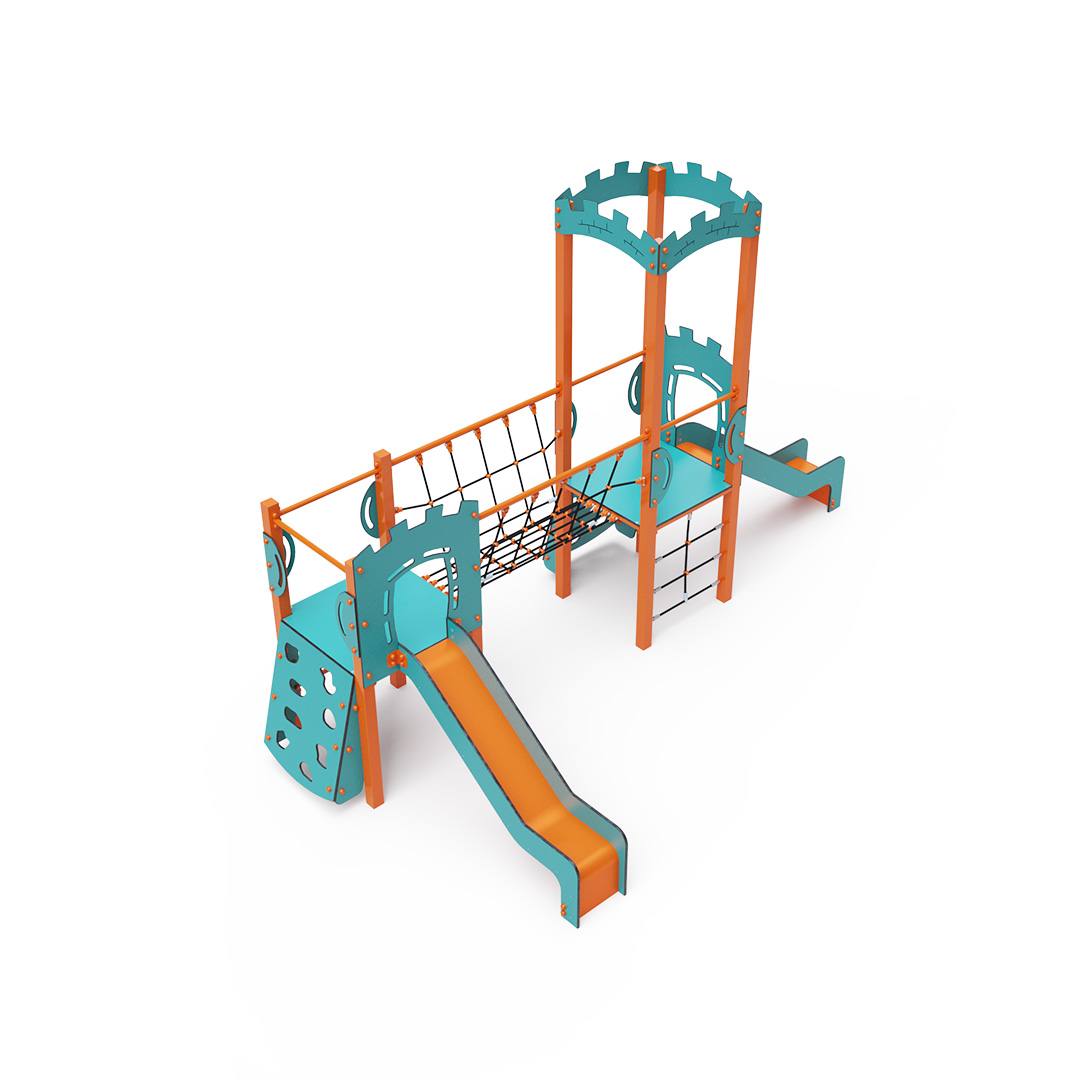 Dvouvěžová kombinovaná sestava - dvě věže propojené lanovým můstkem. Na sestavu děti vylezou po jedné ze dvou lezeckých stěn s úchyty, po lanové síti nebo žebříku a dolů se mohou spustit po jedné ze dvou skluzavek. Tyrkysově-oranžový design už z dálky láká ke hře. Ocelová konstrukce je odolná vůči povětrnostním vlivům díky žárovému zinkování a lakování odolnou práškovou barvou. Použitý HPL materiál je chemicky odolný, odolný vůči UV záření – stálobarevný, netoxický, recyklovatelný a nelámavý. Nehrozí tak poranění dětí ostrými hranami nebo úlomky. Lana jsou vyrobena z polyesterových vláken, která jsou vinuta kolem středové výztuže. Tato konstrukce lana zvyšuje jeho pevnost a odolnost proti mechanickému namáhání. Samotný polyester je odolný vůči mikroorganismům, povětrnostním vlivům, rychle schne po dešti, je stálobarevný a vyznačuje se vysokou pevností. Všechny spoje jsou nerezové a zakryté plastovými krytkami pro zvýšení životnosti a bezpečnosti.