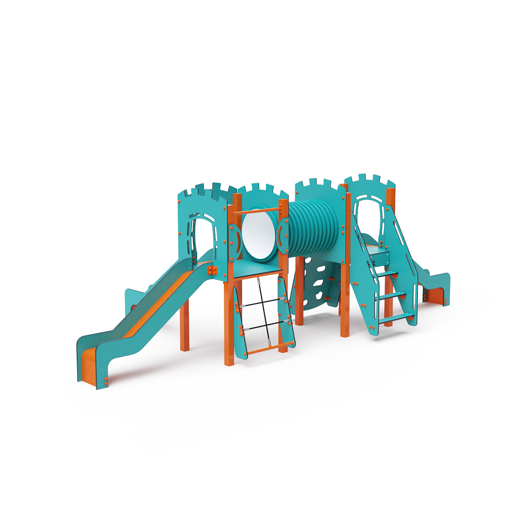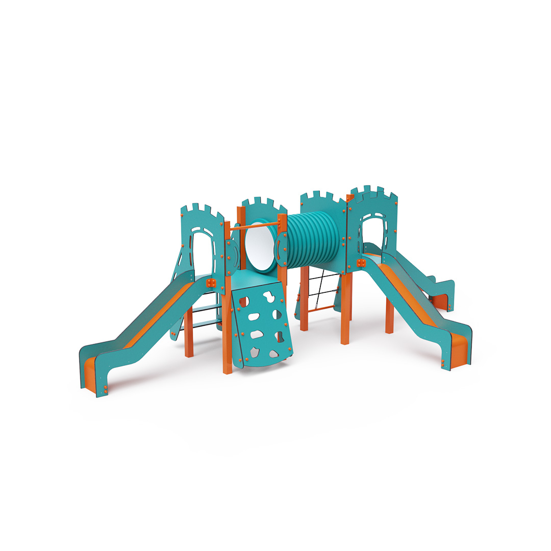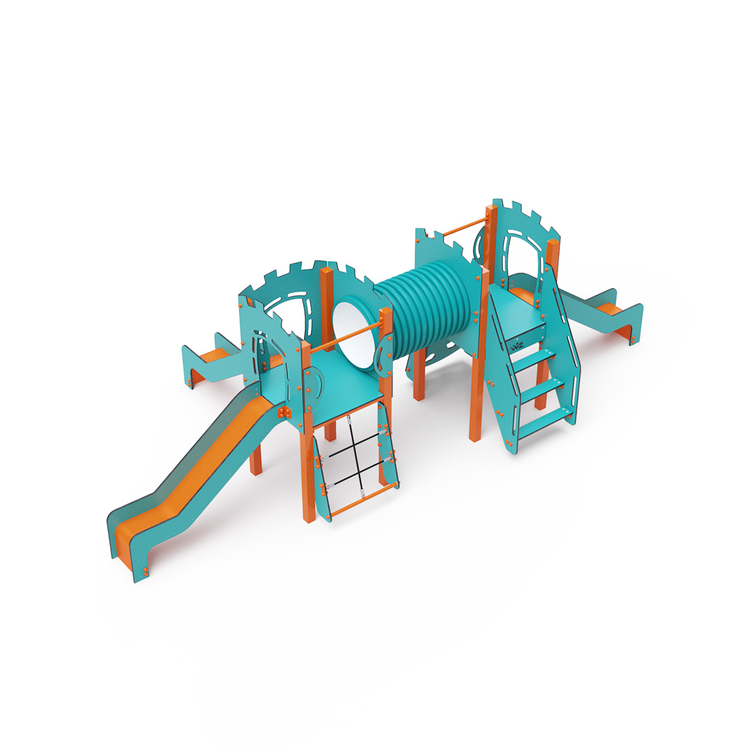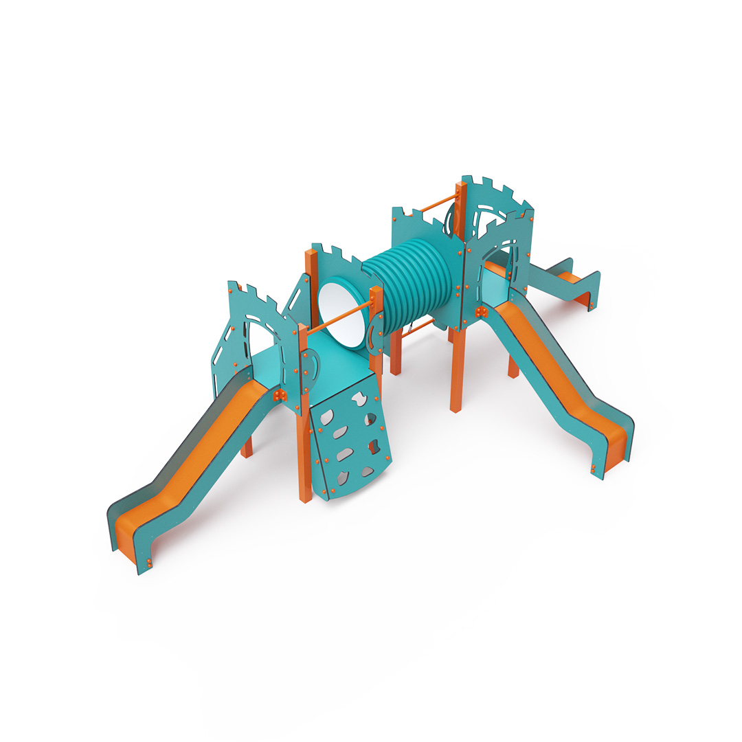 Dvouvěžová kombinovaná sestava - dvě věže propojené tunelem. Na sestavu děti vylezou po schůdcích, po lezecké stěně s úchyty nebo po obloukové lanové síti a dolů se mohou spustit po jedné ze tří skluzavek. Tyrkysově-oranžový design už z dálky láká ke hře. Ocelová konstrukce je odolná vůči povětrnostním vlivům díky žárovému zinkování a lakování odolnou práškovou barvou. Použitý HPL plast je chemicky odolný, odolný vůči UV záření – stálobarevný, netoxický, recyklovatelný a nelámavý. Nehrozí tak poranění dětí ostrými hranami nebo úlomky. Lana jsou vyrobena z polyesterových vláken, která jsou vinuta kolem středové výztuže. Tato konstrukce lana zvyšuje jeho pevnost a odolnost proti mechanickému namáhání. Samotný polyester je odolný vůči mikroorganismům, povětrnostním vlivům, rychle schne po dešti, je stálobarevný a vyznačuje se vysokou pevností. Všechny spoje jsou nerezové a zakryté plastovými krytkami pro zvýšení životnosti a bezpečnosti.