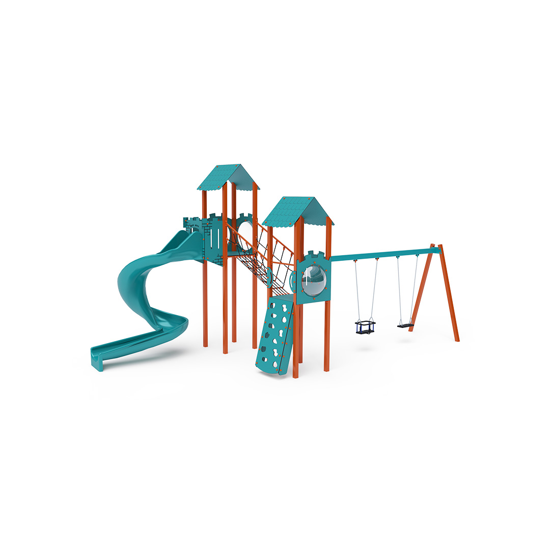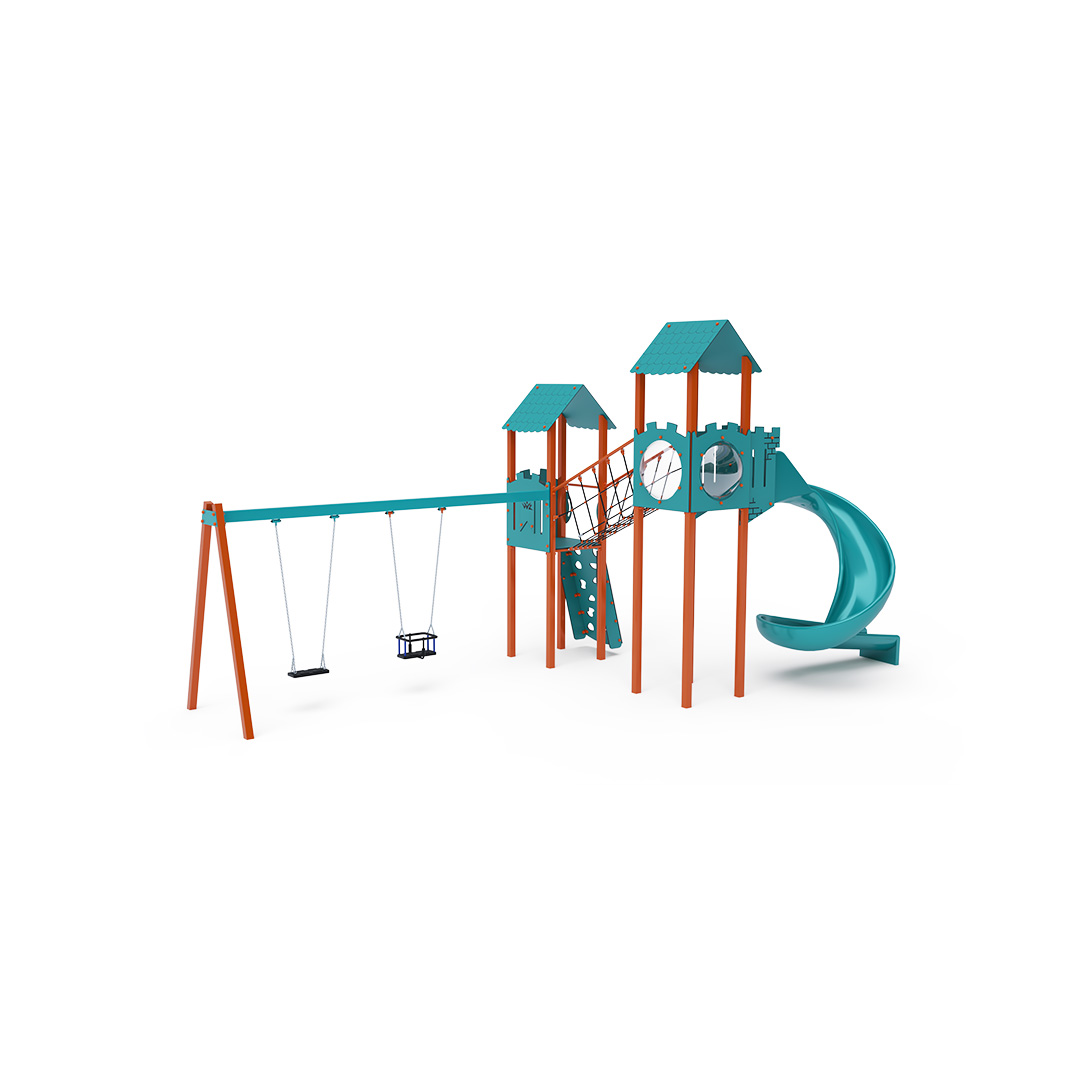 Dvouvěžová kombinovaná sestava – věže se stříškami jsou propojeny šikmým lanovým mostem. Děti na sestavu vylezou po šikmé lezecké stěně a sjíždějí dolů po otevřené tobogánové skluzavce. Součástí sestavy je také závěsná houpačka se dvěma sedátky – klasickými, baby nebo jejich kombinací. Tyrkysovo-oranžový design už z dálky láká děti k hraní na dětském hřišti.