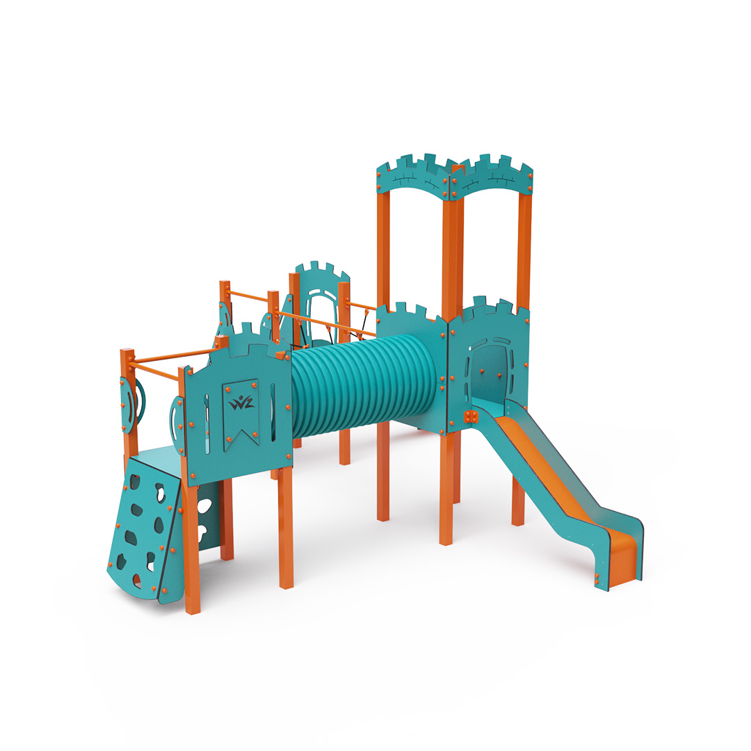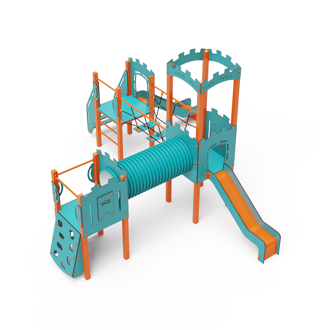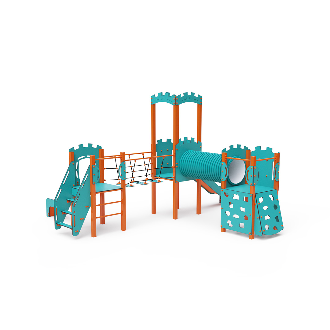 Třívěžová kombinovaná sestava ve tvaru písmene L. Dvě věže jsou propojeny se střední věží s hradbami lanovým balančním můstkem a tunelem. Na sestavu děti vylezou po schůdcích, po šikmé lezecké stěně s úchyty nebo po žebříku a dolů se mohou spustit po jedné ze dvou skluzavek. Tyrkysově-oranžový design už z dálky láká ke hře. Ocelová konstrukce je odolná vůči povětrnostním vlivům díky žárovému zinkování a lakování odolnou práškovou barvou. Použitý HPL materiál je chemicky odolný, odolný vůči UV záření – stálobarevný, netoxický, recyklovatelný a nelámavý. Nehrozí tak poranění dětí ostrými hranami nebo úlomky. Lana jsou vyrobena z polyesterových vláken, která jsou vinuta kolem středové výztuže. Tato konstrukce lana zvyšuje jeho pevnost a odolnost proti mechanickému namáhání. Samotný polyester je odolný vůči mikroorganismům, povětrnostním vlivům, rychle schne po dešti, je stálobarevný a vyznačuje se vysokou pevností. Všechny spoje jsou nerezové a zakryté plastovými krytkami pro zvýšení životnosti a bezpečnosti.
