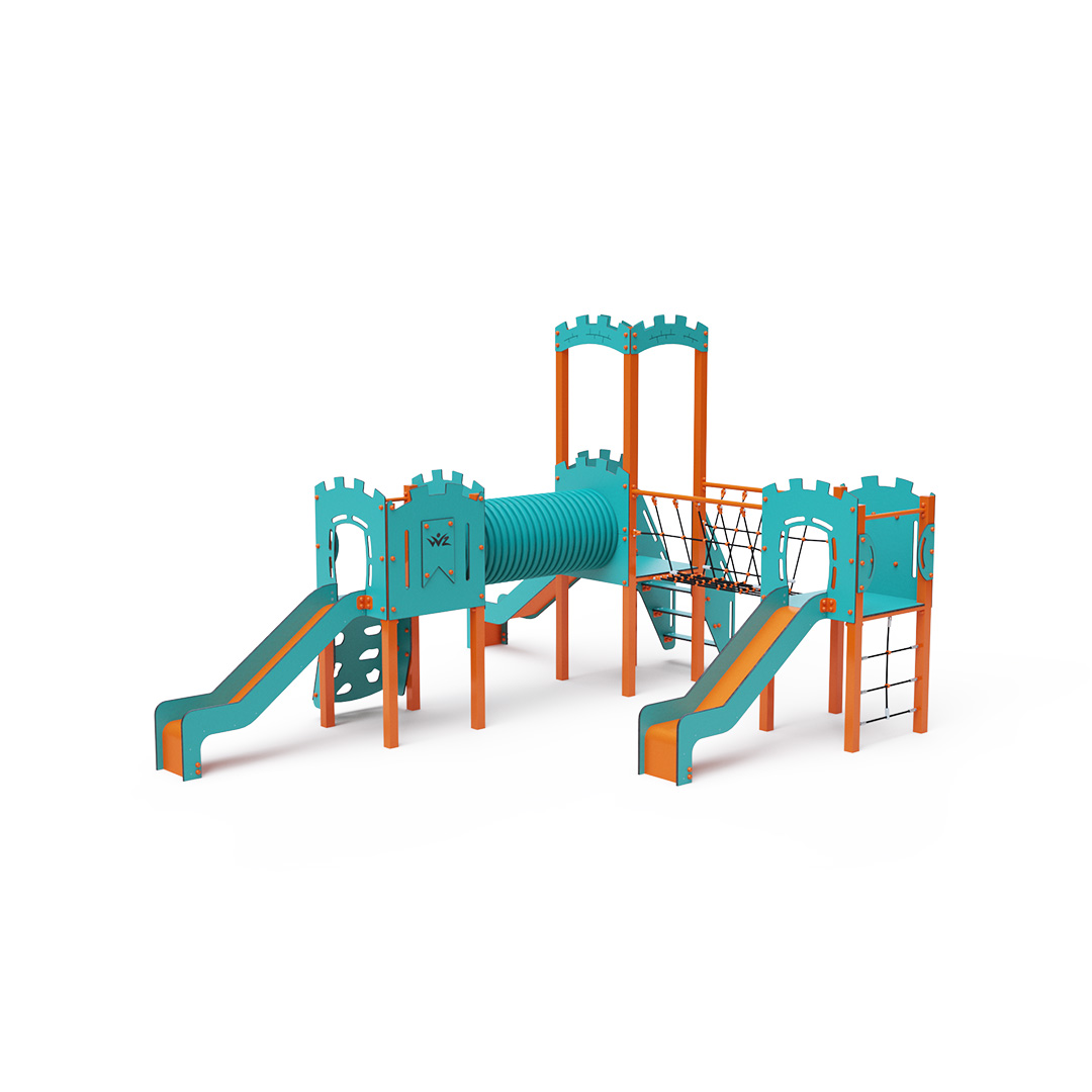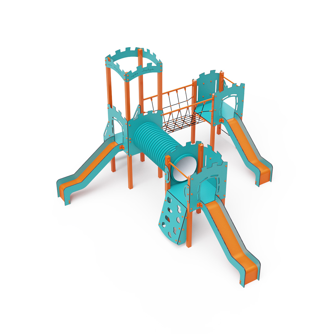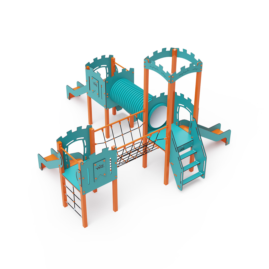 Třívěžová kombinovaná sestava ve tvaru písmene L. Dvě věže jsou propojeny se střední věží s hradbami lanovým můstkem a tunelem. Na sestavu děti vylezou po schůdcích, po šikmé lezecké stěně s úchyty a lanem nebo po lanové síti a dolů se mohou spustit po jedné ze tří skluzavek. Tyrkysově-oranžový design už z dálky láká ke hře. Ocelová konstrukce je odolná vůči povětrnostním vlivům díky žárovému zinkování a lakování odolnou práškovou barvou. Použitý HPL materiál je chemicky odolný, odolný vůči UV záření – stálobarevný, netoxický, recyklovatelný a nelámavý. Nehrozí tak poranění dětí ostrými hranami nebo úlomky. Lana jsou vyrobena z polyesterových vláken, která jsou vinuta kolem středové výztuže. Tato konstrukce lana zvyšuje jeho pevnost a odolnost proti mechanickému namáhání. Samotný polyester je odolný vůči mikroorganismům, povětrnostním vlivům, rychle schne po dešti, je stálobarevný a vyznačuje se vysokou pevností. Všechny spoje jsou nerezové a zakryté plastovými krytkami pro zvýšení životnosti a bezpečnosti.