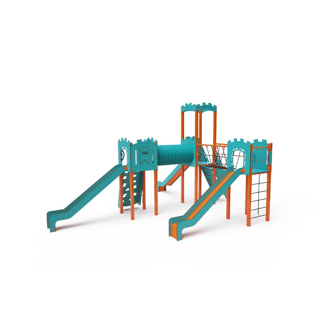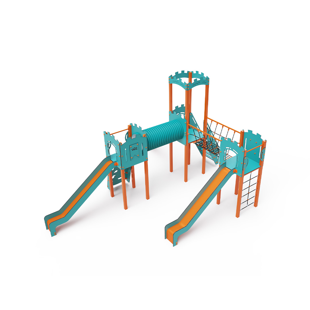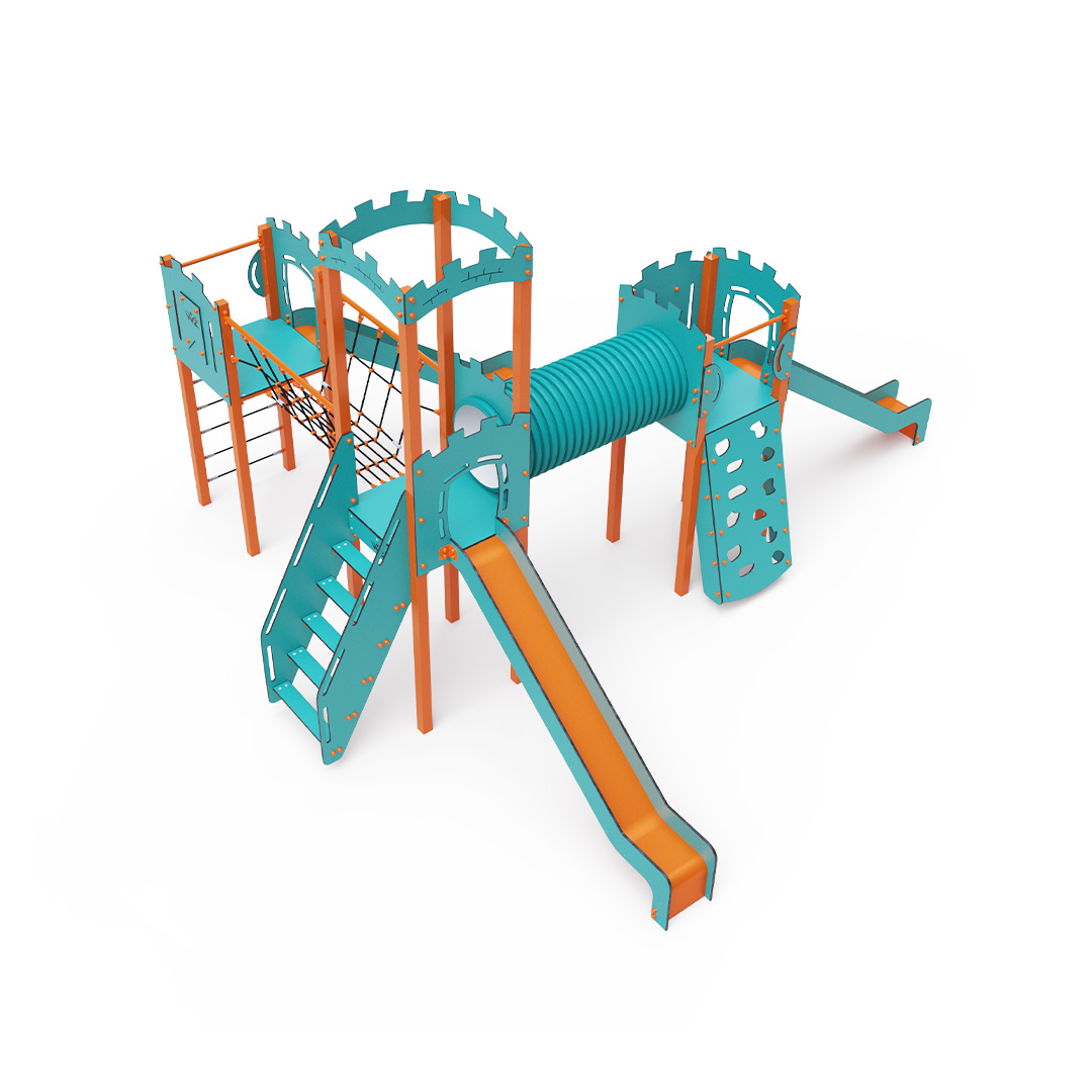 Třívěžová kombinovaná sestava ve tvaru písmene L. Dvě věže jsou propojeny se střední věží s hradbami lanovým můstkem a tunelem. Na sestavu děti vylezou po schůdcích, po šikmé lezecké stěně s úchyty a lanem nebo po lanové síti a dolů se mohou spustit po jedné ze tří skluzavek. Tyrkysově-oranžový design už z dálky láká ke hře. Ocelová konstrukce je odolná vůči povětrnostním vlivům díky žárovému zinkování a lakování odolnou práškovou barvou. Použitý HPL materiál je chemicky odolný, odolný vůči UV záření – stálobarevný, netoxický, recyklovatelný a nelámavý. Nehrozí tak poranění dětí ostrými hranami nebo úlomky. Lana jsou vyrobena z polyesterových vláken, která jsou vinuta kolem středové výztuže. Tato konstrukce lana zvyšuje jeho pevnost a odolnost proti mechanickému namáhání. Samotný polyester je odolný vůči mikroorganismům, povětrnostním vlivům, rychle schne po dešti, je stálobarevný a vyznačuje se vysokou pevností. Všechny spoje jsou nerezové a zakryté plastovými krytkami pro zvýšení životnosti a bezpečnosti.