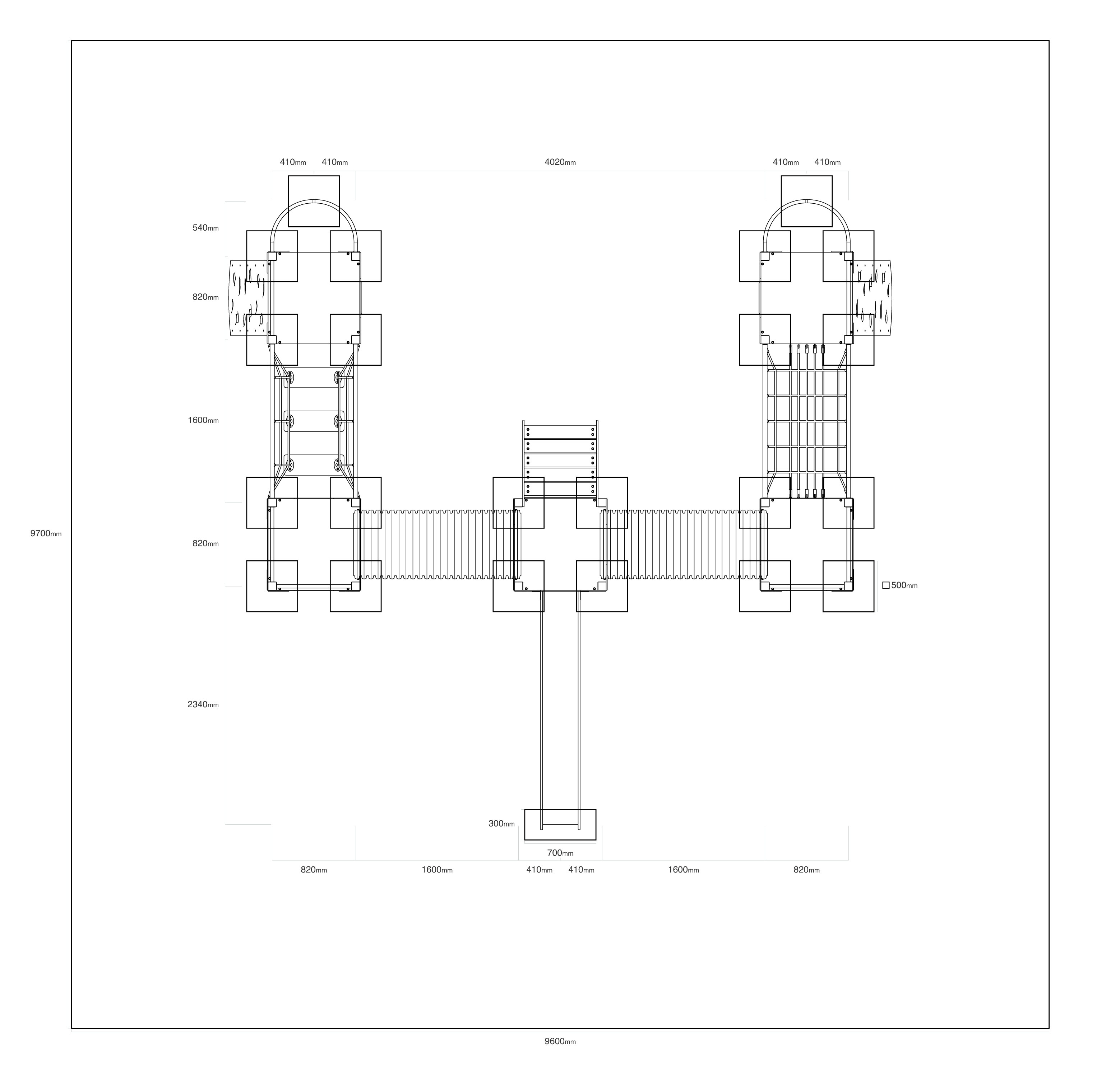 Dopadní plocha: 9,7 x 9,6 m<1 />Materiál: Žárově zinkovaná a práškovaná ocel, HPL materiál tl. 6, 10, 15, 19, HDPE plast, polyesterová lana, nerezový spojovací materiál