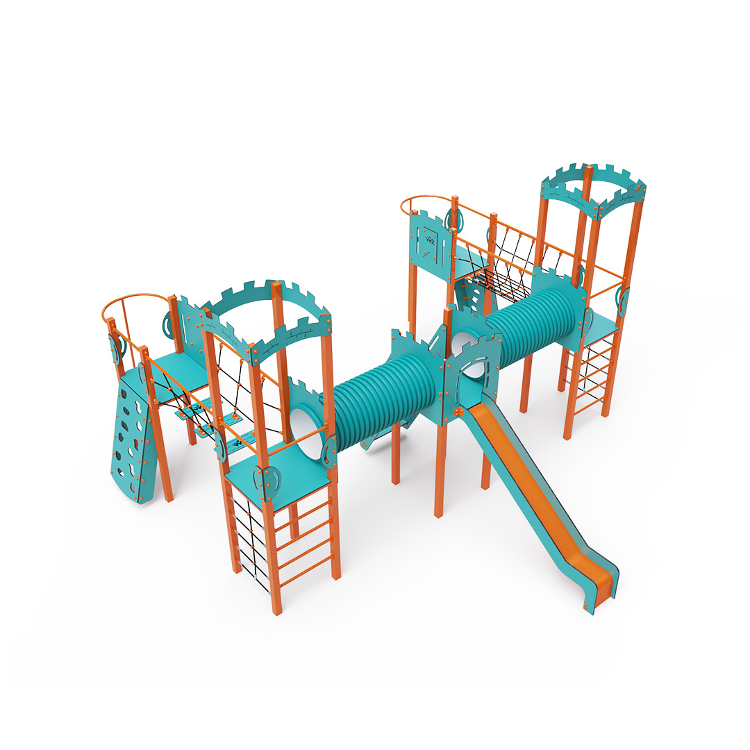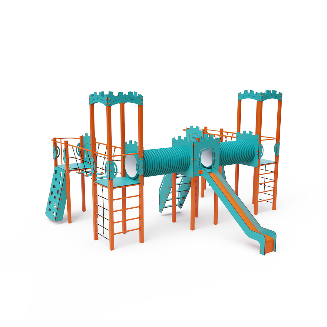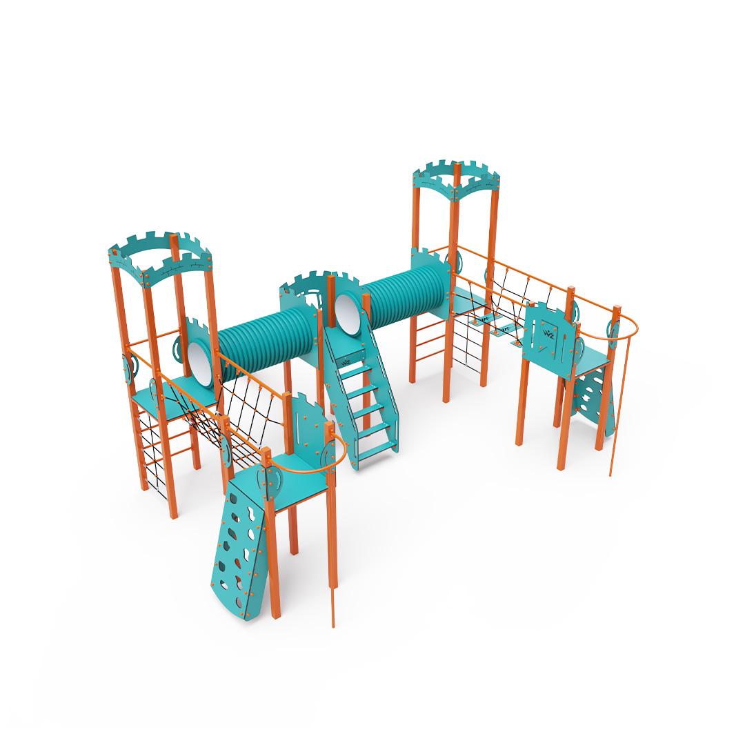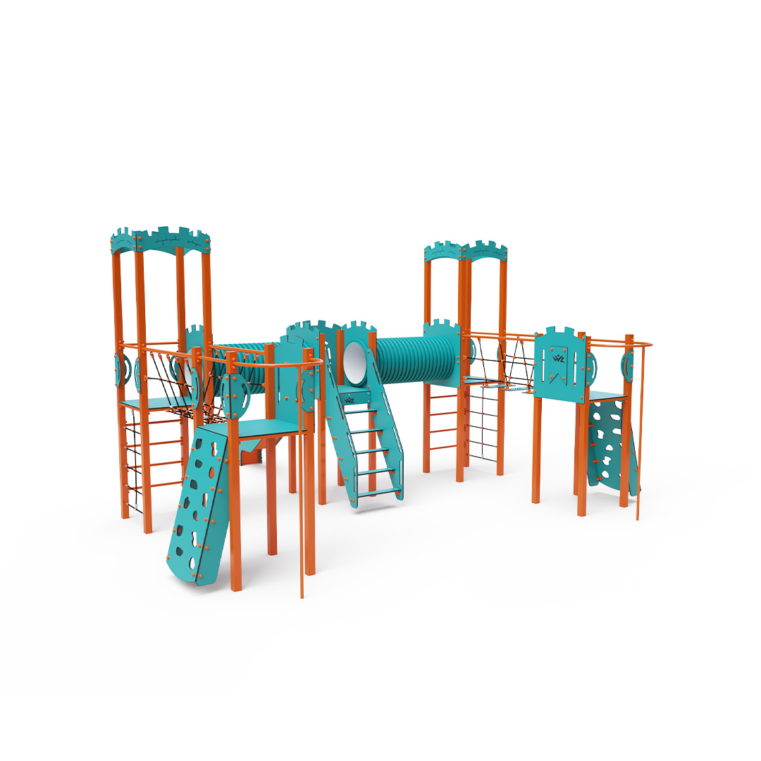 Pětvěžová kombinovaná sestava. Dvě věže s hradbami a tři nízké věže jsou propojeny lanovým můstkem, lanovým balančním můstkem a dvěma tunely. Sestava obsahuje schůdky, šikmé lezecké stěny, lezecké tyče, kolmé lanové sítě, žebříky a skluzavku. Tyrkysově-oranžový design už z dálky láká ke hře. Ocelová konstrukce je odolná vůči povětrnostním vlivům díky žárovému zinkování a lakování odolnou práškovou barvou. Použitý HPL materiál je chemicky odolný, odolný vůči UV záření – stálobarevný, netoxický, recyklovatelný a nelámavý. Nehrozí tak poranění dětí ostrými hranami nebo úlomky. Lana jsou vyrobena z polyesterových vláken, která jsou vinuta kolem středové výztuže. Tato konstrukce lana zvyšuje jeho pevnost a odolnost proti mechanickému namáhání. Samotný polyester je odolný vůči mikroorganismům, povětrnostním vlivům, rychle schne po dešti, je stálobarevný a vyznačuje se vysokou pevností. Všechny spoje jsou nerezové a zakryté plastovými krytkami pro zvýšení životnosti a bezpečnosti.