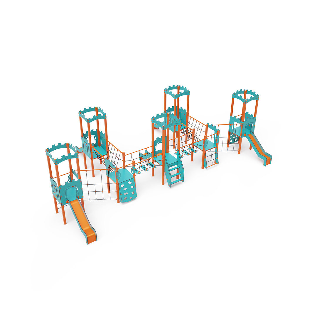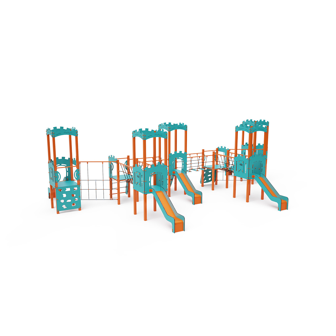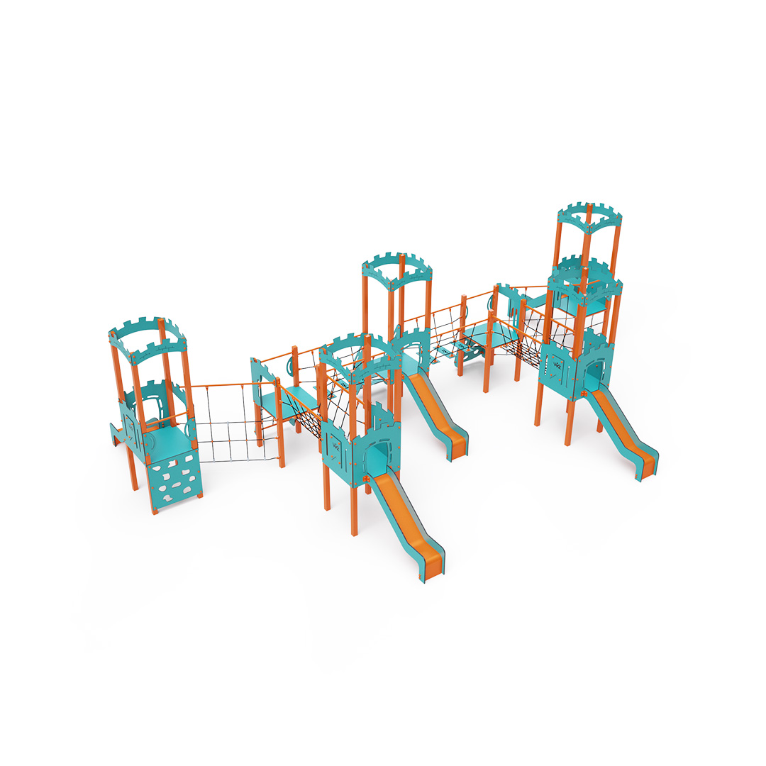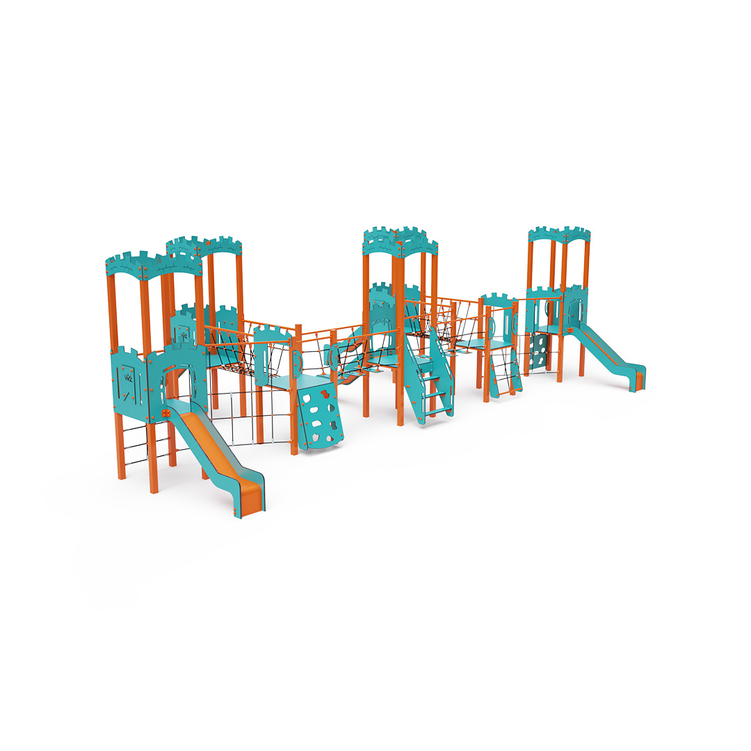 Sedmivěžová kombinovaná sestava. Čtyři věže s hradbami a tři nízké věže jsou propojeny lanovým můstkem, lanovým balančním můstkem a diagonální lanovou stěnou. Sestava obsahuje schůdky, šikmou lezeckou stěnu, šikmou lezeckou stěnu s lanem, kolmou lezeckou stěnu, šikmou lanovou síť, kolmou lanovou síť a pět skluzavek. Tyrkysově-oranžový design už z dálky láká ke hře. Ocelová konstrukce je odolná vůči povětrnostním vlivům díky žárovému zinkování a lakování odolnou práškovou barvou. Použitý HPL materiál je chemicky odolný, odolný vůči UV záření – stálobarevný, netoxický, recyklovatelný a nelámavý. Nehrozí tak poranění dětí ostrými hranami nebo úlomky. Lana jsou vyrobena z polyesterových vláken, která jsou vinuta kolem středové výztuže. Tato konstrukce lana zvyšuje jeho pevnost a odolnost proti mechanickému namáhání. Samotný polyester je odolný vůči mikroorganismům, povětrnostním vlivům, rychle schne po dešti, je stálobarevný a vyznačuje se vysokou pevností. Všechny spoje jsou nerezové a zakryté plastovými krytkami pro zvýšení životnosti a bezpečnosti.