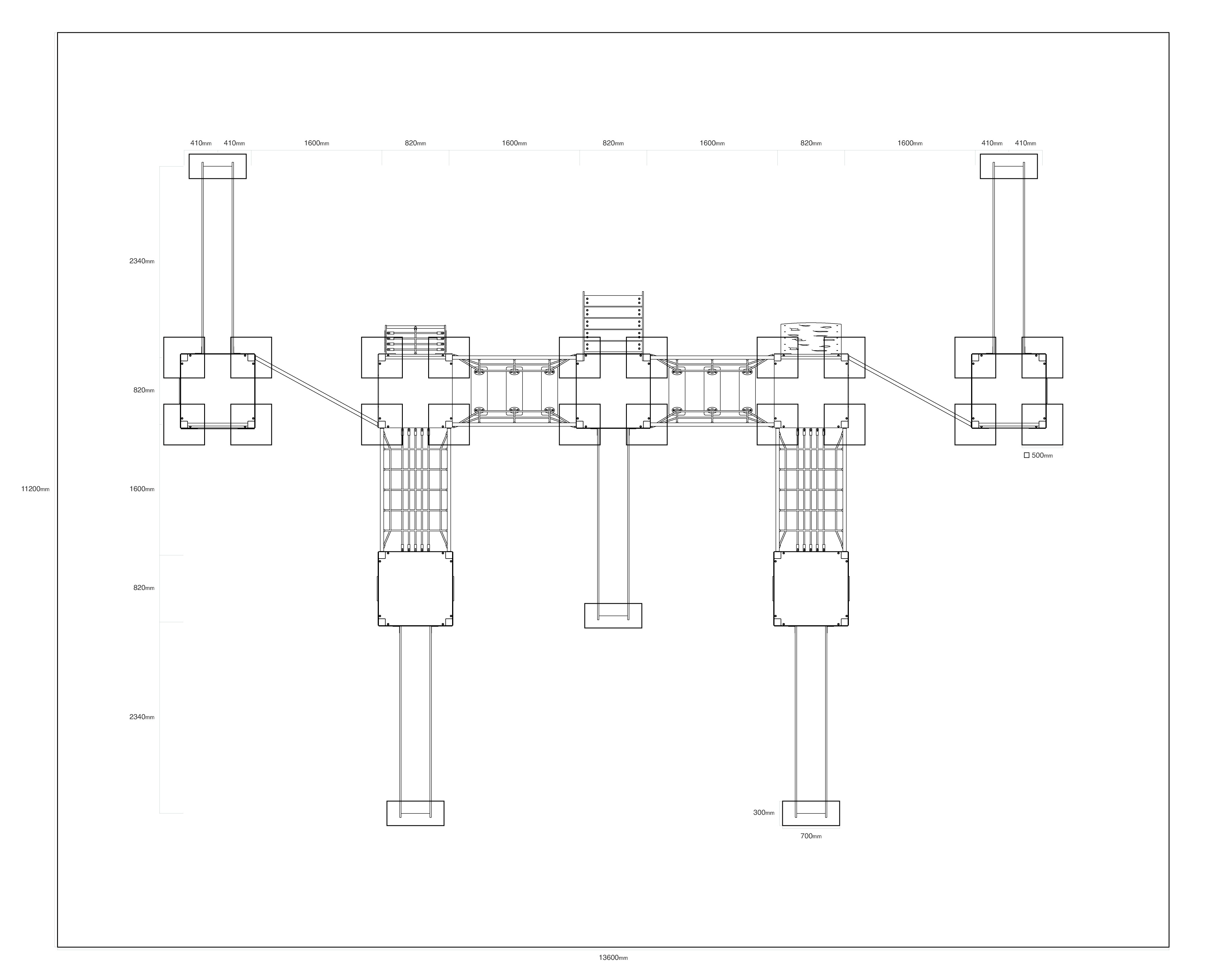 Dopadová plocha: 13,6 x 11,6 m />Materiál: Žárově zinkovaná a práškovaná ocel, HPL materiál tl. 6, 10, 15, 19, HDPE plast, polyesterová lana, nerezový spojovací materiál