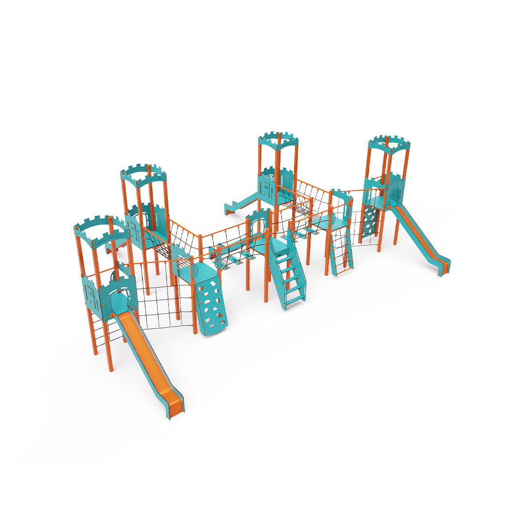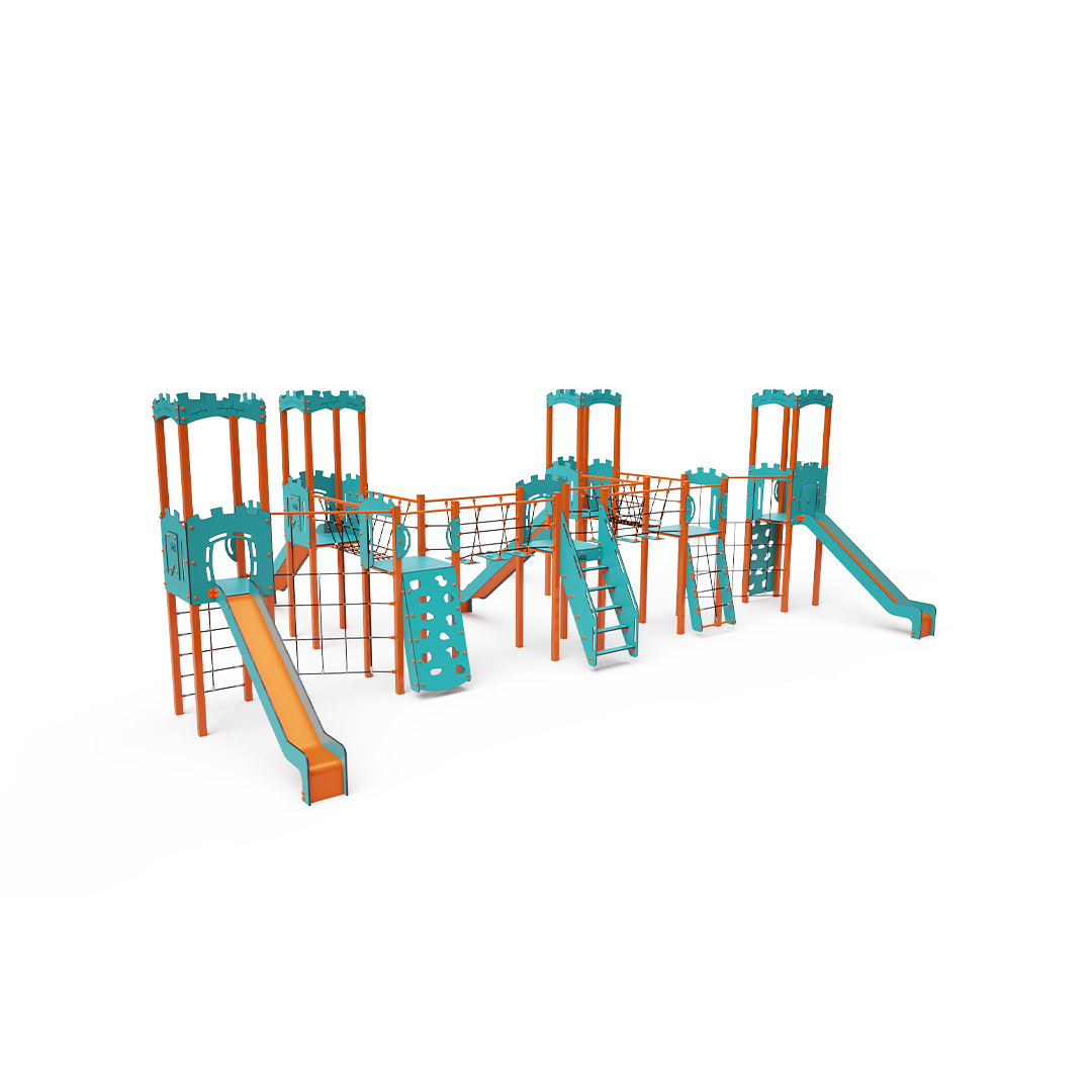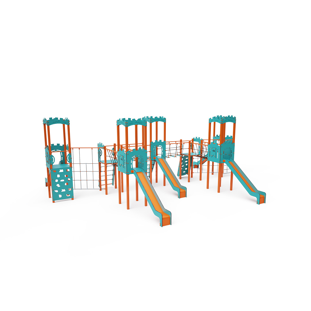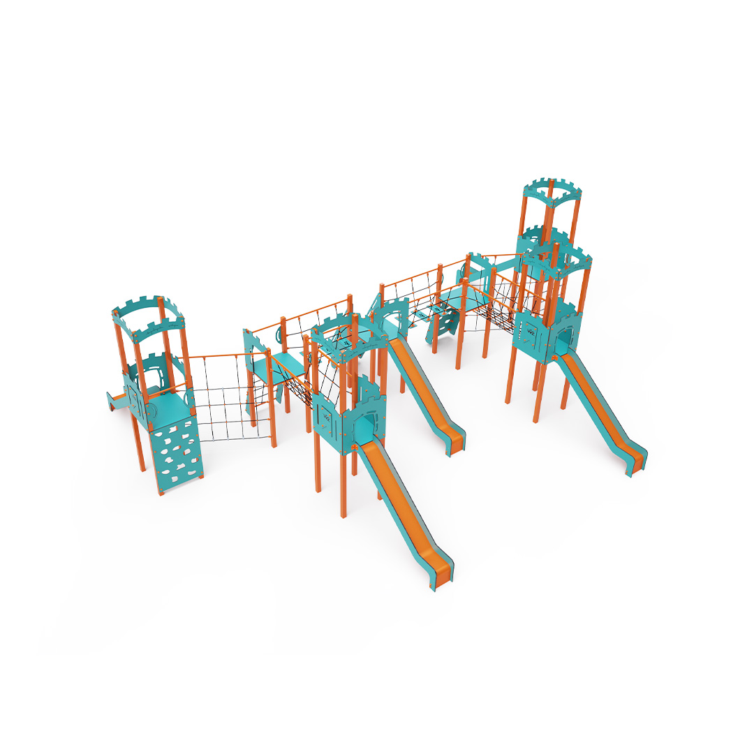 Sedmivěžová kombinovaná sestava. Čtyři věže s hradbami a tři nízké věže jsou propojeny lanovým můstkem, lanovým balančním můstkem a diagonální lanovou stěnou. Sestava obsahuje schůdky, šikmou lezeckou stěnu, šikmou lezeckou stěnu s lanem, kolmou lezeckou stěnu, šikmou lanovou síť, kolmou lanovou síť a pět skluzavek. Tyrkysově-oranžový design už z dálky láká ke hře. Ocelová konstrukce je odolná vůči povětrnostním vlivům díky žárovému zinkování a lakování odolnou práškovou barvou. Použitý HPL materiál je chemicky odolný, odolný vůči UV záření – stálobarevný, netoxický, recyklovatelný a nelámavý. Nehrozí tak poranění dětí ostrými hranami nebo úlomky. Lana jsou vyrobena z polyesterových vláken, která jsou vinuta kolem středové výztuže. Tato konstrukce lana zvyšuje jeho pevnost a odolnost proti mechanickému namáhání. Samotný polyester je odolný vůči mikroorganismům, povětrnostním vlivům, rychle schne po dešti, je stálobarevný a vyznačuje se vysokou pevností. Všechny spoje jsou nerezové a zakryté plastovými krytkami pro zvýšení životnosti a bezpečnosti.