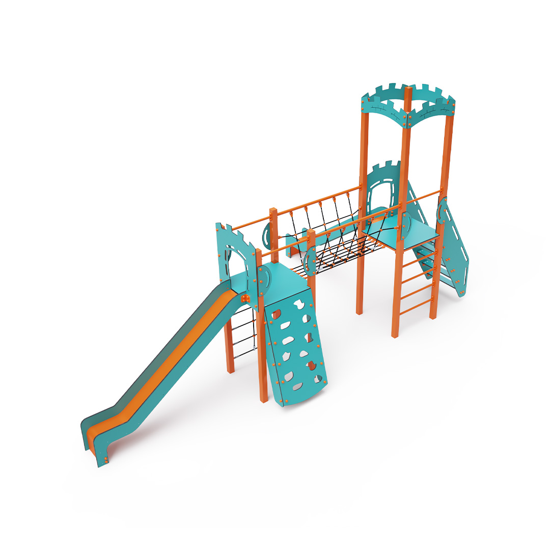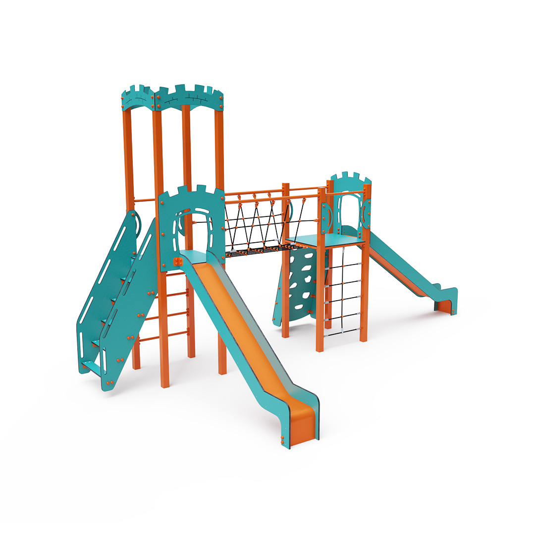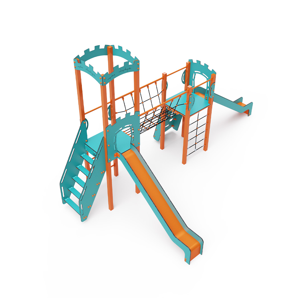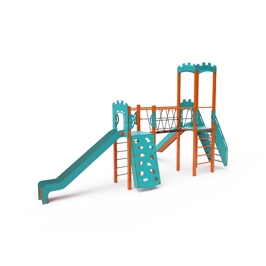 Dvouvěžová kombinovaná sestava - dvě věže propojené lanovým balančním můstkem. Na sestavu děti vylezou po lezecké stěně s úchyty, po žebříku, lanové síti nebo po schůdcích a dolů se mohou spustit po jedné ze dvou skluzavek. Tyrkysově-oranžový design už z dálky láká ke hře. Ocelová konstrukce je odolná vůči povětrnostním vlivům díky žárovému zinkování a lakování odolnou práškovou barvou. Použitý HPL materiál je chemicky odolný, odolný vůči UV záření - stálobarevný, netoxický, recyklovatelný a nelámavý.