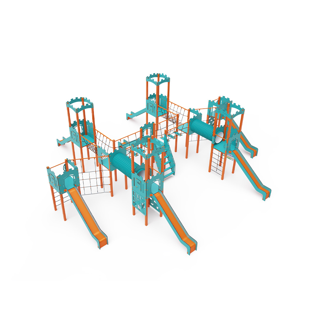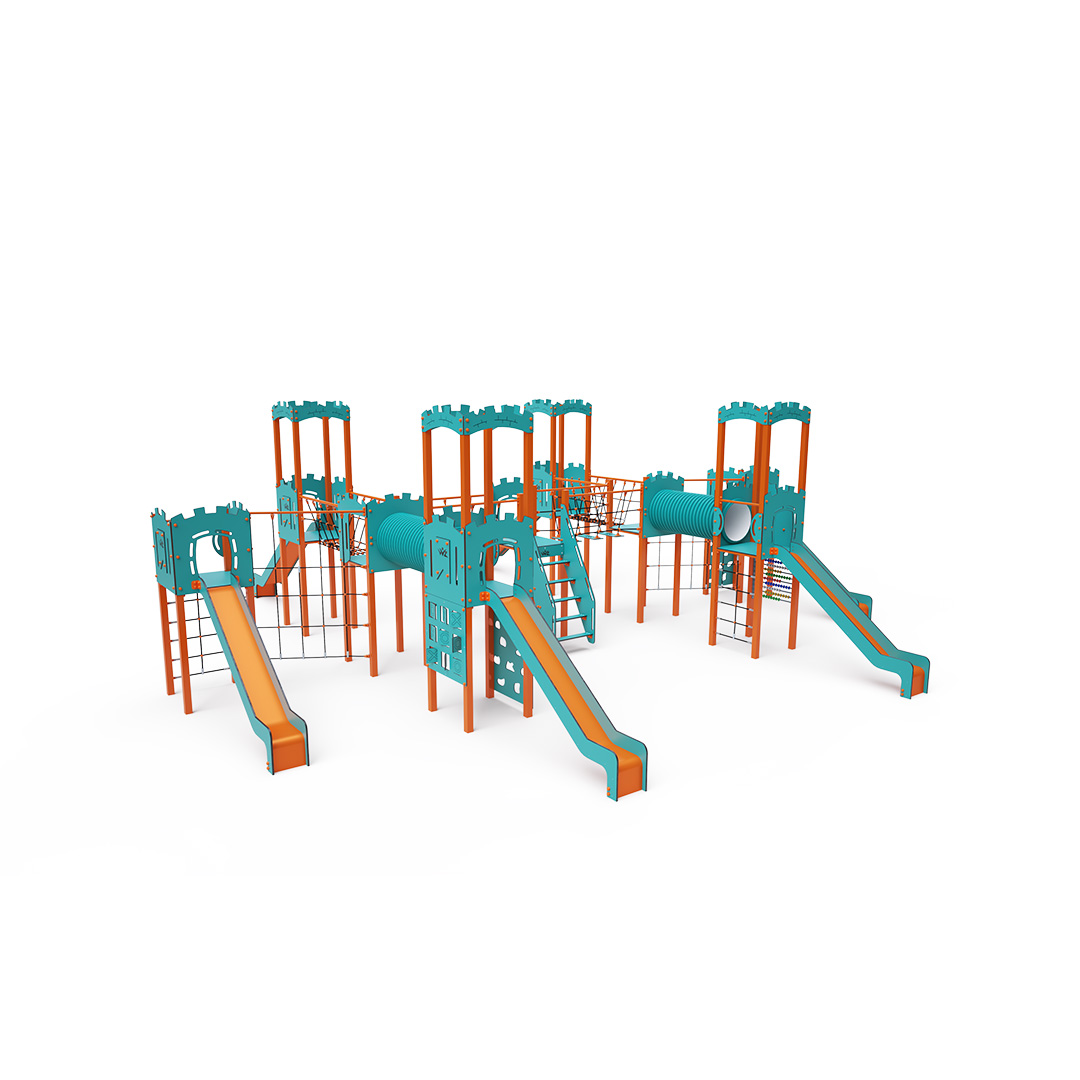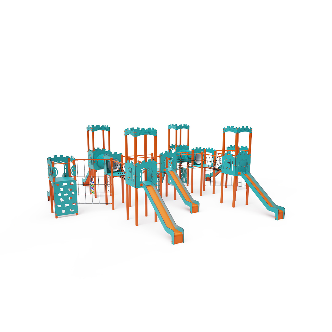 Devítivěžová kombinovaná sestava. Čtyři věže s hradbami a pět nízkých věží jsou propojeny lanovými můstky, lanovými balančními můstky a diagonálními lanovými stěnami. Sestava obsahuje schůdky, kolmou lezeckou stěnu, kolmou lanovou síť, piškvorky, počítadlo a sedm skluzavek. Tyrkysově-oranžový design už z dálky láká ke hře. Ocelová konstrukce je odolná vůči povětrnostním vlivům díky žárovému zinkování a lakování odolnou práškovou barvou. Použitý HPL materiál je chemicky odolný, odolný vůči UV záření -stálobarevný, netoxický, recyklovatelný a nelámavý. Nehrozí tak poranění dětí ostrými hranami nebo úlomky. Lana jsou vyrobena z polyesterových vláken, která jsou vinuta kolem středové výztuže. Tato konstrukce lana zvyšuje jeho pevnost a odolnost proti mechanickému namáhání. Samotný polyester je odolný vůči mikroorganismům, povětrnostním vlivům, rychle schne po dešti, je stálobarevný a vyznačuje se vysokou pevností. Všechny spoje jsou nerezové a zakryté plastovými krytkami pro zvýšení životnosti a bezpečnosti.