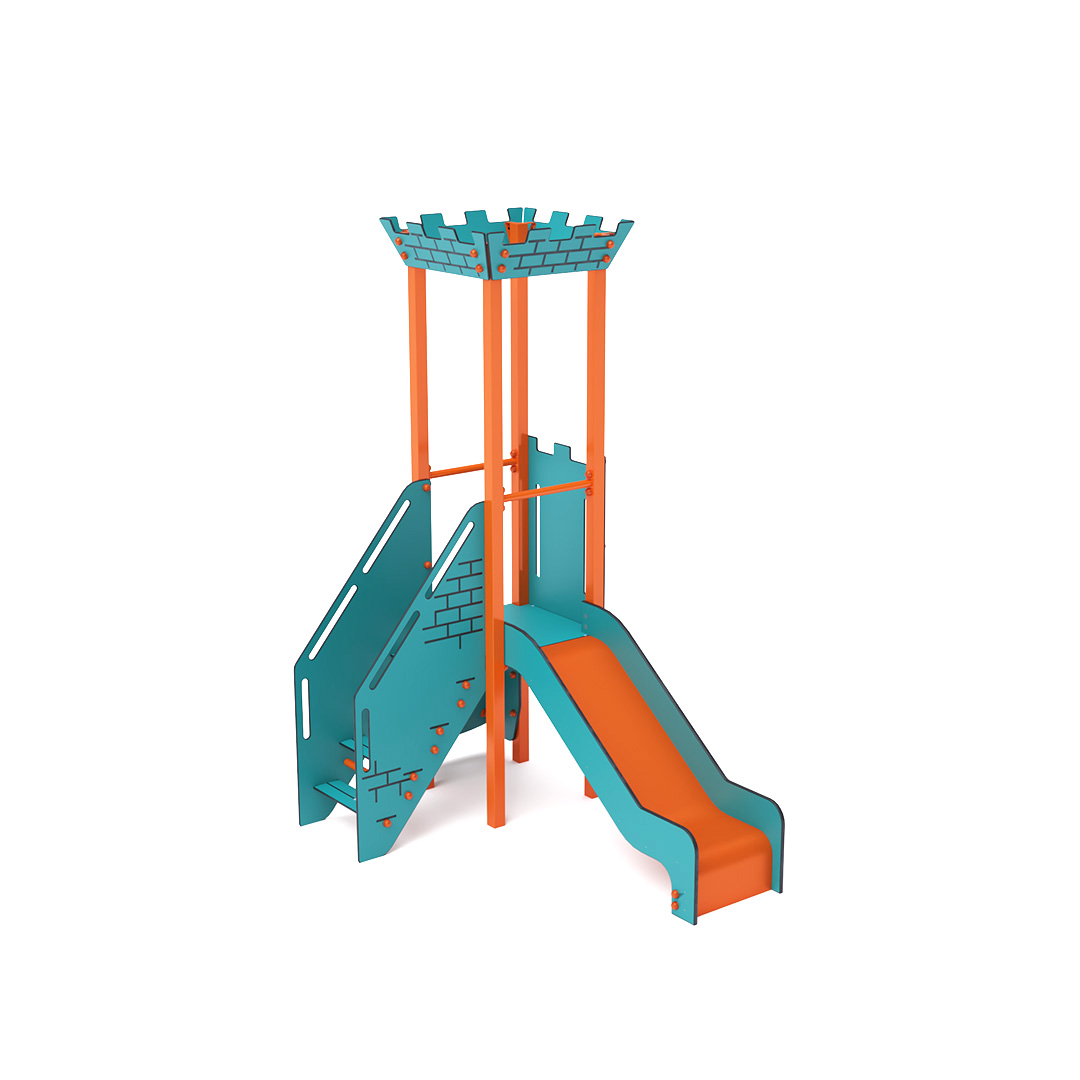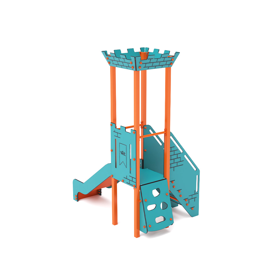 Jednověžová kombinovaná sestava mini – věž s cimbuřím, na kterou děti vylezou po šikmé lezecké stěně nebo schodišťovém výstupu a dolů se mohou spustit po skluzavce. Tyrkysovo-oranžový design láká ke hře už z dálky. Ocelová konstrukce je odolná vůči povětrnostním vlivům díky žárovému zinkování a lakování odolnou práškovou barvou. Použitý HPL materiál je chemicky odolný, odolný vůči UV záření – stálobarevný, netoxický, recyklovatelný a nelámavý. Nehrozí tak poranění dětí ostrými hranami nebo úlomky. Všechny spoje jsou nerezové a zakryté plastovými krytkami pro zvýšení životnosti a bezpečnosti.