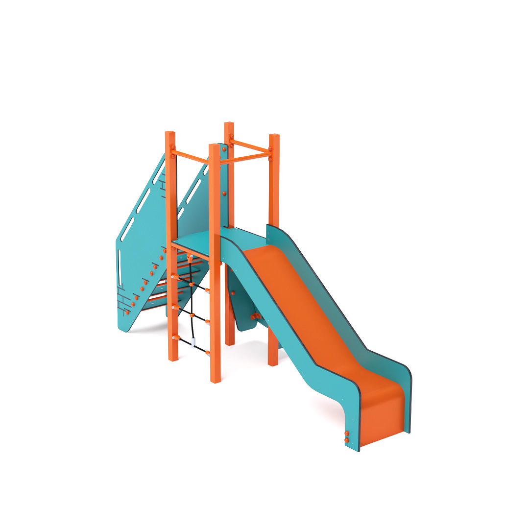 Jednověžová kombinovaná sestava mini – nízká věž, na kterou děti vylezou po kolmé lanové stěně, šikmé lezecké stěně nebo po schodišťovém výstupu. Dolů se mohou sklouznout po skluzavce. Tyrkysovo-oranžový design láká ke hře už z dálky. Ocelová konstrukce je odolná vůči povětrnostním vlivům díky žárovému zinkování a lakování odolnou práškovou barvou. Použitý HPL materiál je chemicky odolný, odolný vůči UV záření – stálobarevný, netoxický, recyklovatelný a nelámavý. Nevzniká tak riziko poranění dětí ostrými hranami nebo úlomky. Všechny spoje jsou z nerezové oceli a zakryté plastovými krytkami pro zvýšení životnosti a bezpečnosti.