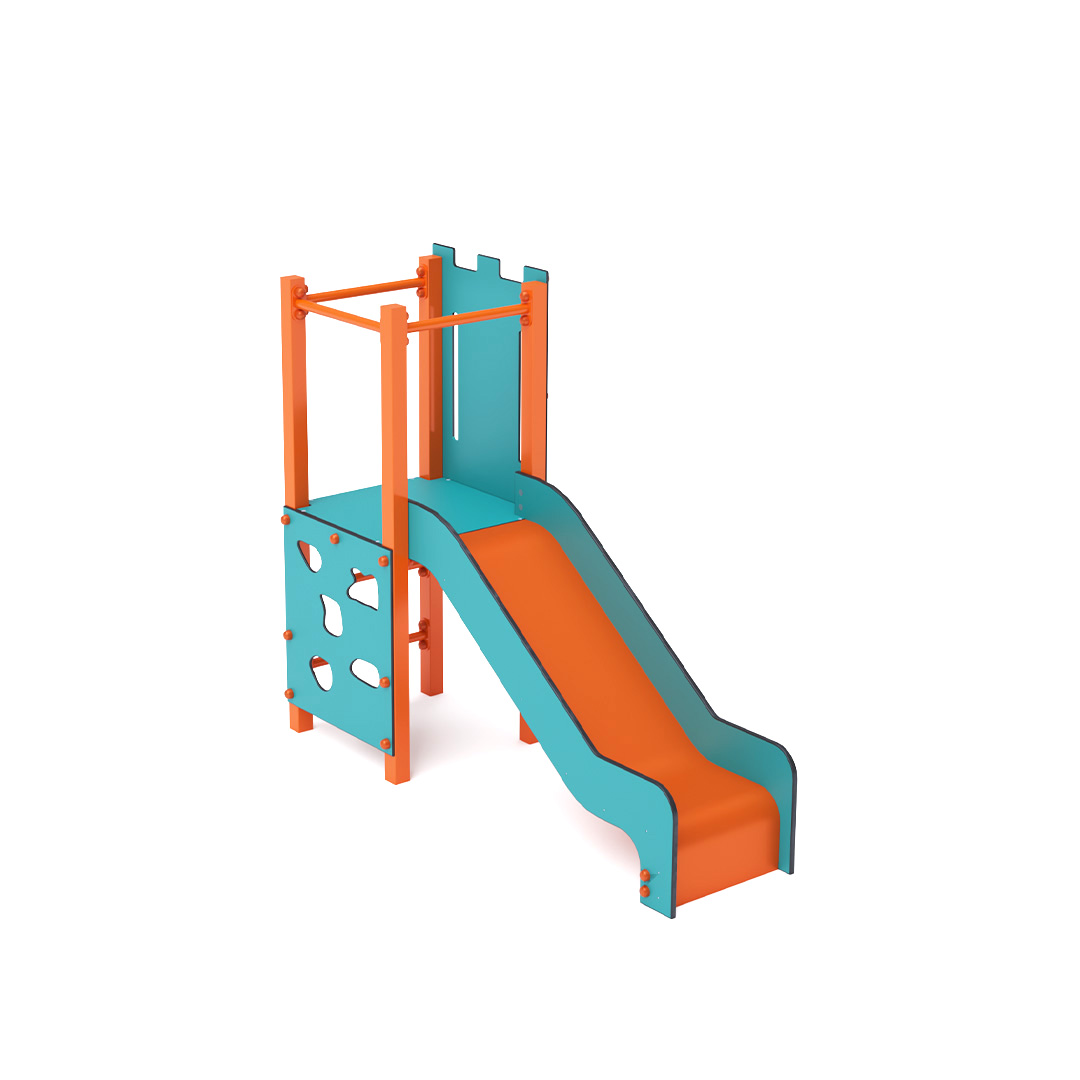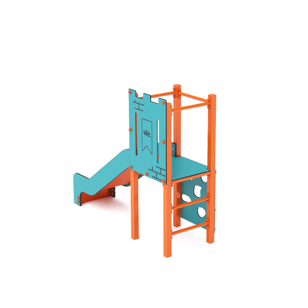 Jednověžová kombinovaná sestava mini – nízká věž, na kterou děti vylezou po kolmém lezeckém stěně nebo žebříkovém výstupu a dolů se mohou spustit po skluzavce. Tyrkysovo-oranžový design láká ke hře již z dálky. Ocelová konstrukce je odolná vůči povětrnostním vlivům díky žárovému zinkování a lakování odolnou práškovou barvou. Použitý HPL materiál je chemicky odolný, odolný vůči UV záření – stálobarevný, netoxický, recyklovatelný a nelámavý. Nedochází k riziku poranění dětí ostrými hranami nebo úlomky. Všechny spoje jsou nerezové a zakryté plastovými krytkami pro zvýšení životnosti a bezpečnosti.