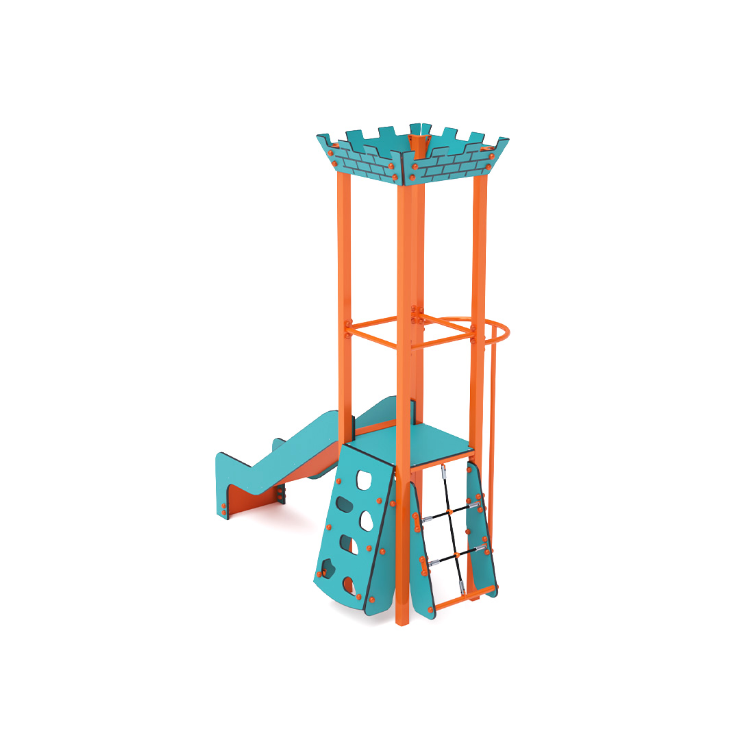 Jednověžová kombinovaná sestava mini – věž s cimbuřím, na kterou děti vylezou po šikmém lanovém výstupu, šikmém lezeckém výstupu a tyči, a dolů se mohou sklouznout po skluzavce. Tyrkysovo-oranžový design láká ke hře už z dálky. Ocelová konstrukce je odolná vůči povětrnostním vlivům díky žárovému zinkování a lakování odolnou práškovou barvou. Použitý HPL materiál je chemicky odolný, odolný vůči UV záření – stálobarevný, netoxický, recyklovatelný a nelámavý. Nevzniká tak riziko poranění dětí ostrými hranami nebo úlomky. Všechny spoje jsou z nerezové oceli a zakryté plastovými krytkami pro zvýšení životnosti a bezpečnosti.
