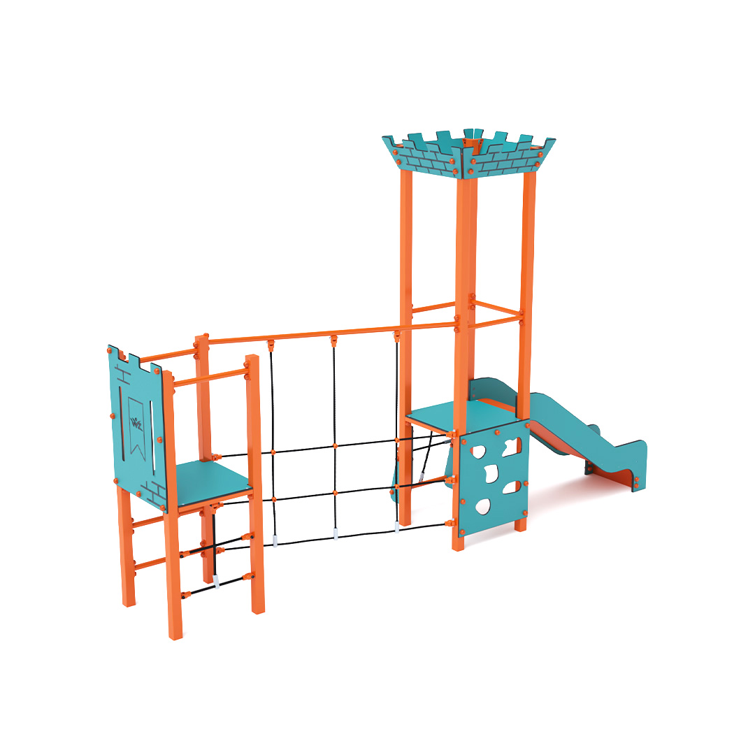 Dvouvěžová kombinovaná sestava mini. Věže jsou propojeny diagonálním lanovým mostem. Na sestavu děti vylezou po kolmém lanovém výstupu, kolmém žebříkovém výstupu, kolmém lezeckém výstupu, šikmém lanovém výstupu, schodišťovém výstupu a dolů se mohou spustit po skluzavce. Tyrkysovo-oranžový design láká ke hře již z dálky. Ocelová konstrukce je odolná vůči povětrnostním vlivům díky žárovému zinkování a lakování odolnou práškovou barvou. Použitý HPL materiál je chemicky odolný, odolný vůči UV záření – stálobarevný, netoxický, recyklovatelný a nelámavý. Není riziko poranění dětí ostrými hranami nebo úlomky. Všechny spoje jsou nerezové a zakryté plastovými krytkami pro zvýšení životnosti a bezpečnosti.