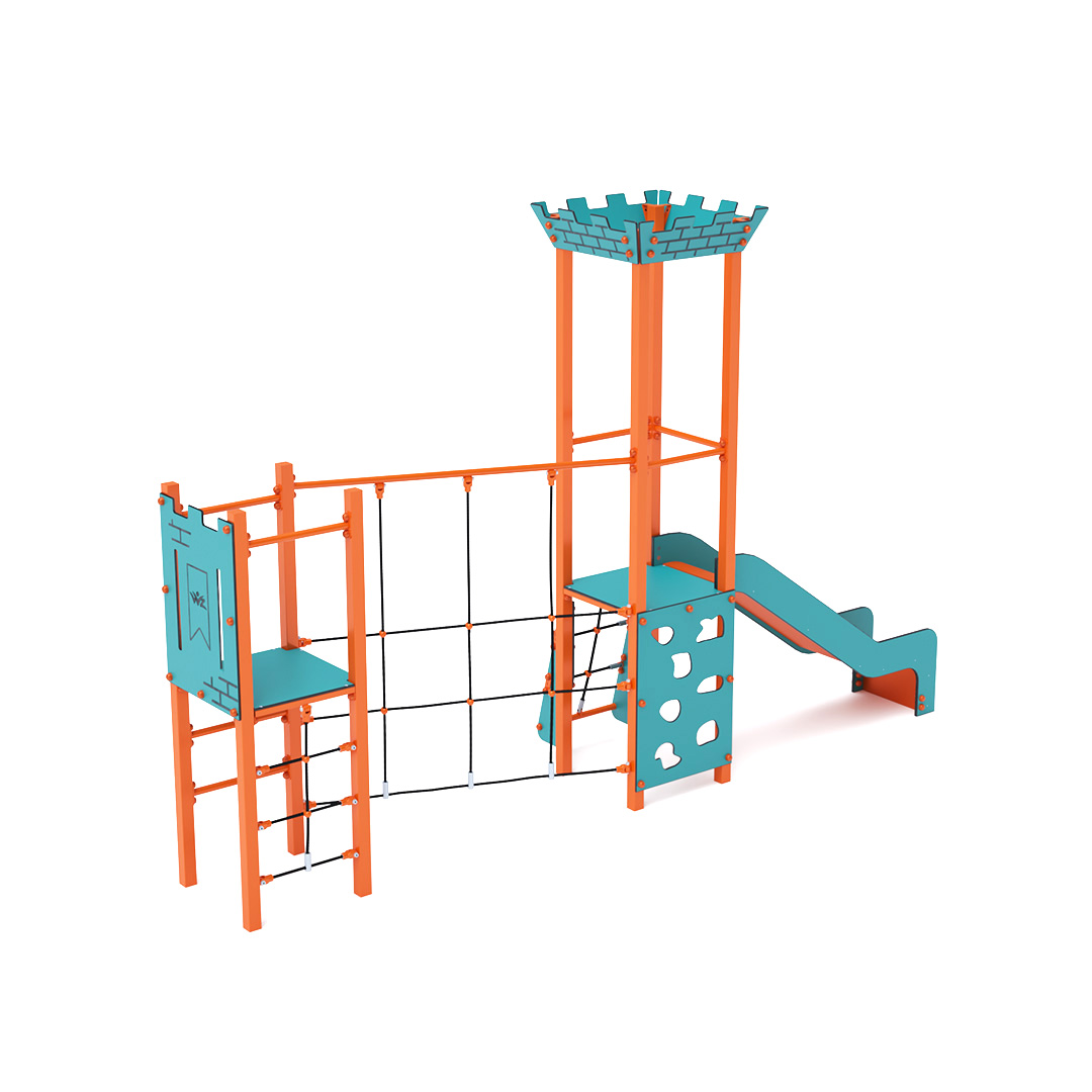 Dvojvěžová kombinovaná sestava mini. Věže jsou propojeny diagonálním lanovým mostem. Na sestavu děti vylezou po kolmém lanovém výstupu, kolmém žebřinovém výstupu, kolmém lezeckém výstupu, šikmém lanovém výstupu a schodišťovém výstupu. Dolů se mohou sklouznout po skluzavce. Tyrkysovo-oranžový design láká ke hře už z dálky. Ocelová konstrukce je odolná vůči povětrnostním vlivům díky žárovému zinkování a lakování odolnou práškovou barvou. Použitý HPL materiál je chemicky odolný, odolný vůči UV záření – stálobarevný, netoxický, recyklovatelný a nelámavý. Nevzniká tak riziko poranění dětí ostrými hranami nebo úlomky. Všechny spoje jsou z nerezové oceli a zakryté plastovými krytkami pro zvýšení životnosti a bezpečnosti.