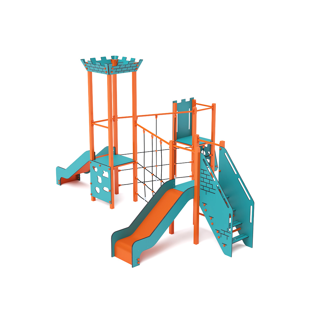 Třívěžová kombinovaná sestava mini. Dvě nízké věže jsou propojeny dvěma diagonálními lanovými mosty s věží s cimbuřím. Na sestavu děti vylezou po šikmém lezeckém výstupu, schodišťovém výstupu, kolmém lezeckém výstupu a dolů se mohou sklouznout po dvou skluzavkách. Tyrkysovo-oranžový design láká ke hře už z dálky. Ocelová konstrukce je odolná vůči povětrnostním vlivům díky žárovému zinkování a lakování odolnou práškovou barvou. Použitý HPL materiál je chemicky odolný, odolný vůči UV záření – stálobarevný, netoxický, recyklovatelný a nelámavý. Není tak riziko poranění dětí ostrými hranami nebo úlomky. Všechny spoje jsou nerezové a zakryté plastovými krytkami pro zvýšení životnosti a bezpečnosti.